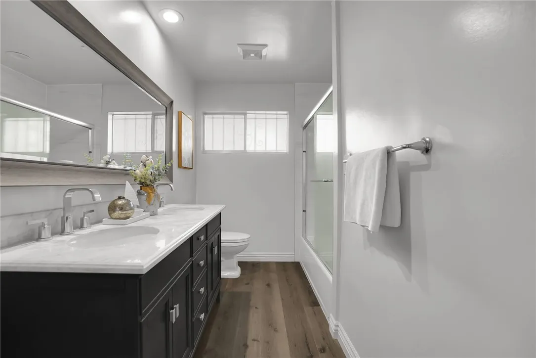 Nestled in a desirable neighborhood, this home offers a spacious and thoughtfully designed layout with newer flooring throughout. The main level welcomes you with breathtaking wide-open views from a wall of windows along the back that open out to a private balcony, and flood the living space with warm, natural light. It also features a primary bedroom suite, along with another full bathroom, updated kitchen, living room, dining area, and a versatile sunroom. The lower level includes two additional bedrooms, plus a fourth bedroom that has been converted into a generous great room complete with a kitchenette, and a private porch space. With its own independent entrance, the downstairs area provides excellent potential for multigenerational living or rental income opportunities. Thoughtfully upgraded with remodeled bathrooms, new flooring, A/C, interior paint, recessed lighting, and balcony/porch decking. Additional highlights include a two-car attached garage, and ample storage space including wine storage. Located within the highly acclaimed Alhambra Unified School District.