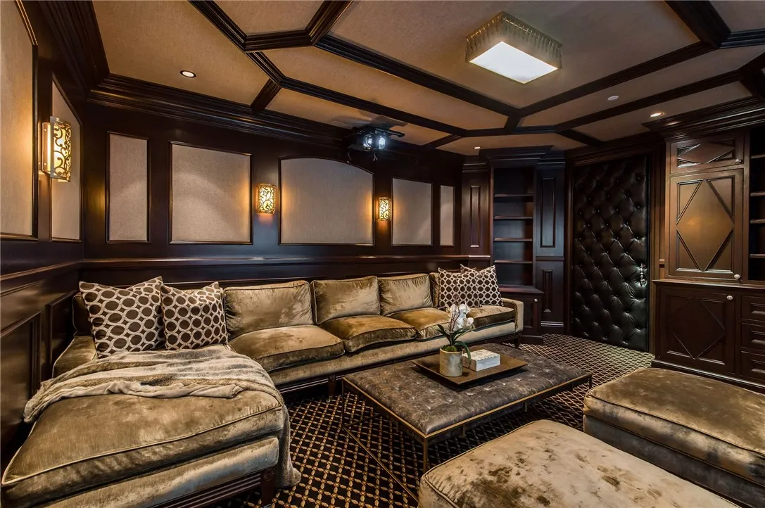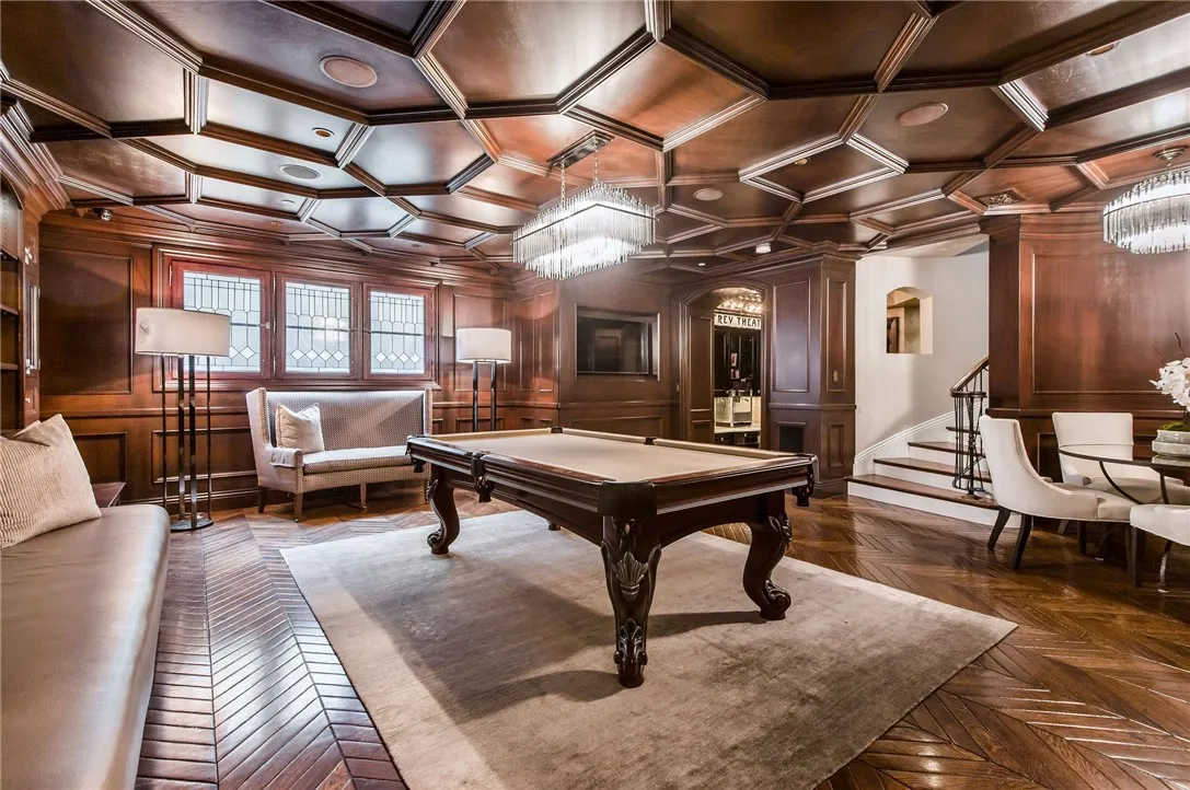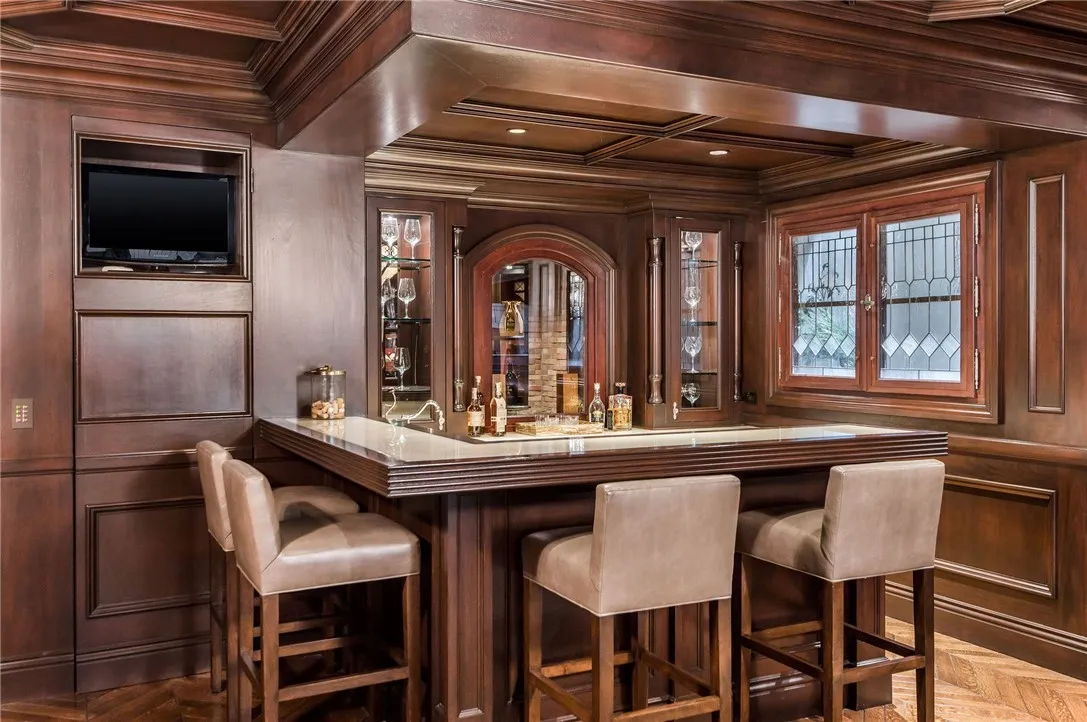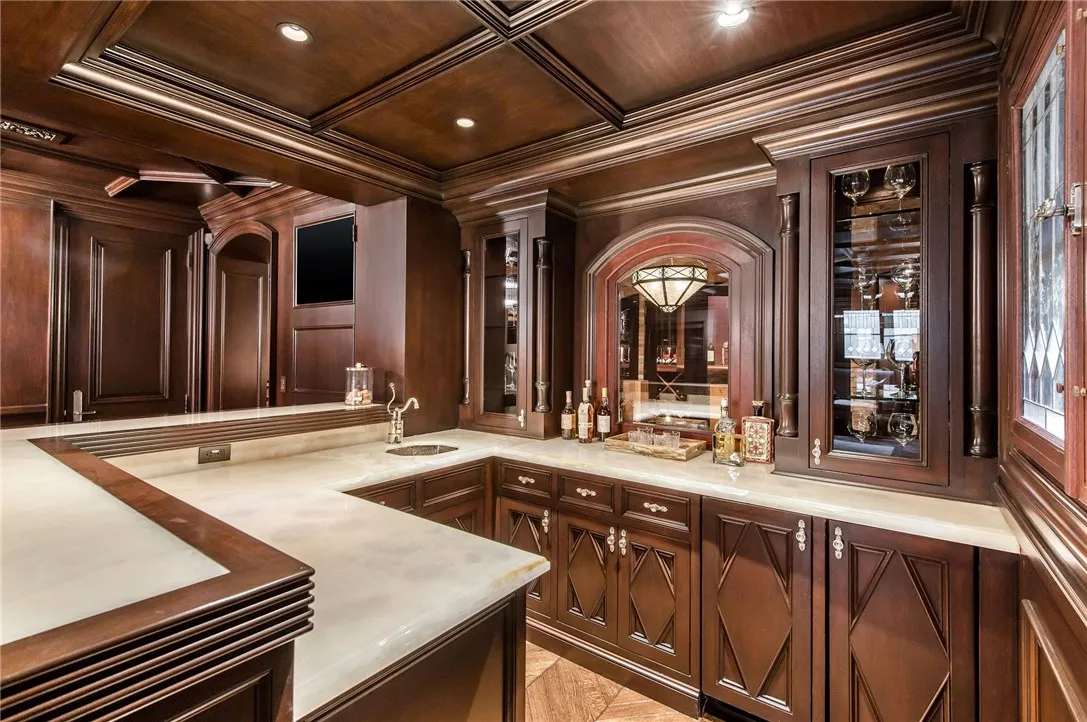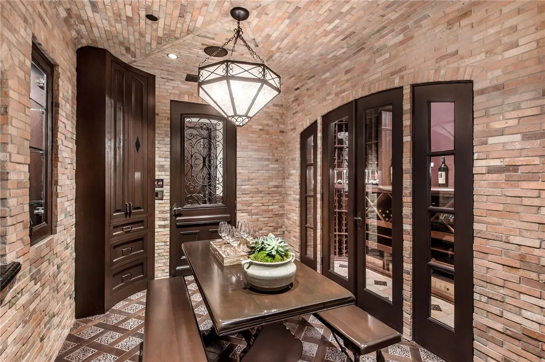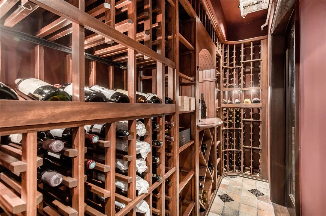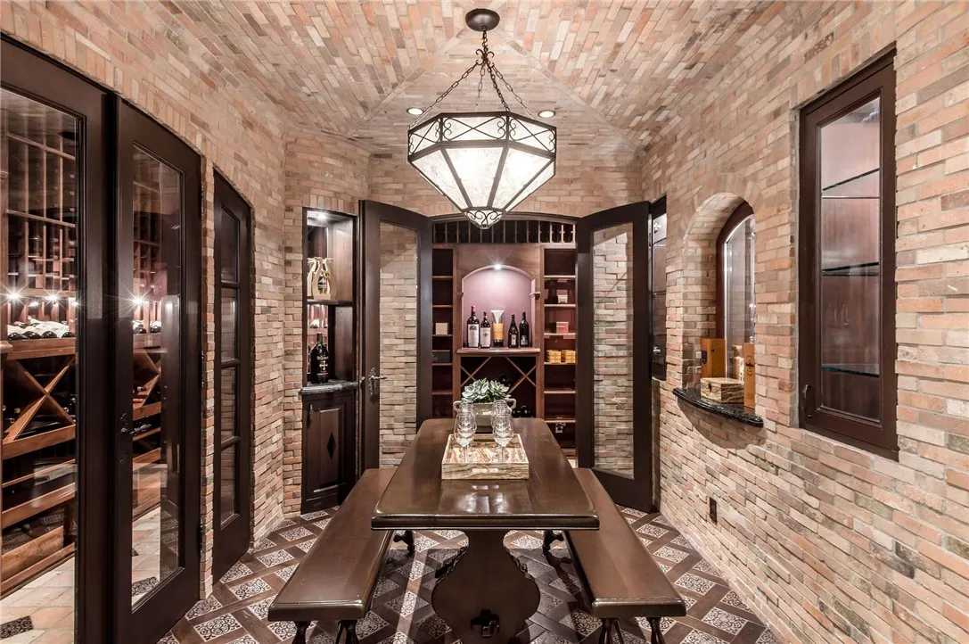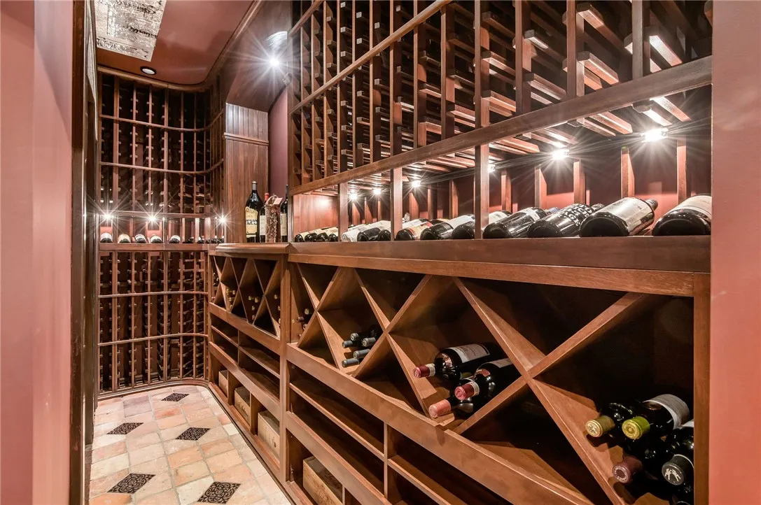The first level includes a billiards room with a coffered ceiling, wet bar, three TV’s, and a built-in humidor cabinet with lighted cigar display. This level also includes a wine cellar with tasting room, a home theater, a guest bedroom, and access to a large garage that can accommodate up to 8 cars with an automated vehicle turntable for ease of parking. The garage has floor-to-ceiling cabinetry, a storage room and a workbench area.
