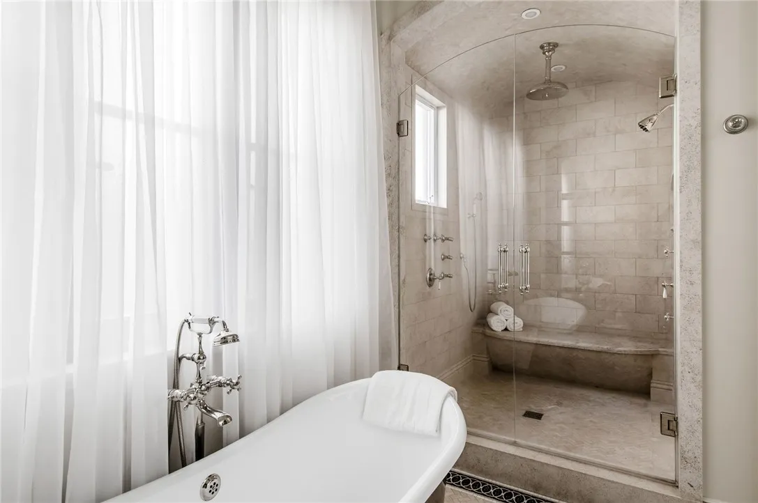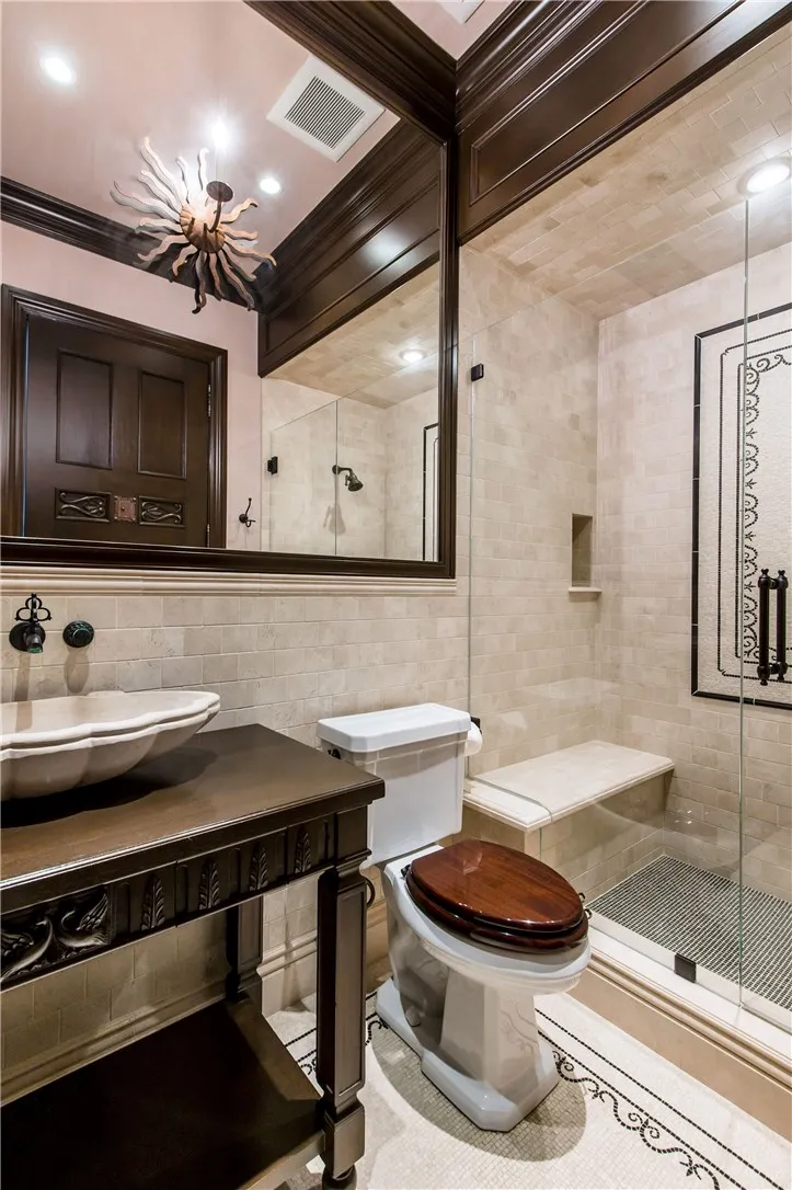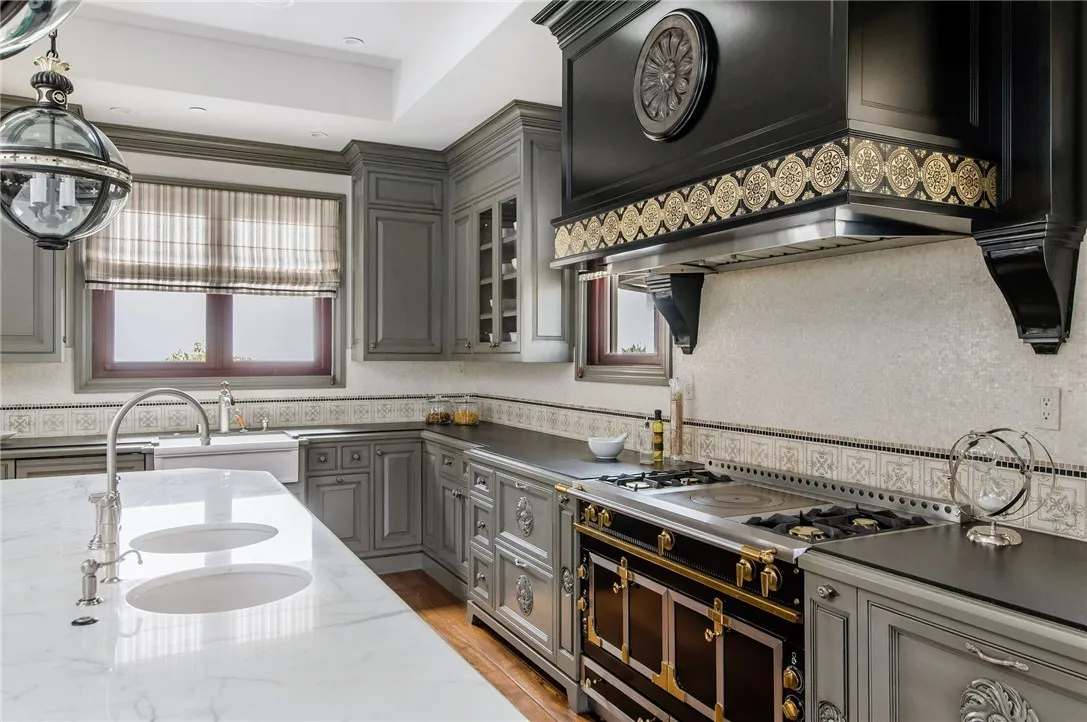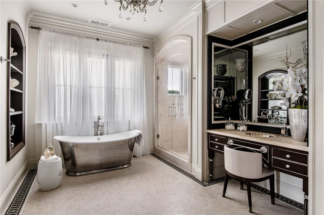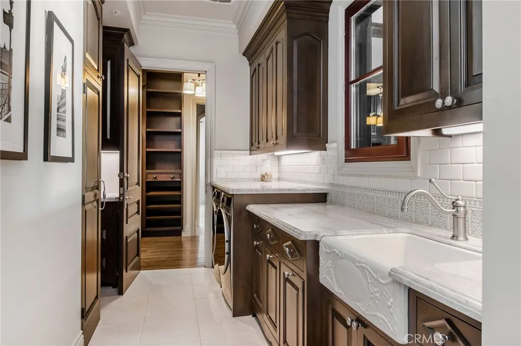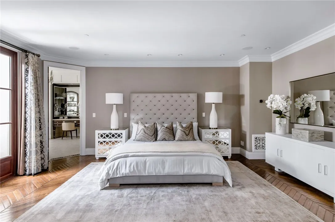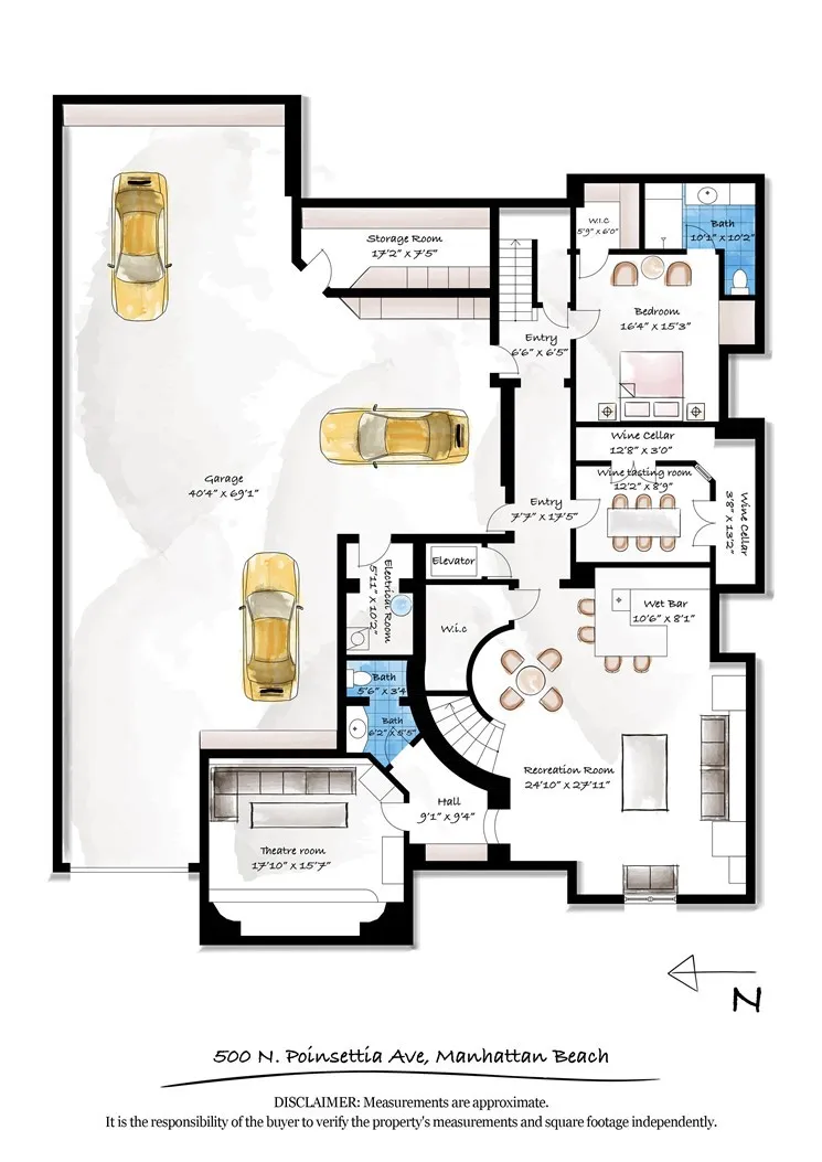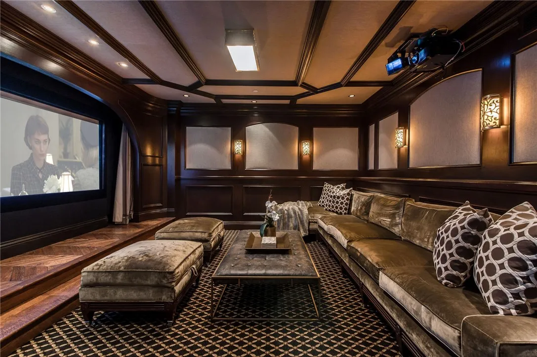 The first level includes a billiards room with a coffered ceiling, wet bar, three TV’s, and a built-in humidor cabinet with lighted cigar display. This level also includes a wine cellar with tasting room, a home theater, a guest bedroom, and access to a large garage that can accommodate up to 8 cars with an automated vehicle turntable for ease of parking. The garage has floor-to-ceiling cabinetry, a storage room and a workbench area.