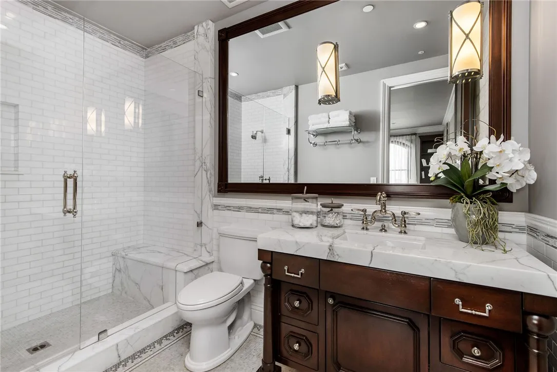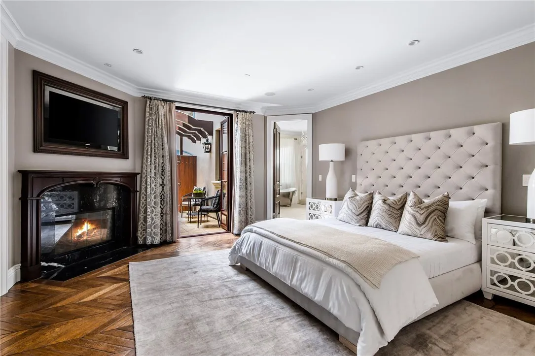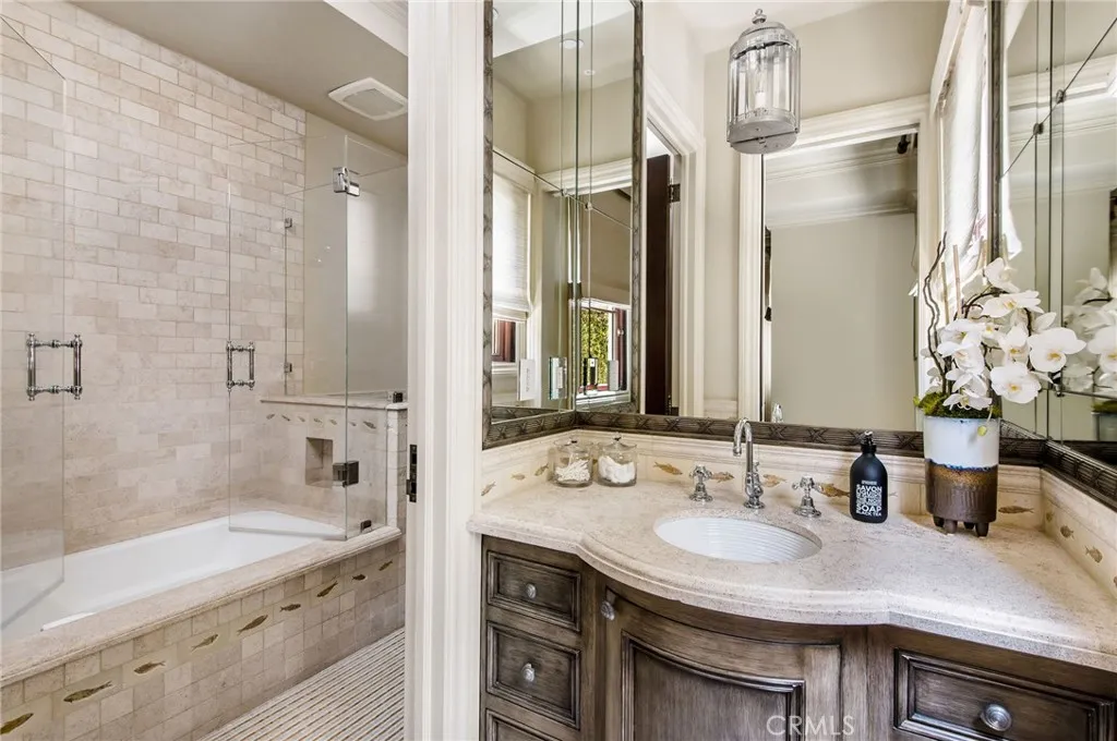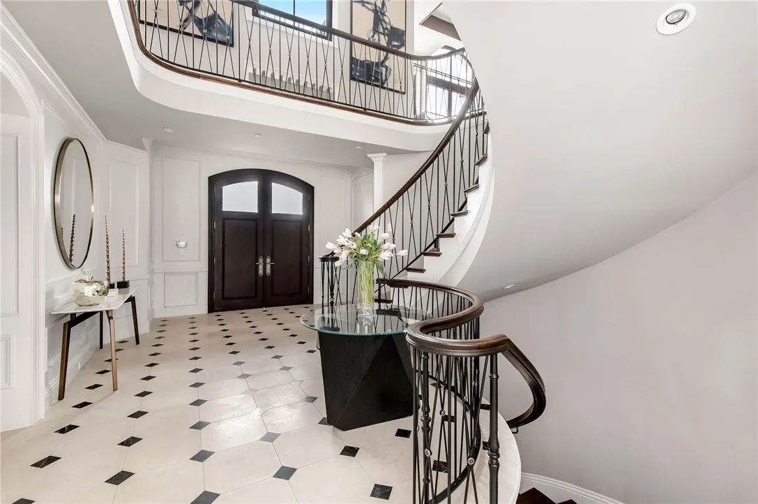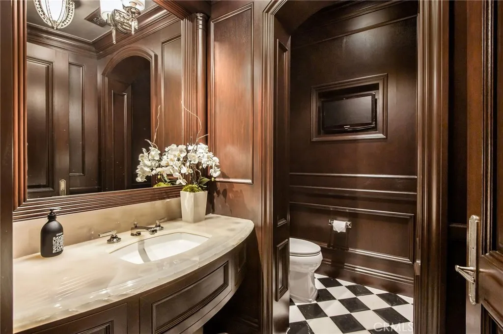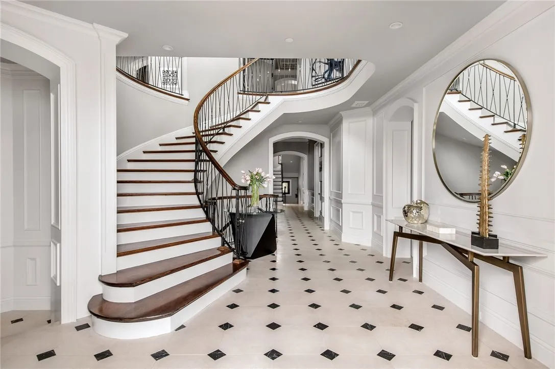 The next level encompasses the main floor with a formal entry, a grand spiral staircase and four bedrooms. The primary suite offers a split-level space with adjoining sitting room, two fireplaces, separate walk-in closets and a private outdoor terrace with a water fountain and gym room. This level also includes a laundry room, a computer alcove, and a family room that opens up to an outdoor pool deck surrounded by lush greenery with a heated, salt-water pool and fountain feature, a spa, outdoor shower, basketball half-court and outdoor fireplace.