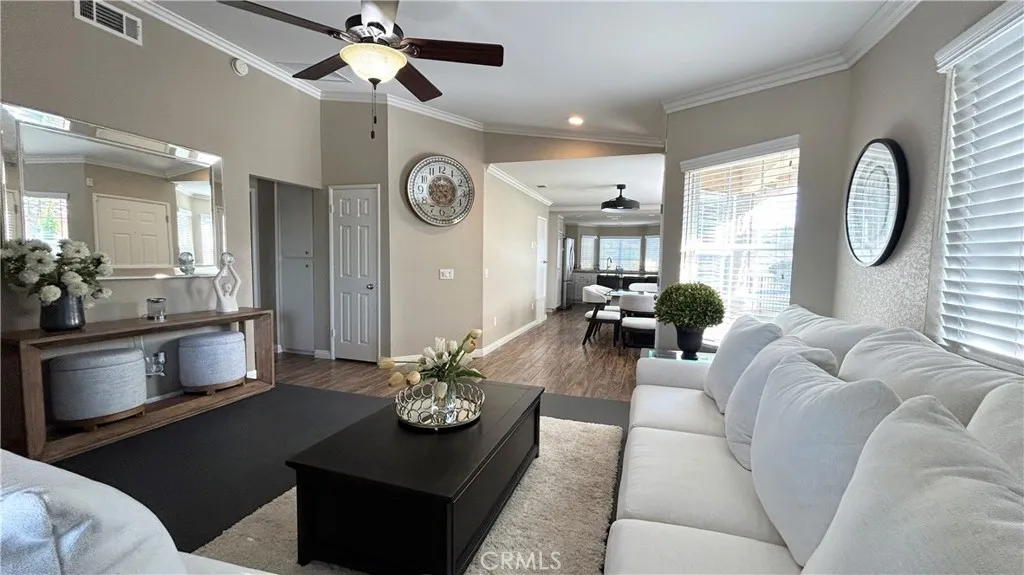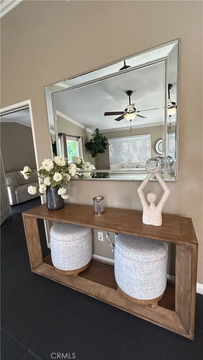Charming Beautiful home!!!! Offers comfortable, single-level with covered back porch and functional indoor-outdoor design. Turn key recently remodeled home. Kitchen with granite counters, tile floors throughout, remodeled walk-in shower, 2 bedrooms and 2 bath home on a good size elevated lot with fantastic views from rear yard. Indoor-Oudoor Flow, Living spaces flow directly onto rear yard, ideal for grilling or viewing nature. One of the largest flat private back yard in the community with many fruit trees ready to enjoy the oranges, avocados, figs & lemons. Community pool, spa, tennis courts, pickleball, barbecue, picnic area, gym and community center to enjoy for your special events.