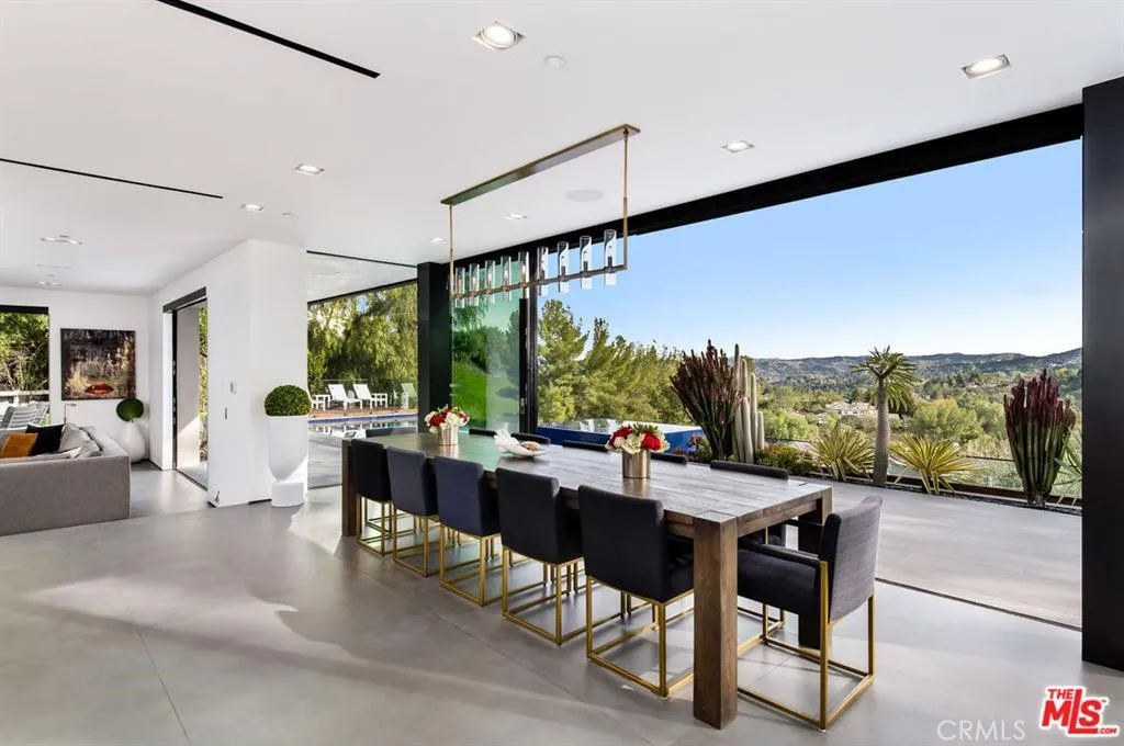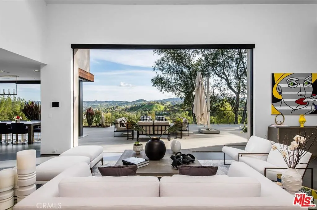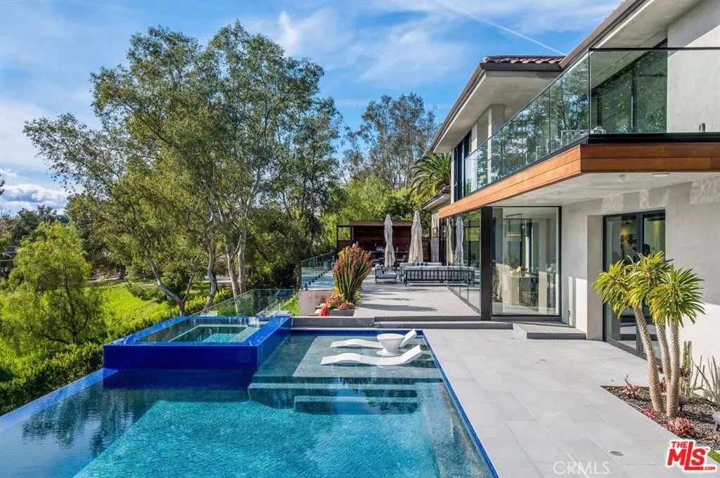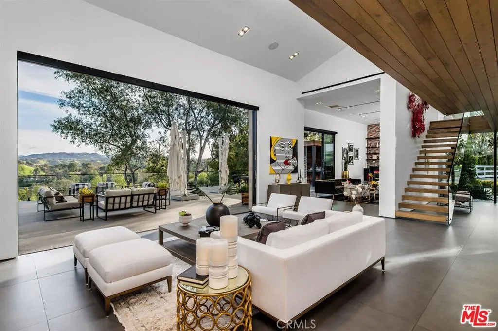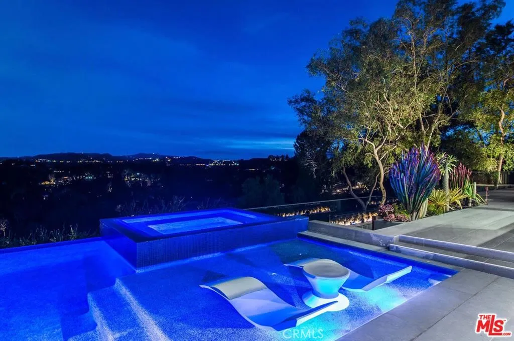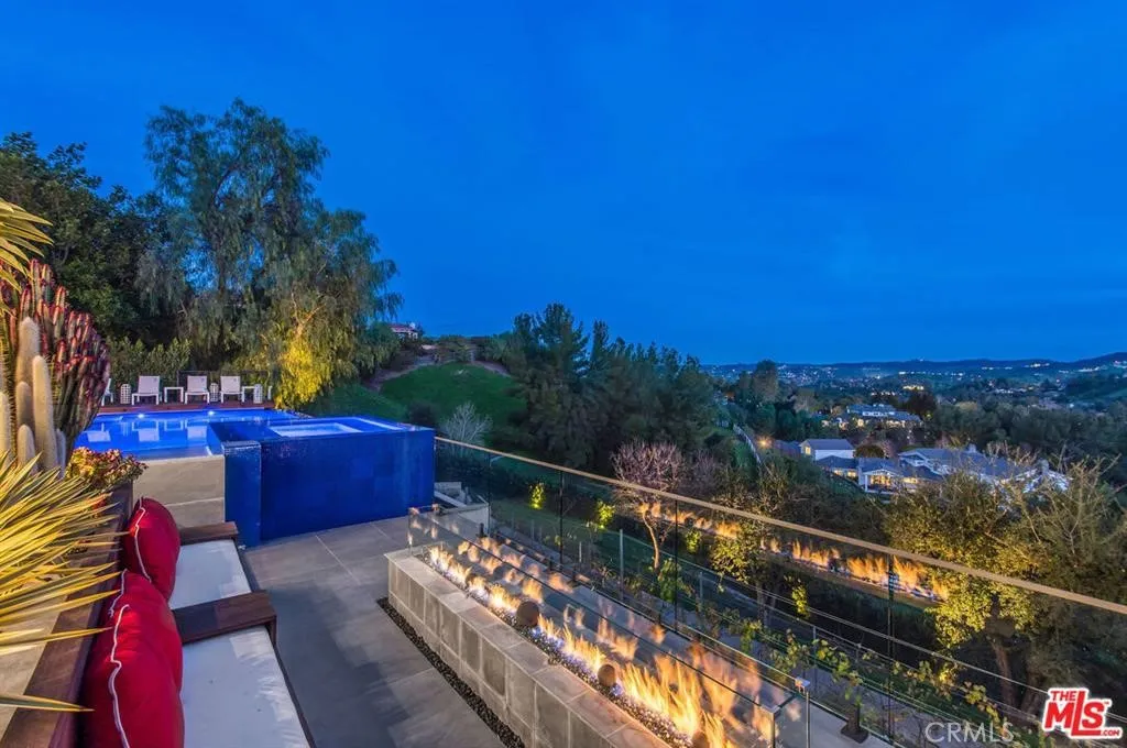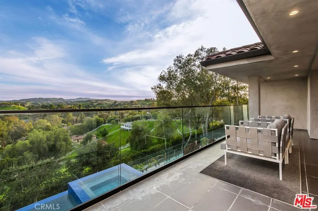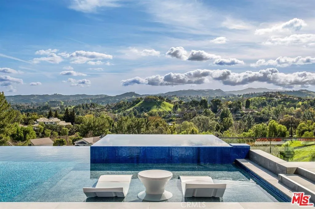 The Glass House — a design masterpiece with sweeping, unobstructed views across rolling hills to distant mountains. Set on just over an acre in premier, gated Hidden Hills, this 7,000± sq ft modern estate offers 5 bedrooms plus a private office and 6 baths, crafted for effortless Southern California indoor-outdoor living and ultimate privacy. Flooded with natural light behind an 18-foot glass wall and dramatic pivot entry, interiors showcase soaring ceilings, polished Italian floors, a sculptural floating staircase and top-tier finishes: three kitchens (the main with oversized eat-in island), imported marble, Italian cabinetry, Miele appliances, Waterford faucets, Porcelanosa baths and full Fleetwood windows/doors that disappear to the resort-caliber backyard. The upper-level primary suite is a serene retreat with a private balcony, spa-like bath and boutique his-and-hers walk-in closets. Outside, entertain in a dramatic setting with an infinity-edge pool and Baja shelf, floating spa, sunken open-air fireplace, fully equipped outdoor kitchen, bar and Fisher & Paykel BBQ area — all framed by mature palms and panoramic vistas. Additional highlights: guarded community entry plus private gated driveway, ample parking, three-car garage, anodized glass paneling, 8-zone Mitsubishi HVAC, dual tankless water heaters and meticulous landscaping. Minutes from The Commons at Calabasas and Woodland Hills, this residence blends turnkey luxury with unrivaled privacy and view-driven drama.