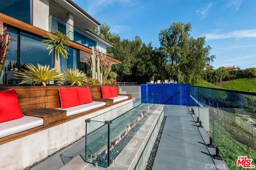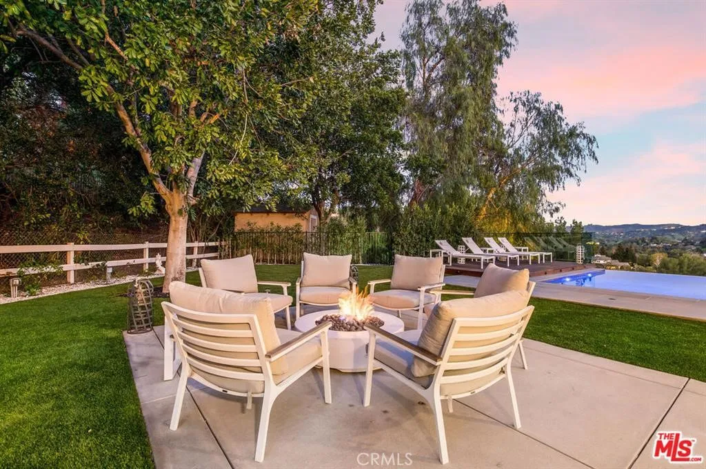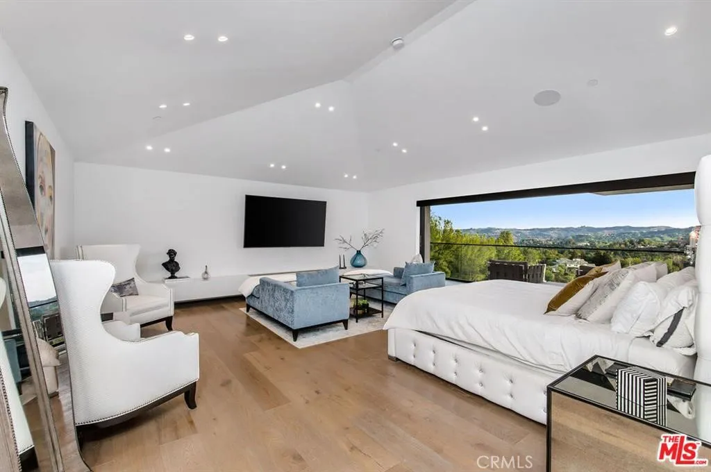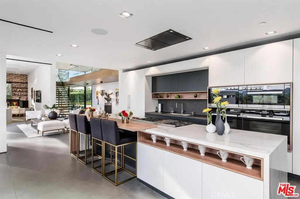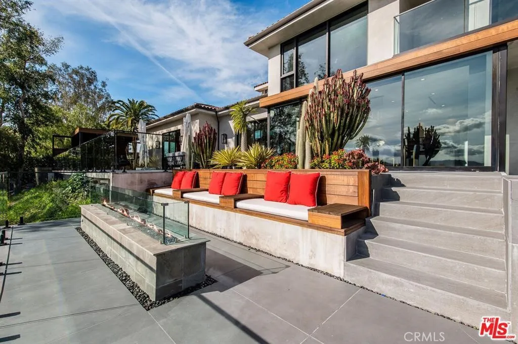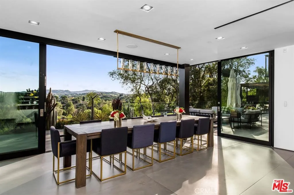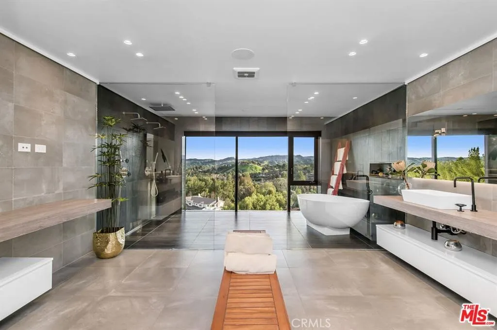 The Glass House — a design masterpiece with sweeping, unobstructed views across rolling hills to distant mountains. Set on just over an acre in premier, gated Hidden Hills, this 7,000± sq ft modern estate offers 5 bedrooms plus a private office and 6 baths, crafted for effortless Southern California indoor-outdoor living and ultimate privacy. Flooded with natural light behind an 18-foot glass wall and dramatic pivot entry, interiors showcase soaring ceilings, polished Italian floors, a sculptural floating staircase and top-tier finishes: three kitchens (the main with oversized eat-in island), imported marble, Italian cabinetry, Miele appliances, Waterford faucets, Porcelanosa baths and full Fleetwood windows/doors that disappear to the resort-caliber backyard. The upper-level primary suite is a serene retreat with a private balcony, spa-like bath and boutique his-and-hers walk-in closets. Outside, entertain in a dramatic setting with an infinity-edge pool and Baja shelf, floating spa, sunken open-air fireplace, fully equipped outdoor kitchen, bar and Fisher & Paykel BBQ area — all framed by mature palms and panoramic vistas. Additional highlights: guarded community entry plus private gated driveway, ample parking, three-car garage, anodized glass paneling, 8-zone Mitsubishi HVAC, dual tankless water heaters and meticulous landscaping. Minutes from The Commons at Calabasas and Woodland Hills, this residence blends turnkey luxury with unrivaled privacy and view-driven drama.
