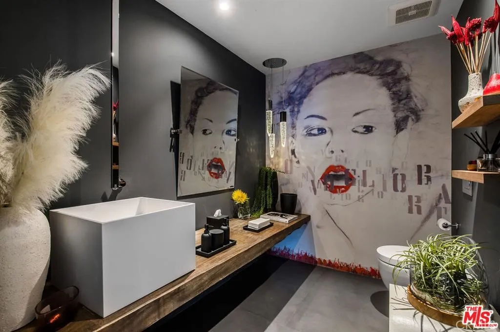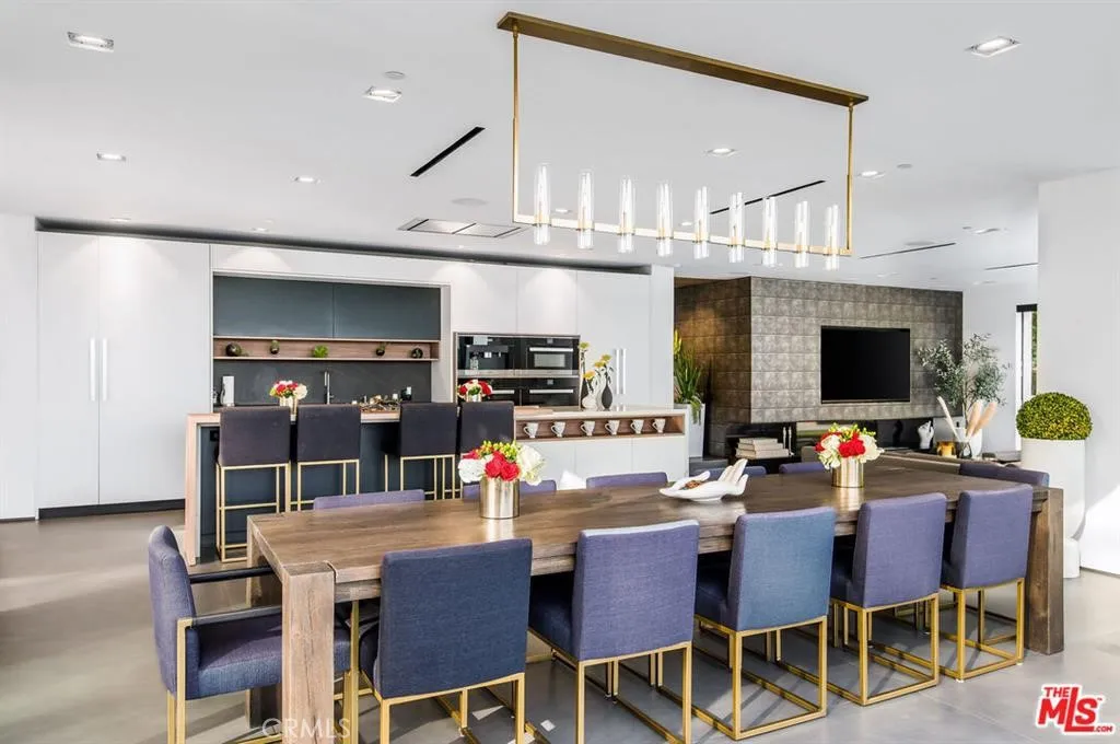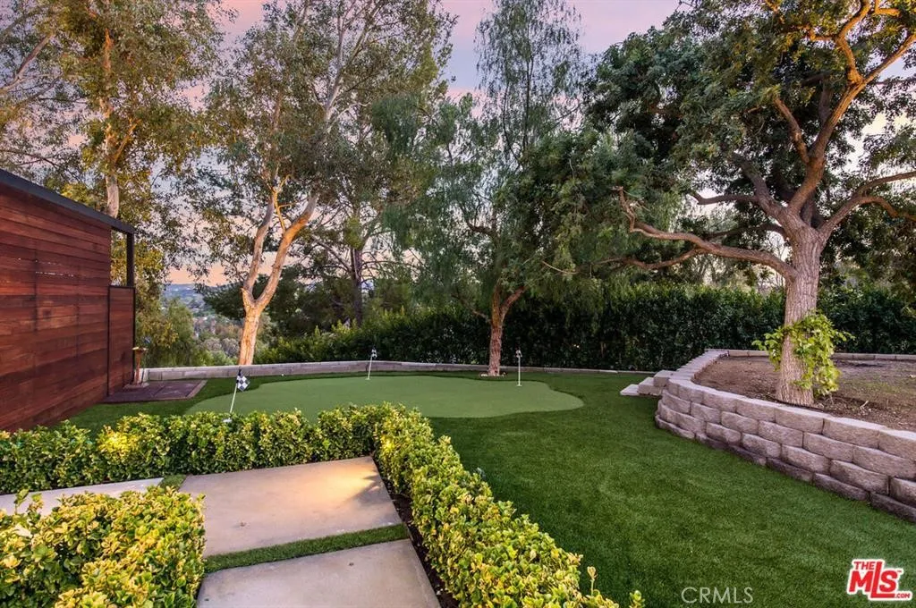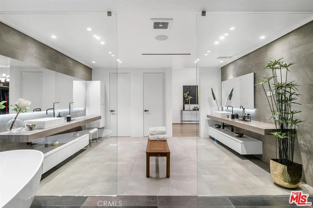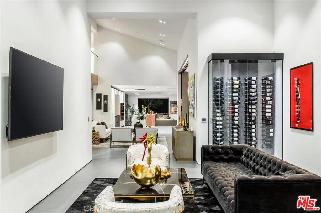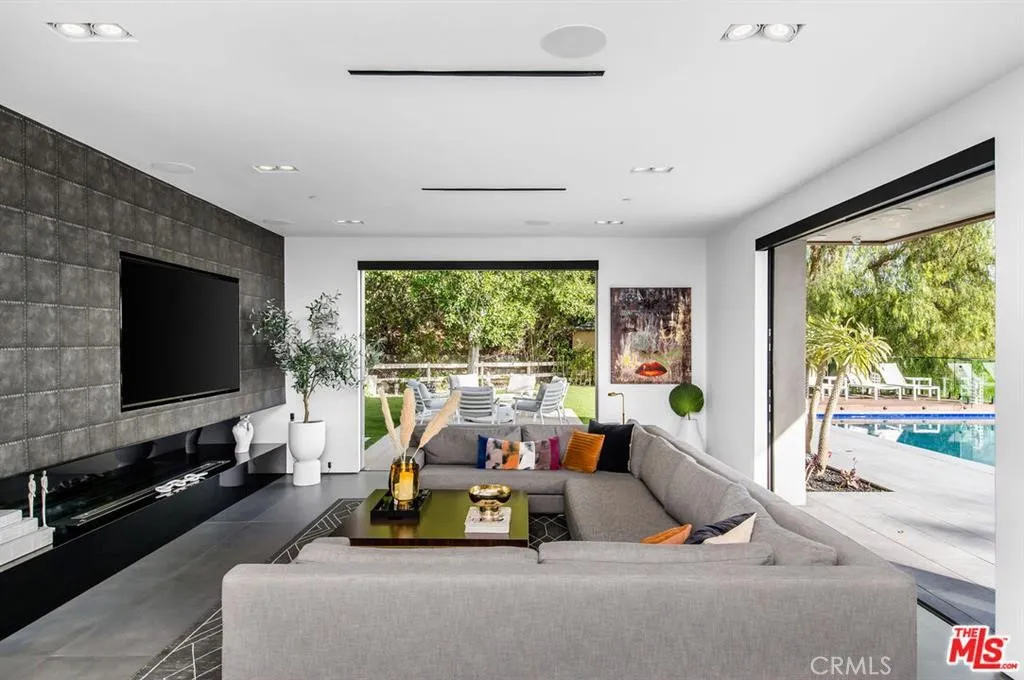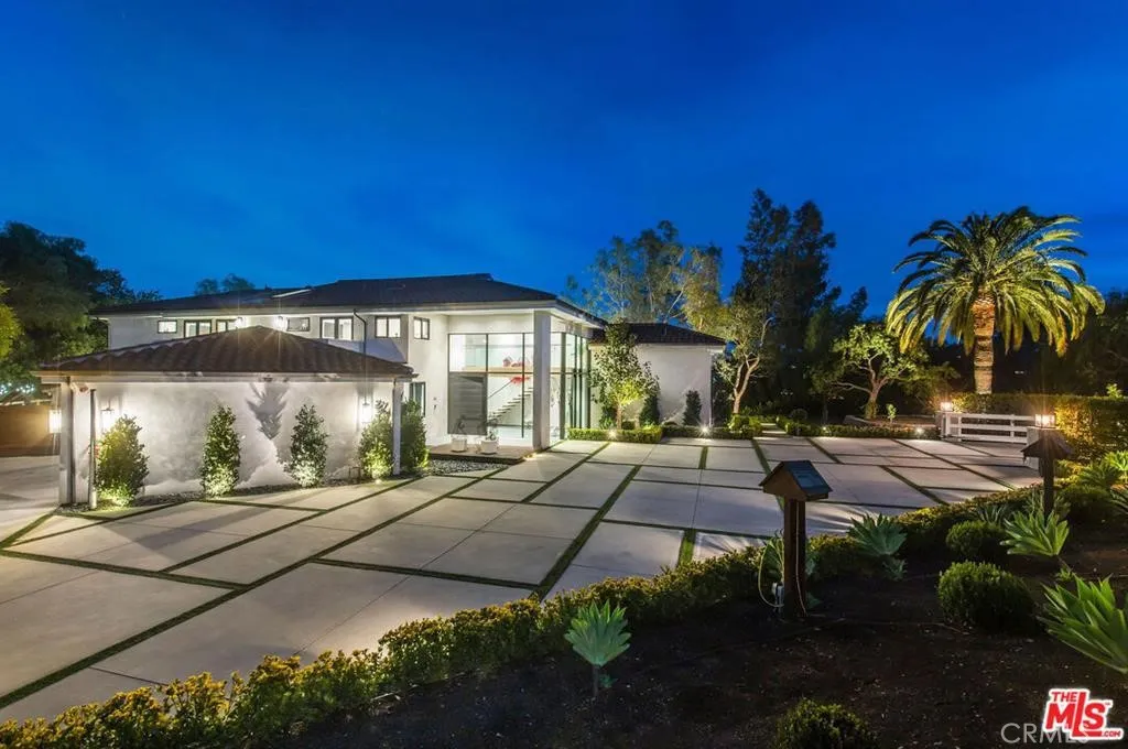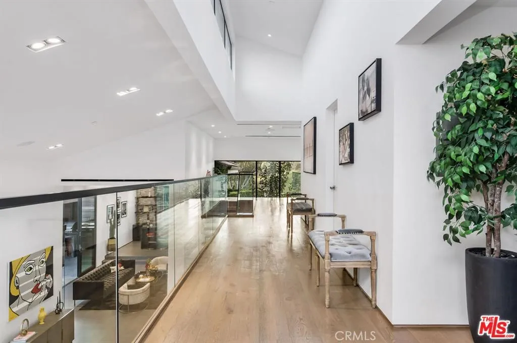 The Glass House — a design masterpiece with sweeping, unobstructed views across rolling hills to distant mountains. Set on just over an acre in premier, gated Hidden Hills, this 7,000± sq ft modern estate offers 5 bedrooms plus a private office and 6 baths, crafted for effortless Southern California indoor-outdoor living and ultimate privacy. Flooded with natural light behind an 18-foot glass wall and dramatic pivot entry, interiors showcase soaring ceilings, polished Italian floors, a sculptural floating staircase and top-tier finishes: three kitchens (the main with oversized eat-in island), imported marble, Italian cabinetry, Miele appliances, Waterford faucets, Porcelanosa baths and full Fleetwood windows/doors that disappear to the resort-caliber backyard. The upper-level primary suite is a serene retreat with a private balcony, spa-like bath and boutique his-and-hers walk-in closets. Outside, entertain in a dramatic setting with an infinity-edge pool and Baja shelf, floating spa, sunken open-air fireplace, fully equipped outdoor kitchen, bar and Fisher & Paykel BBQ area — all framed by mature palms and panoramic vistas. Additional highlights: guarded community entry plus private gated driveway, ample parking, three-car garage, anodized glass paneling, 8-zone Mitsubishi HVAC, dual tankless water heaters and meticulous landscaping. Minutes from The Commons at Calabasas and Woodland Hills, this residence blends turnkey luxury with unrivaled privacy and view-driven drama.