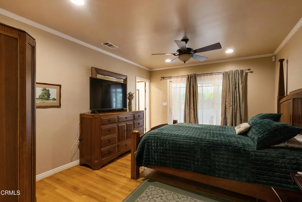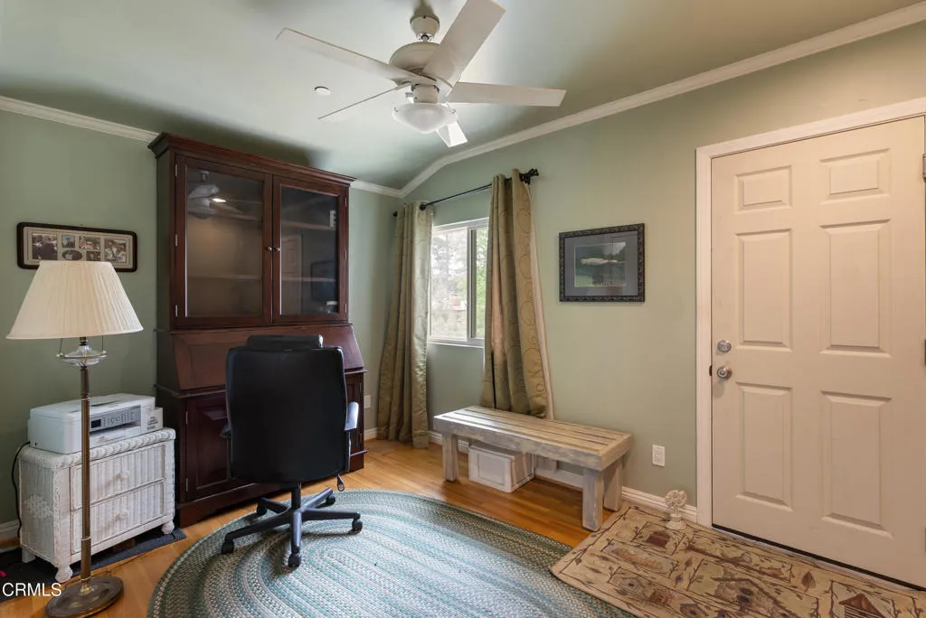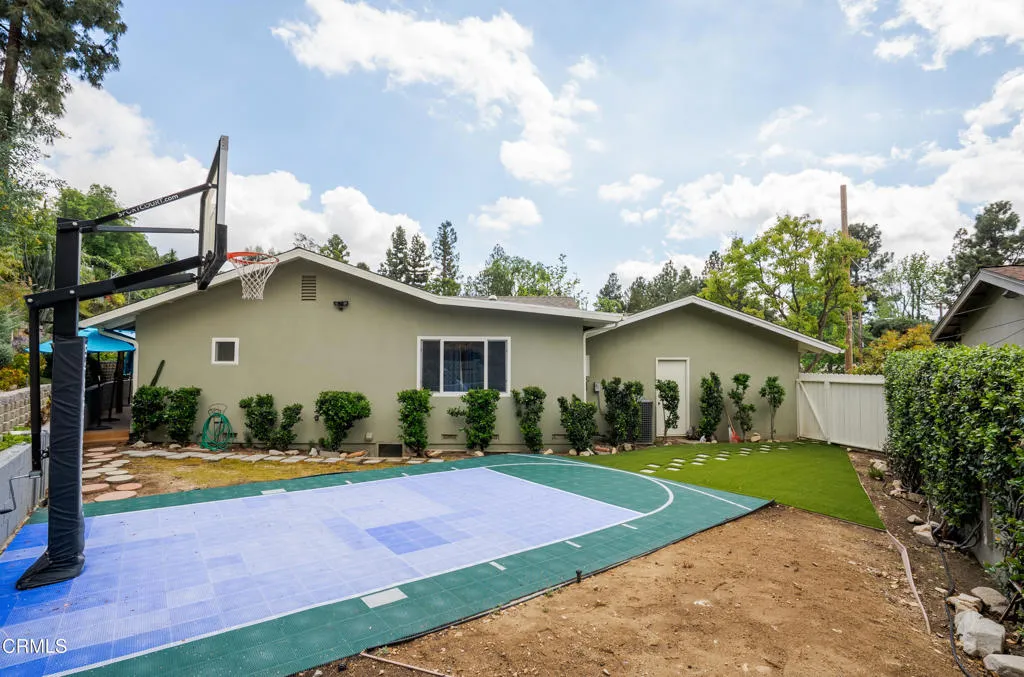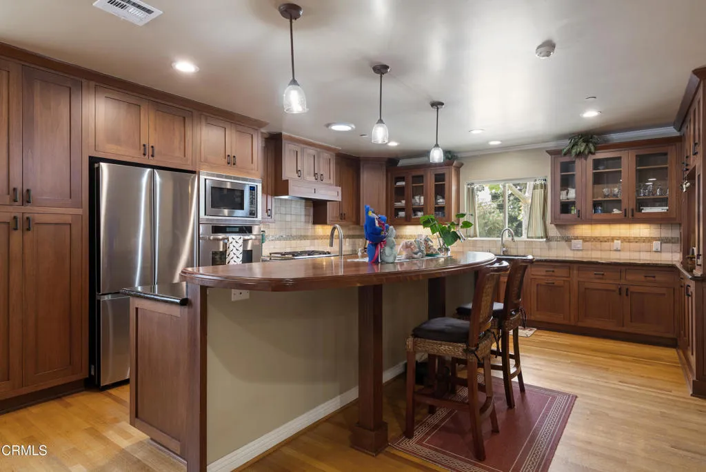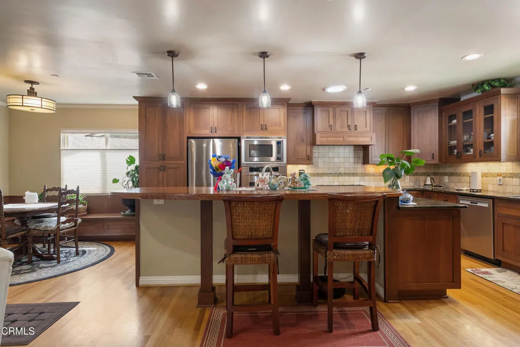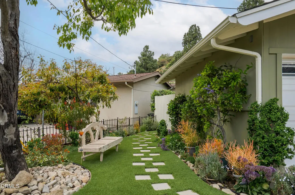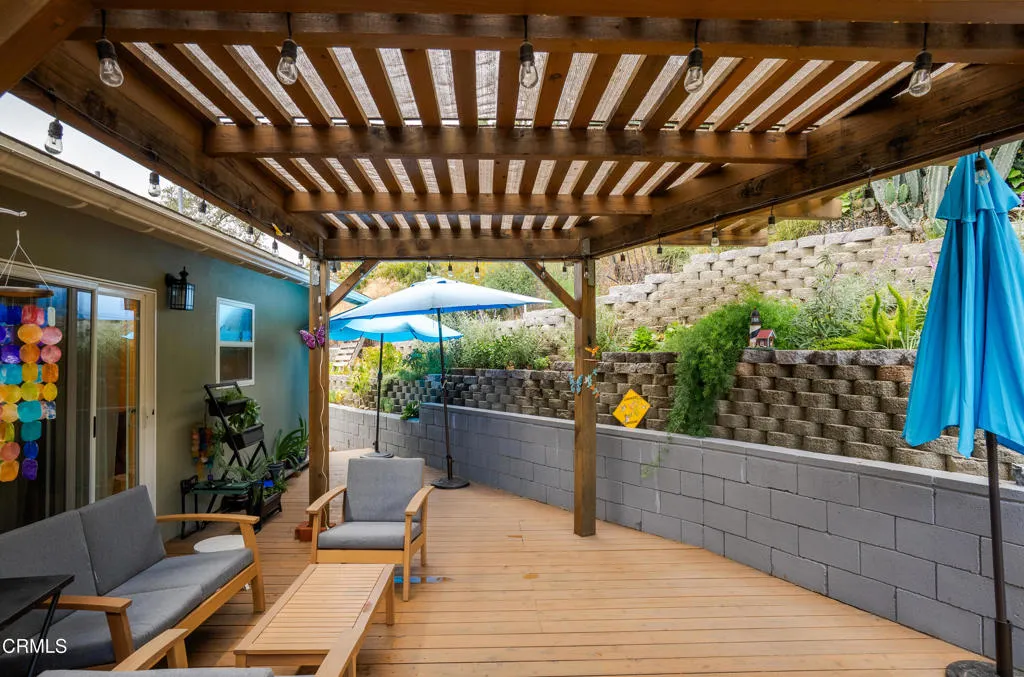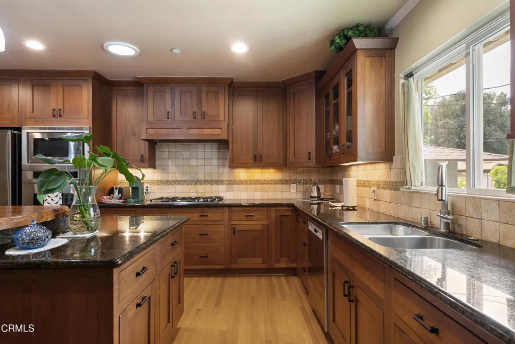 Welcome to 5015 Verwood Avenue where timeless charm meets practical sophistication in one of La Crescenta’s most coveted neighborhoods. This exceptional home, on a tree-lined, cul-de-sac street, offers about 2,055 square feet on a 7,529 square foot lot. Step into the spacious living room with built-in cabinets in the entry, hard wood floors and a sliding French door that opens to the beautiful covered, wood deck. The living room features include a cozy fireplace and built-in cabinets on each side. The kitchen is open to the living room and dining area creating a large open great room. The gourmet kitchen boasts custom wood cabinetry, stainless steel appliances including a 28 bottle wine cooler. The island bar seating is great with a utility sink and cabinets. The dining nook has built in bench seating and storage too. Flowing through the kitchen is the family/media room with another sliding French door that opens to the deck. Toward the west of the living room is a hallway that leads to the three bedrooms. In the hallway is a large laundry closet for a side by side washer and dryer and there’s built in cabinets and a utility sink. To the right is the primary suite with another sliding French door open to the deck and a good sized bathroom and large walk in closet with built in shelving. To the left of the hallway is a bedroom that has a man door that opens to the attached garage. The guest bathroom offers a dual sink, recessed lights, a hydro system bathtub, skylight and storage. At the end of the hall is the guest bedroom. The home has a fire sprinkler system, two tankless water heaters, central air and heat and a brand new roof installed approximately 2 years ago. The front yard is beautifully landscaped with good quality artificial turf and tasteful plants and flowers. The backyard has a redwood deck and patio cover and is also beautifully landscaped.