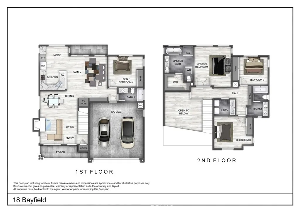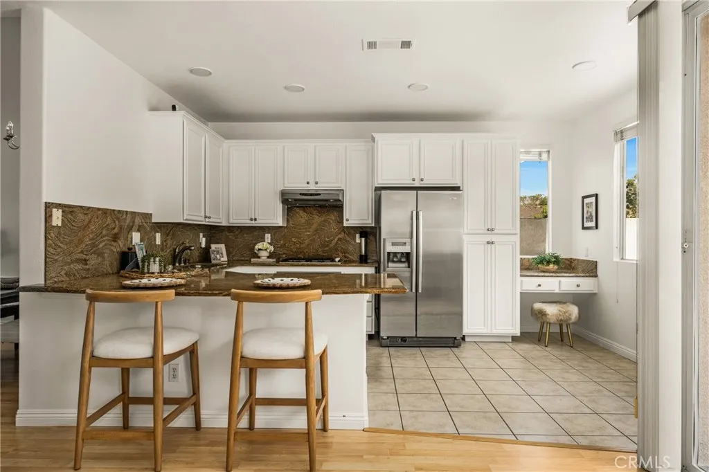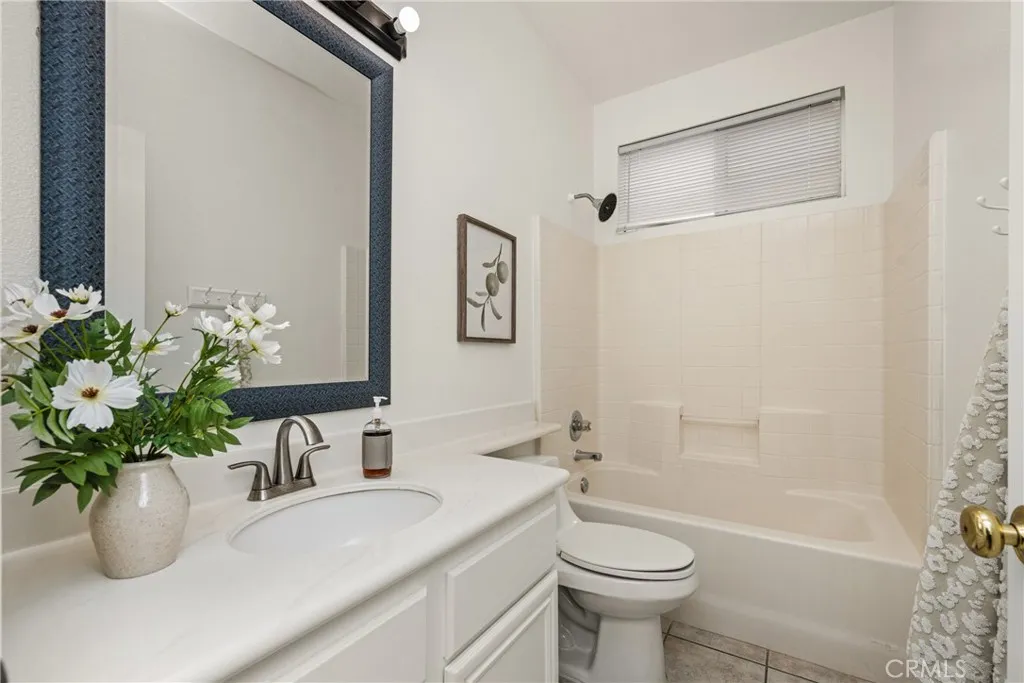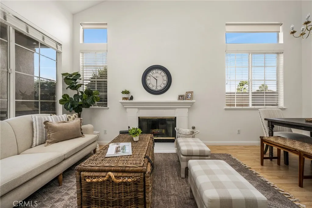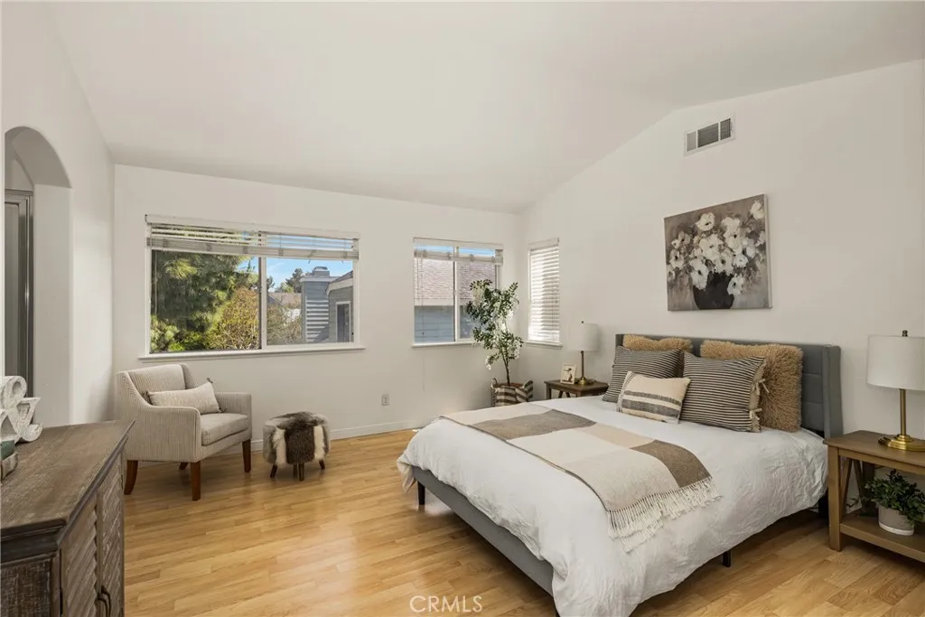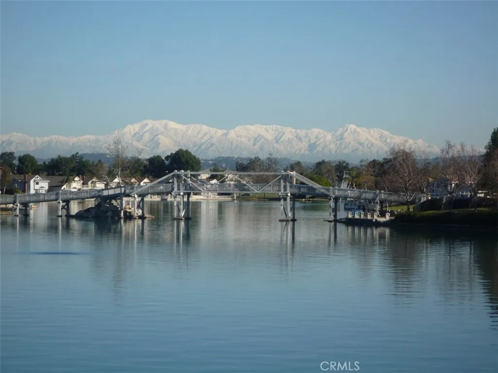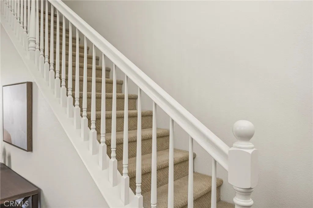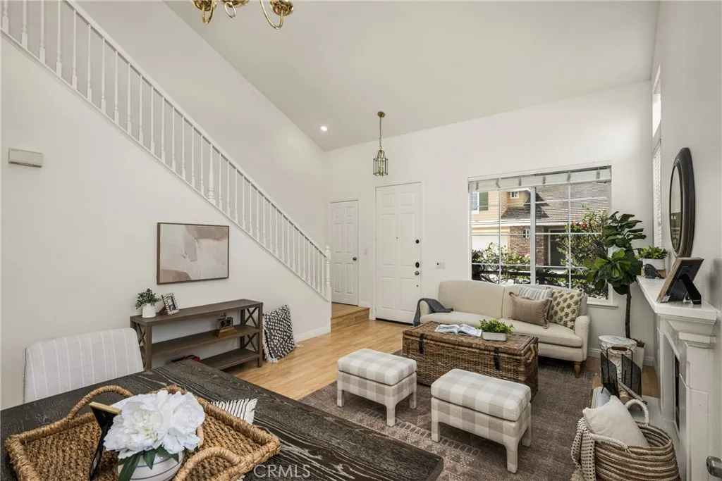 Situated on a quiet street in Woodbridge, 18 Bayfield is one of just 9 homes built in 1999 in the exclusive cul-de-sac enclave of South Lake Villas. Located approximately 600 feet from South Lake, the home offers immediate access to one of the community’s most desirable settings. The property features 4 bedrooms and 3 bathrooms with 1,875 square feet of living space on a 3,522 square foot lot. From the front porch, the entry opens to a spacious living room with vaulted ceilings, upper windows, and a staircase with wood handrail. Natural light fills the space, with gleaming laminate flooring running throughout the home. A fireplace anchors the room, which flows into a dining area located between the living room and kitchen. At the rear of the home, the kitchen includes white shaker-style cabinets, granite countertops with full backsplash, and stainless steel appliances including a gas range with hood, built-in microwave, and dishwasher. A peninsula with bar seating connects the kitchen to the family room, where sliding glass doors open directly to the backyard. A main-level bedroom and nearby full bathroom with bathtub/shower combo are ideal for guests, a home office, or extended living. Upstairs, the primary suite is located at the rear and features vaulted ceilings, a large walk-in closet, multiple windows, and a peek-a-boo view of South Lake. The primary bathroom includes dual sinks, a soaking tub, and a walk-in shower with glass enclosure. Secondary bedrooms also have vaulted ceilings, large windows, and mirrored closet doors. The upstairs hall bathroom includes a tub/shower combo. The backyard is fully finished with hardscape, along with planter areas and mature landscaping. It’s clean, functional, and easy to maintain, and offers privacy. Additional features include an upstairs interior laundry room with a sink and an abundance of cabinetry, ceiling fans, recessed lighting and a two-car attached garage with direct access. There is plenty of guest parking. Residents enjoy access to Woodbridge’s resort-style amenities including the South Lake lagoon, 22 pools and spas, 24 tennis courts, 12 pickleball courts, volleyball courts, splash pads, playgrounds, and dozens of parks and walking trails. With a low tax rate and low HOA, the home also offers strong overall value. No Mello-Roos.