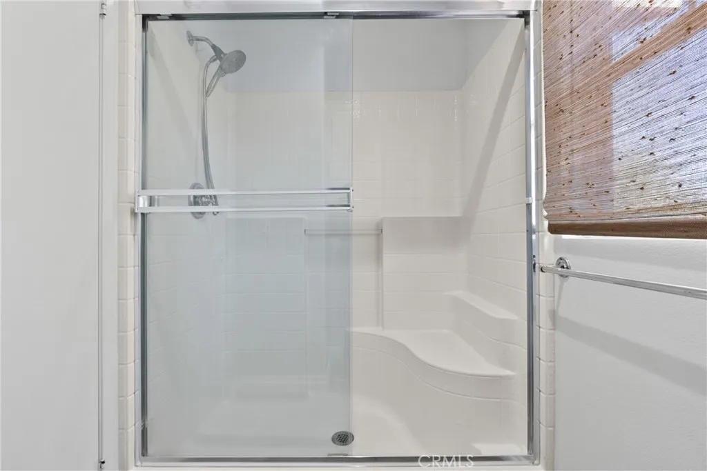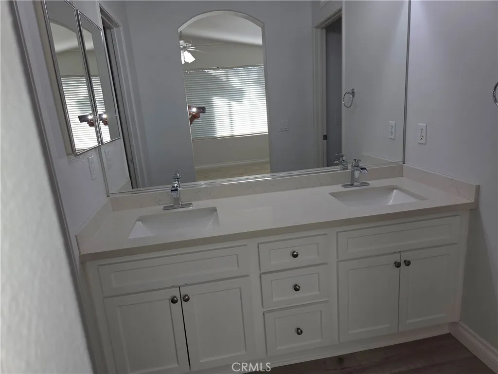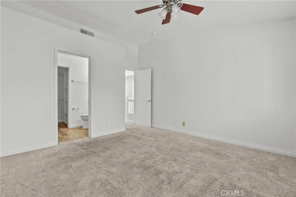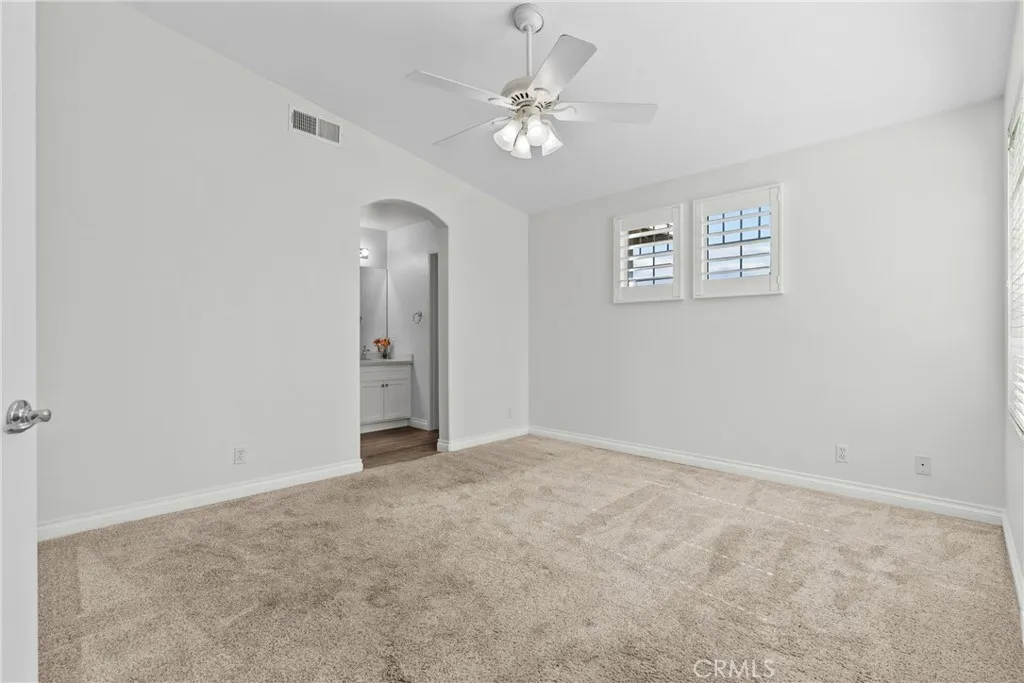 The en suite second bedroom with full bathroom , ceiling fan and plenty of light.