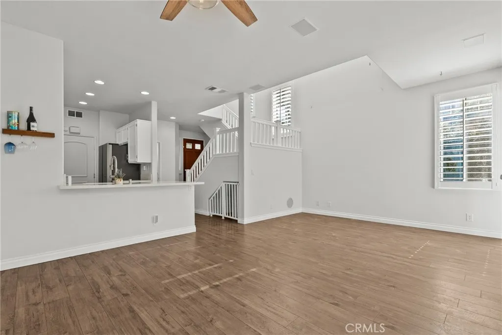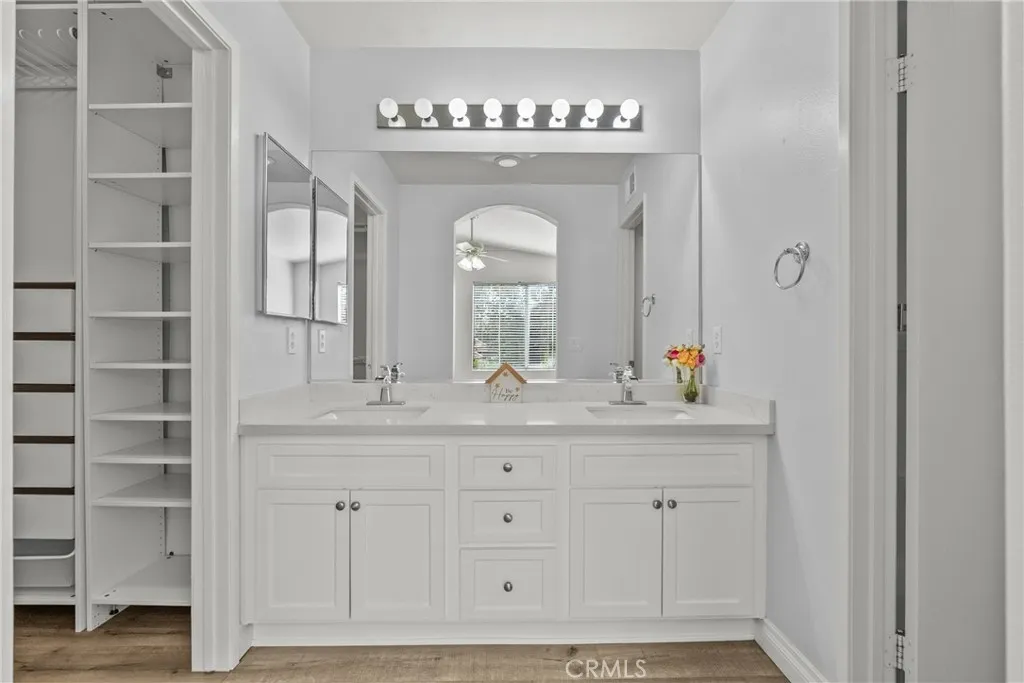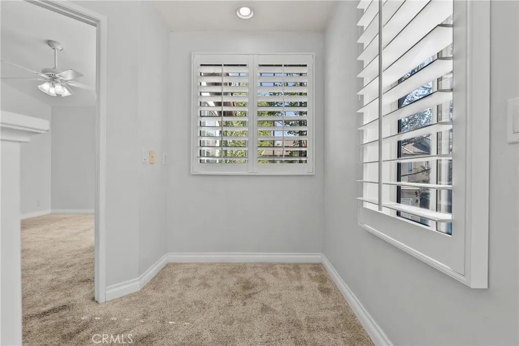 for easy entertaining. Ample counter space and cabinets galore ! Newer dishwasher and farm sink for swift clean up !The downstairs living area has newer laminate floors for easy care and a half bath for guests. Upstairs you’ll find The primary suite has plantations shutters, ceiling fan and appealing bath/dressing area. A walk in closet is an added bonus!