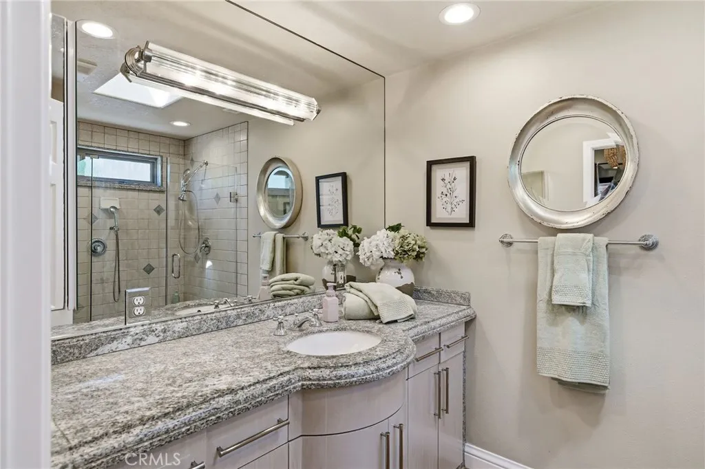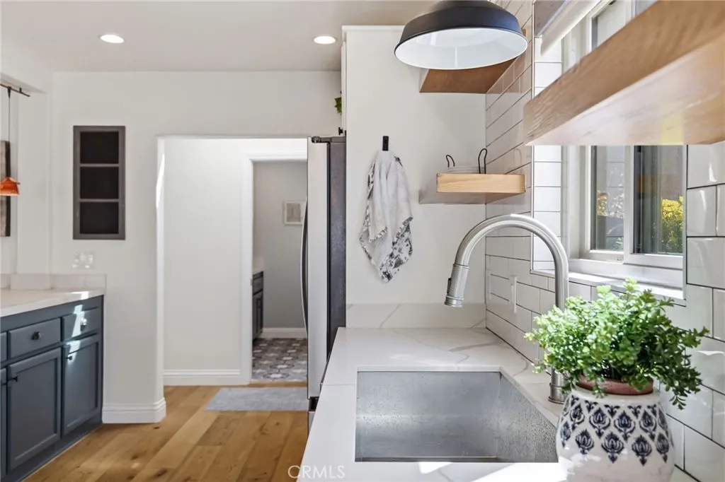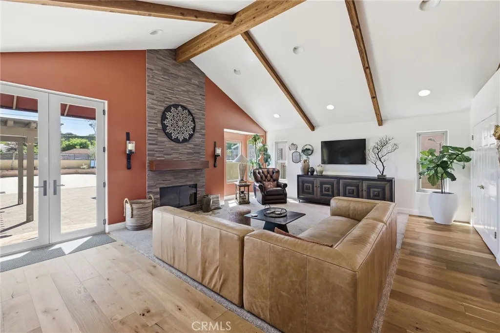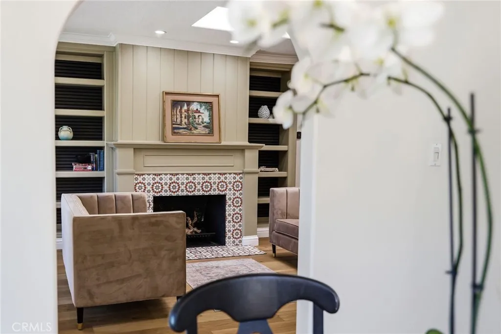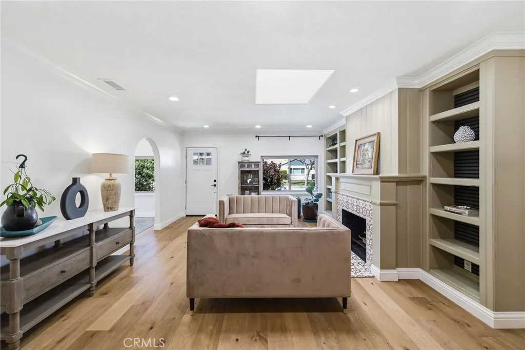 room – all on an unbelievable 8928 sq ft lot making for an entertainer’s delight – step into this wonderful home on white oak hardwood floors – the comfortable living room has a decorative tile fireplace to enjoy – the gorgeous remodeled kitchen with upscale stainless appliances, quartz counters, open shelving, recessed lighting, lots of white cabinets for the chef in the family, private primary bedroom with large walk in closet, high ceilings, skylight and a remodeled bath with a walk in shower – huge family room with soaring ceilings, carpet, gas burning fireplace, custom coffee bar with frig and more
