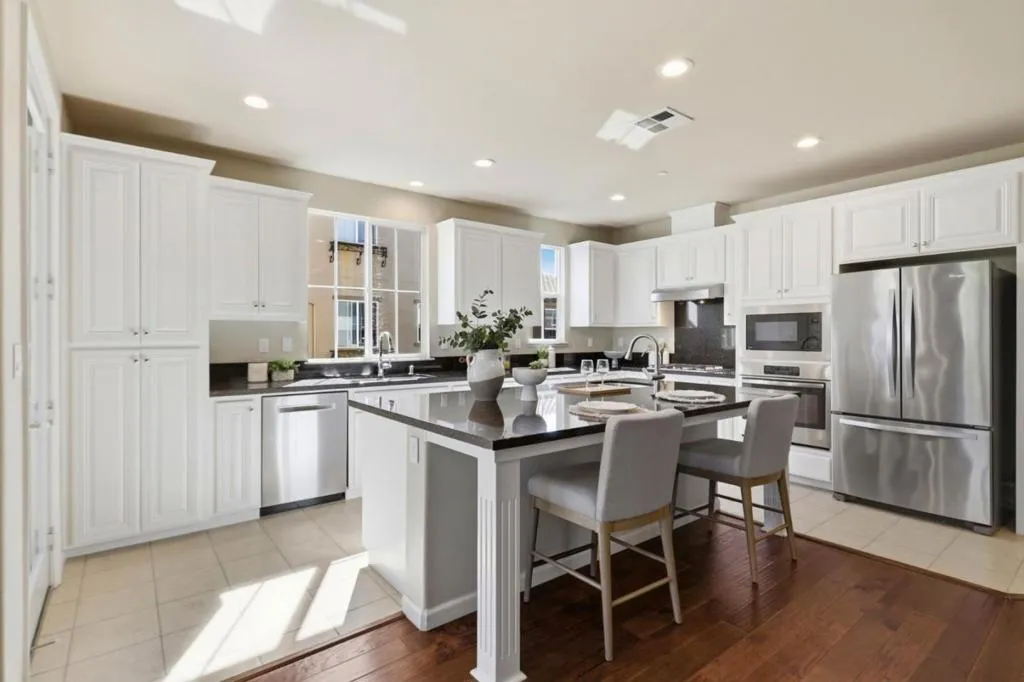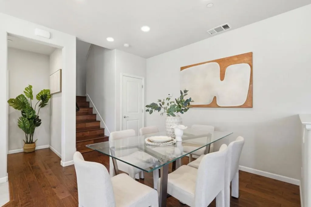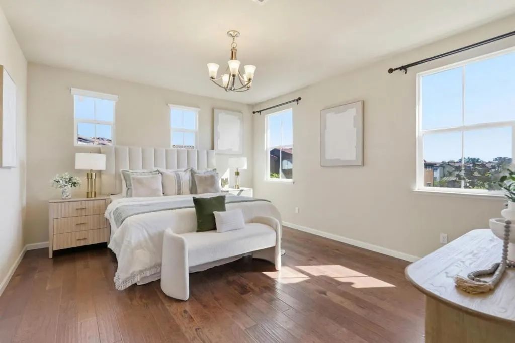 Bright and spacious end-unit townhouse in desirable Las Palmas! Built in 2014 by Summerhill Homes, this 3BD/2.5BA tri-level home offers ~1,851 sq ft of light-filled living space in a quiet, private location. Open floor plan with balcony, featuring a gourmet kitchen with granite countertops, stainless steel appliances, large island with seating, and walk-in pantry. Engineered wood floors throughout and separate laundry room. Elegant primary suite with walk-in closet and dual-sink vanity; custom closet organizers in all bedrooms. Dual-zone A/C & heating. Community amenities include gym, private park, BBQ area, and clubhouse. Resident-only access gate near unit. Prime locationwalking distance to shopping, dining, parks, tennis center, and library; close to downtown Sunnyvale and Sunnyvale Caltrain Station. Easy commute to major tech employers. Top-rated Cumberland Elementary School (buyer to verify).