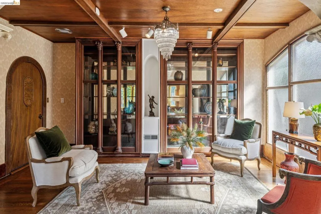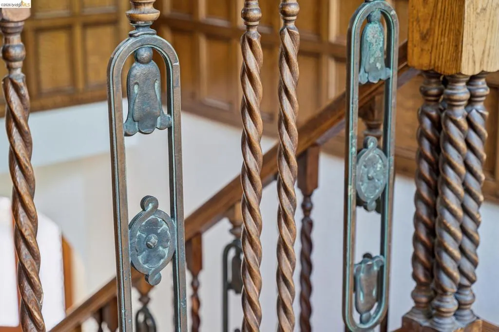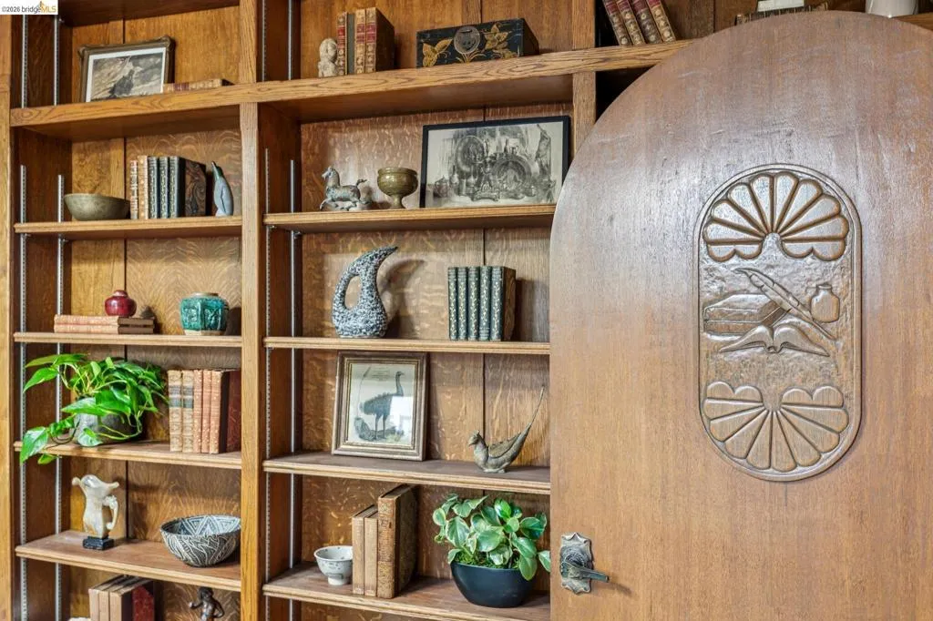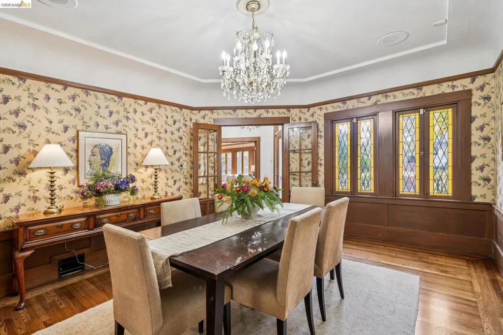 There are times when a property exudes so much character and charm that you are compelled to explore it. This is one such home and it truly delights the senses. Welcome to 824 Paru Street, an enchanting 1910 Storybook home in Alameda’s coveted Gold Coast—just one block to the lagoon and Franklin Park/Franklin Elementary. Behind a brick garden wall and gated entry, this whimsical 3,523 SqFt home showcases steep gables, sweeping curved rooflines, arched doorways, stained glass, and classic English cottage charm—a rare and beautifully preserved example of early 20th century design. Inside, the living room is a true centerpiece with rich wood paneling, leaded glass windows, and a striking fireplace with custom millwork, while classical wainscoting lines the halls leading to a dramatic second-floor landing beneath the steep roofline. Upstairs, new red oak floors complement three primary bedrooms, each with an ensuite bath (2.5 total), while original white oak floors in the living and dining rooms have been thoughtfully restored. The backyard patio invites quiet moments under a wisteria-draped gazebo. Public record notes five bedrooms; the lower level lives as a spacious family room with copper fireplace and a refined library or office with adjacent full bath. This home is truly a gem!