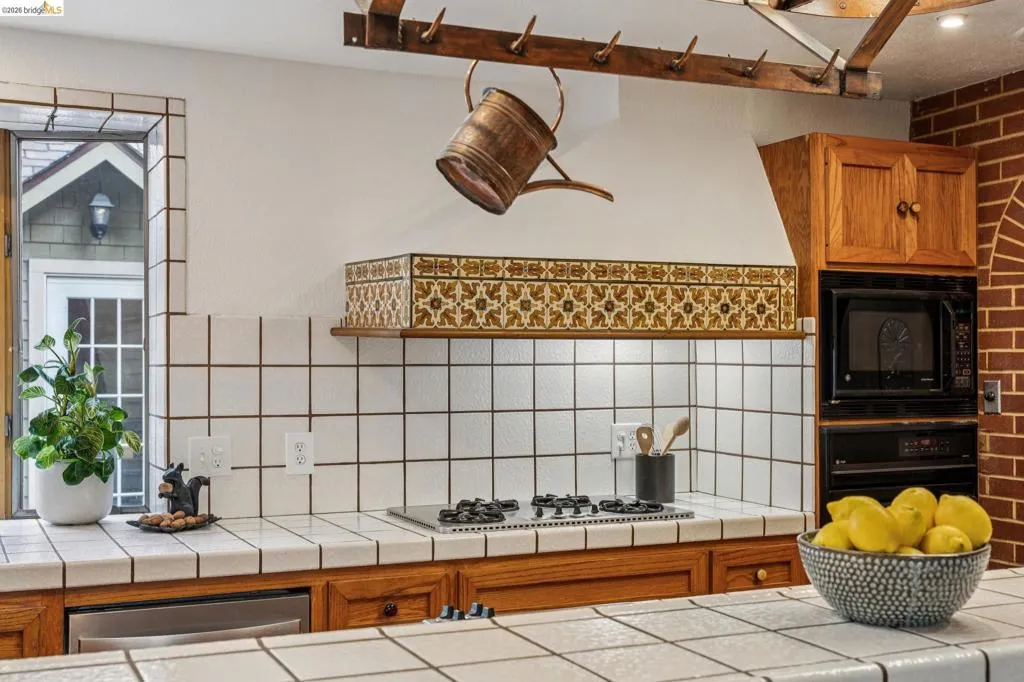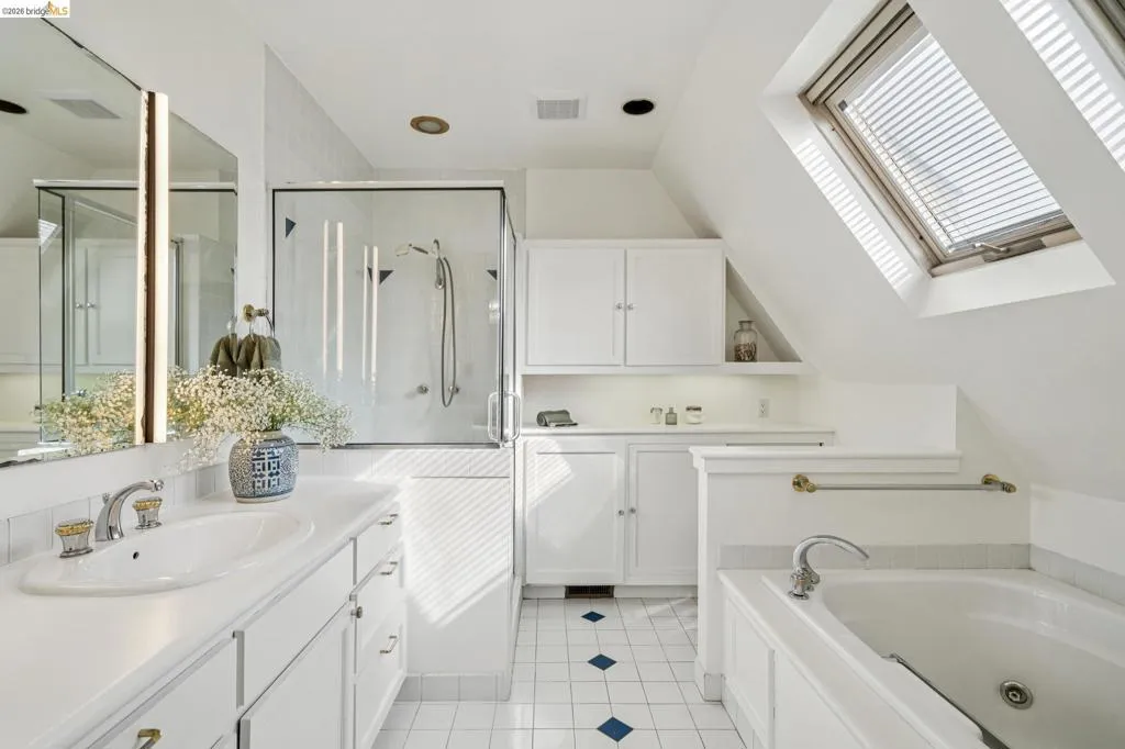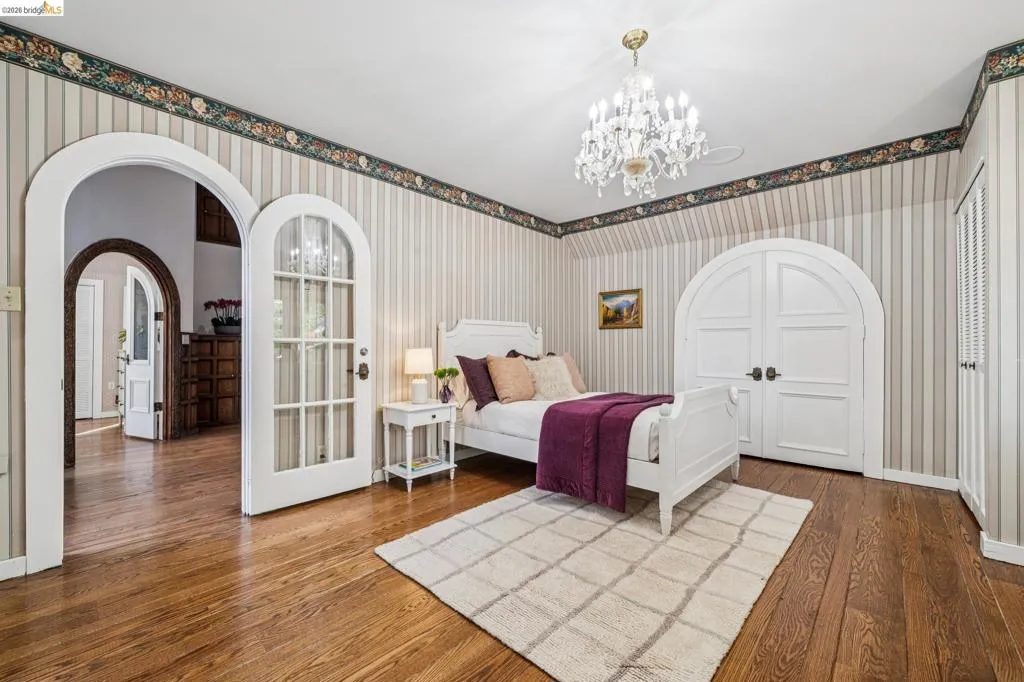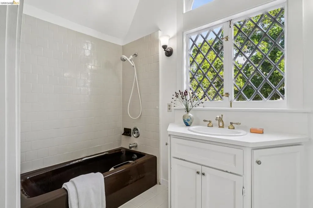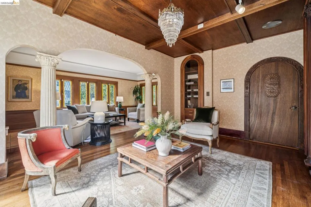 There are times when a property exudes so much character and charm that you are compelled to explore it. This is one such home and it truly delights the senses. Welcome to 824 Paru Street, an enchanting 1910 Storybook home in Alameda’s coveted Gold Coast—just one block to the lagoon and Franklin Park/Franklin Elementary. Behind a brick garden wall and gated entry, this whimsical 3,523 SqFt home showcases steep gables, sweeping curved rooflines, arched doorways, stained glass, and classic English cottage charm—a rare and beautifully preserved example of early 20th century design. Inside, the living room is a true centerpiece with rich wood paneling, leaded glass windows, and a striking fireplace with custom millwork, while classical wainscoting lines the halls leading to a dramatic second-floor landing beneath the steep roofline. Upstairs, new red oak floors complement three primary bedrooms, each with an ensuite bath (2.5 total), while original white oak floors in the living and dining rooms have been thoughtfully restored. The backyard patio invites quiet moments under a wisteria-draped gazebo. Public record notes five bedrooms; the lower level lives as a spacious family room with copper fireplace and a refined library or office with adjacent full bath. This home is truly a gem!