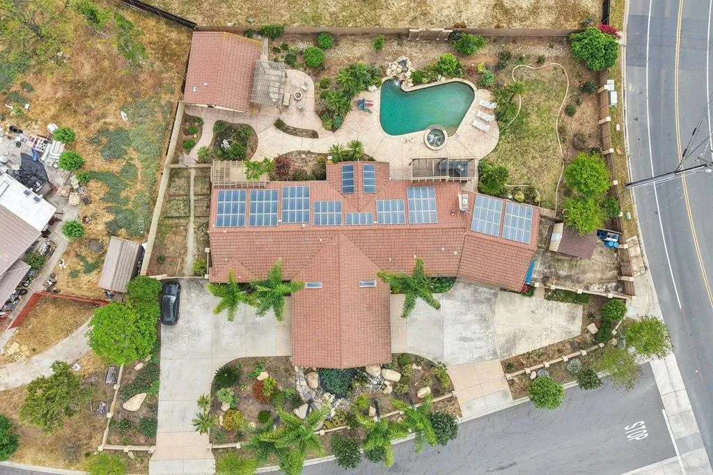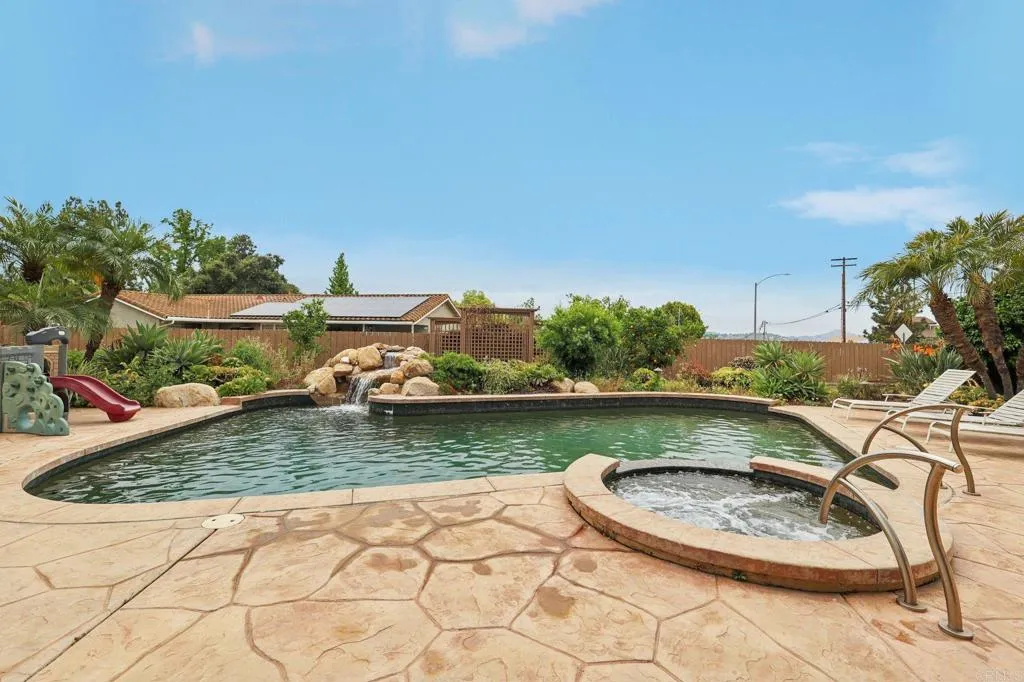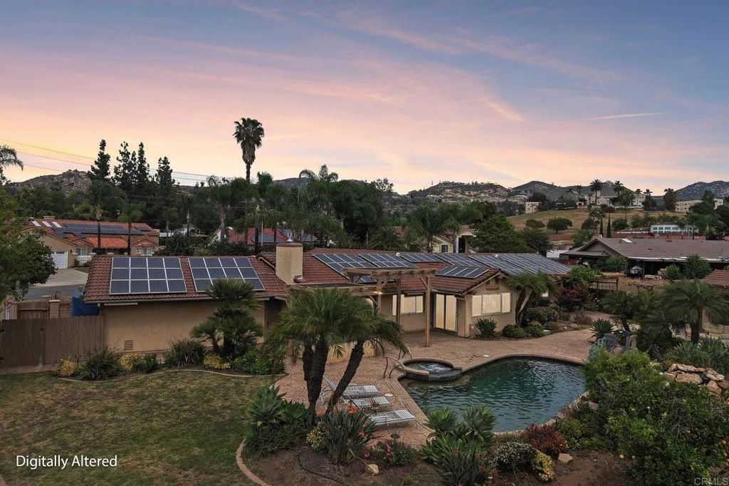 Impeccably landscaped Granite Hills estate, privately set on a sprawling .54-acre corner lot, offering a rare blend of luxury, privacy, and resort-style living. This elegant single-level residence features 4 bedrooms, 2 bathrooms, 2,510 sqft, plus a detached J-ADU of approximately 445 sqft perfect for guests or extended living. Designed for both refined living and effortless entertaining, the main home showcases an inviting eat-in kitchen, formal dining room, and an expansive family room anchored by a warm fireplace. Multiple sliding glass doors create a seamless indoor-outdoor experience, flooding the home with natural light and enhancing its open, airy feel. The thoughtfully designed floor plan includes a serene primary suite retreat, three additional spacious bedrooms, dual living areas, and sophisticated custom track lighting throughout. Step into your own private oasis—an entertainer’s dream—featuring a tropical pool and spa with cascading waterfall, fire pit lounge, lush garden spaces, and an array of mature fruit trees including grapefruit, lemon, and orange. The palapa-style outdoor bar with built-in BBQ elevates the experience, perfect for hosting unforgettable gatherings. Additional highlights include a 2-car attached garage, extended driveway, and ample secured parking for RVs, boats, and multiple vehicles. A truly exceptional offering that embodies elevated Southern California living. Come check out this house before it’s gone!