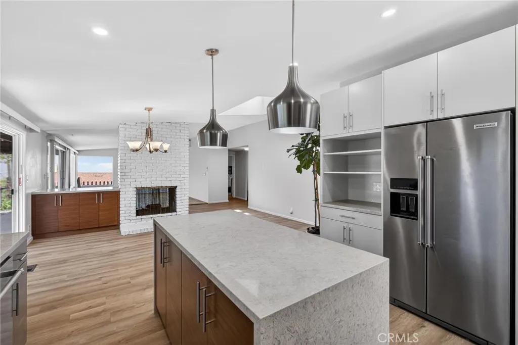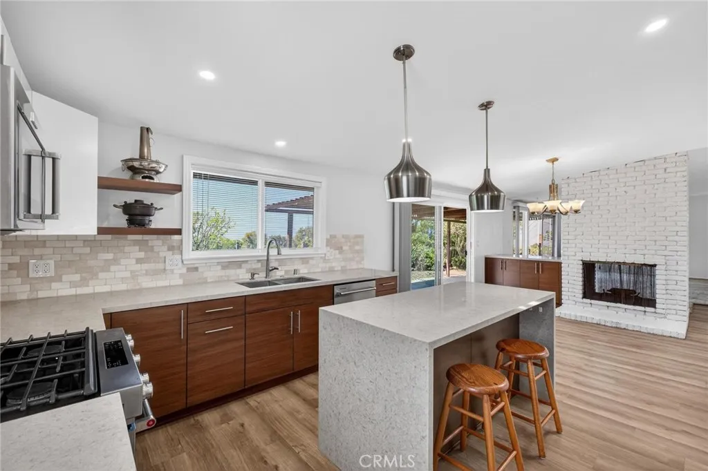 The expansive living and family areas feature an open layout, highlighted by a dual-sided fireplace that creates a natural flow between spaces. Large glass doors and windows invite natural light and frame the backyard and coastal views, blending indoor comfort with outdoor serenity.
