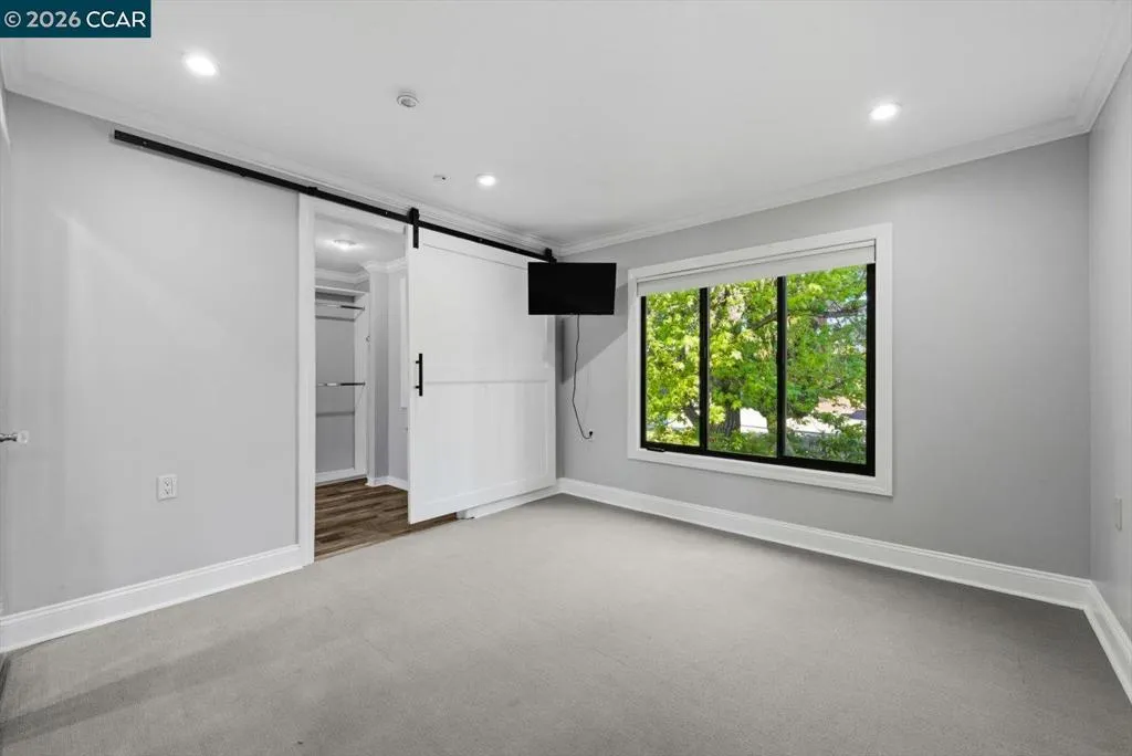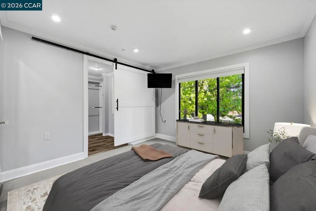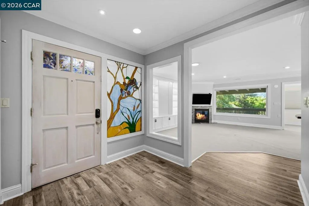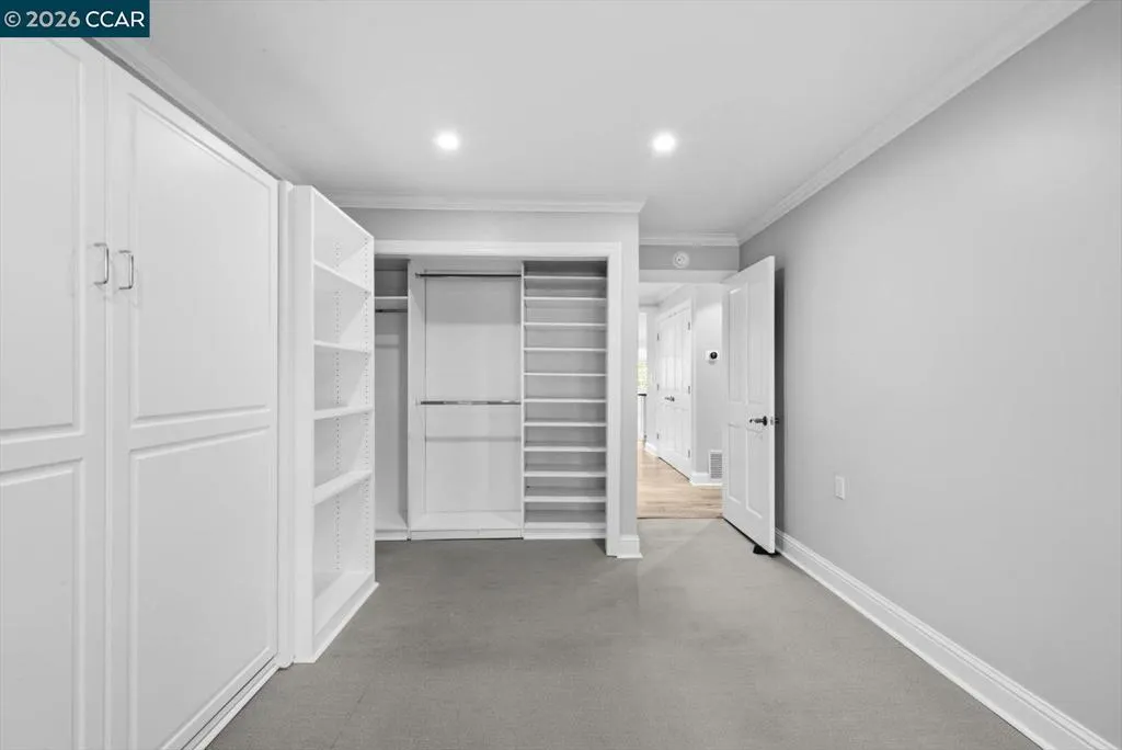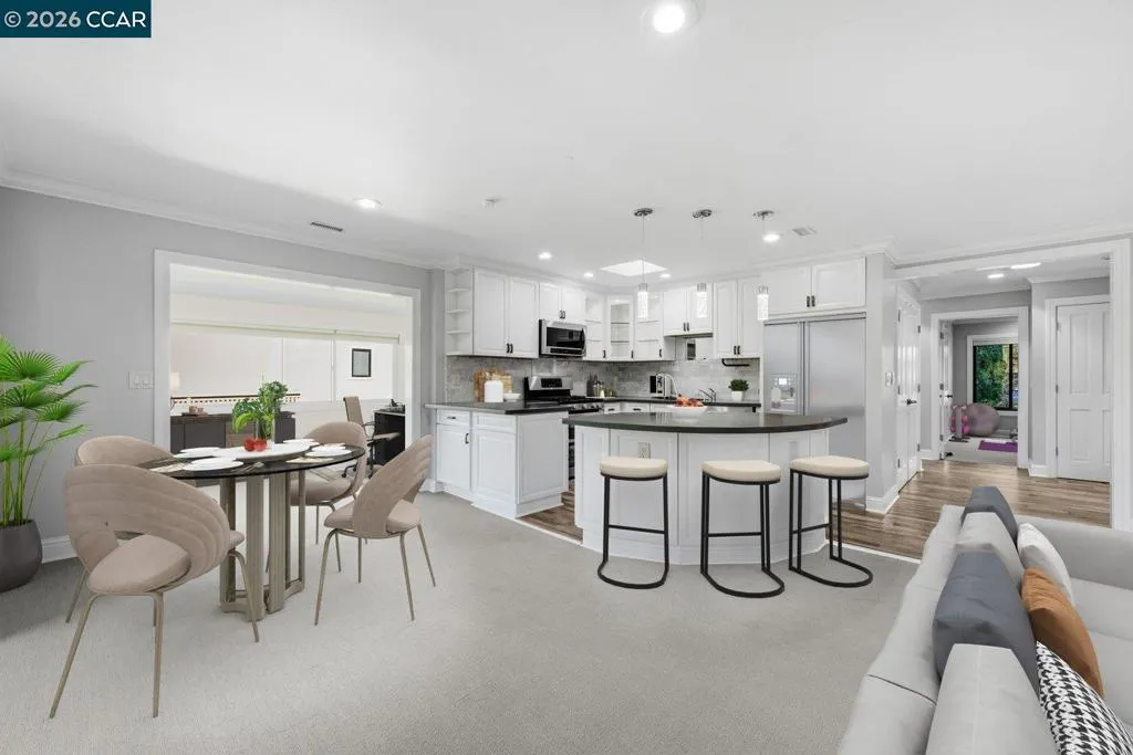 Welcome to 2741 Golden Rain Rd #7, a spacious upper-level Sequoia Wrap 2BD/2BA co-op offering approx. 1,466 sq ft in the sought-after 55+ Rossmoor community. The open living and dining area is filled with natural light and features a fireplace and built-in entertainment center. A covered balcony spans the home, providing a peaceful outlook and space for outdoor seating or dining. The updated kitchen includes modern appliances, ample cabinetry, and a large breakfast bar/island. A versatile bonus room offers flexibility for an office, reading, or exercise space. The primary suite features an expansive closet and ensuite bath with dual vanities, bidet, and walk-in shower with seating. The second bedroom includes a Murphy bed for added flexibility. Nearby is a bath with large vanity and walk-in shower. Additional features include dual-pane windows, skylights, generous storage, and a private parking space and cabinet ideal for golf clubs or seasonal items. There’s also a community gathering space nearby. Rossmoor offers golf, fitness, pools, tennis, trails, clubs, and more. Buyer must qualify. Monthly HOA dues. Minutes to downtown Walnut Creek, shopping, dining, and freeway access.