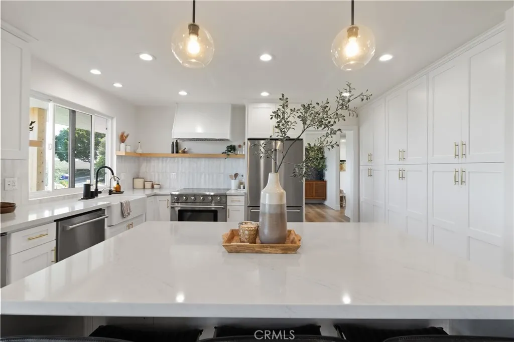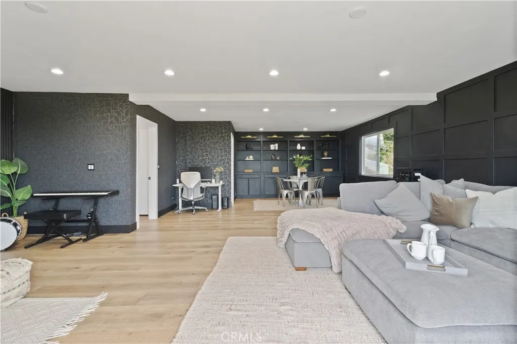 The kitchen has been fully updated with new cabinetry, appliances, fixtures, and flooring that carries throughout the home, creating a clean, cohesive feel. Just beyond, the living and dining areas open up under oversized windows that flood the space with natural light and frame the skyline. The family room fireplace adds warmth, while built-ins, updated lighting, and a bar area bring both function and character.