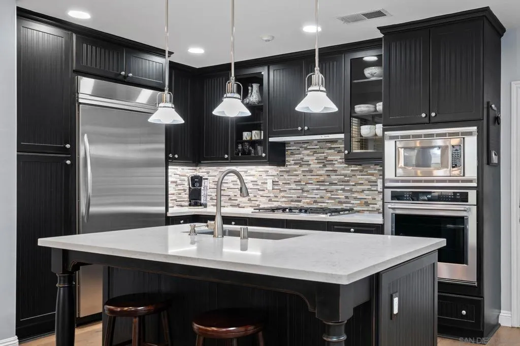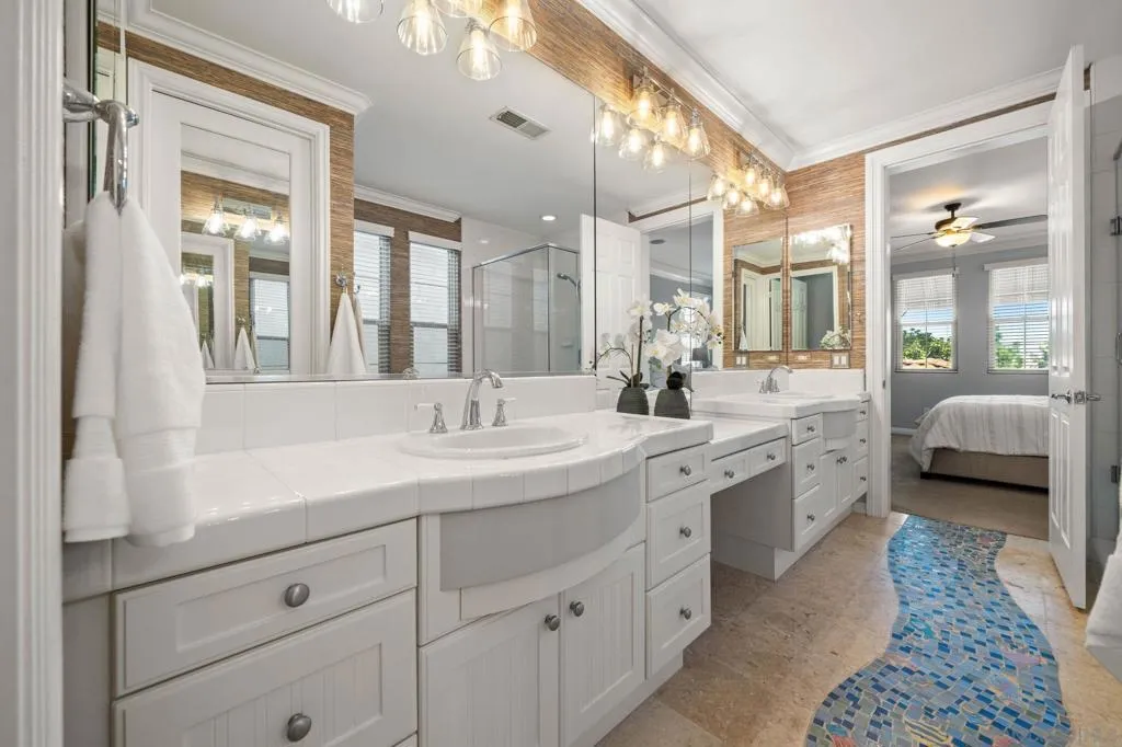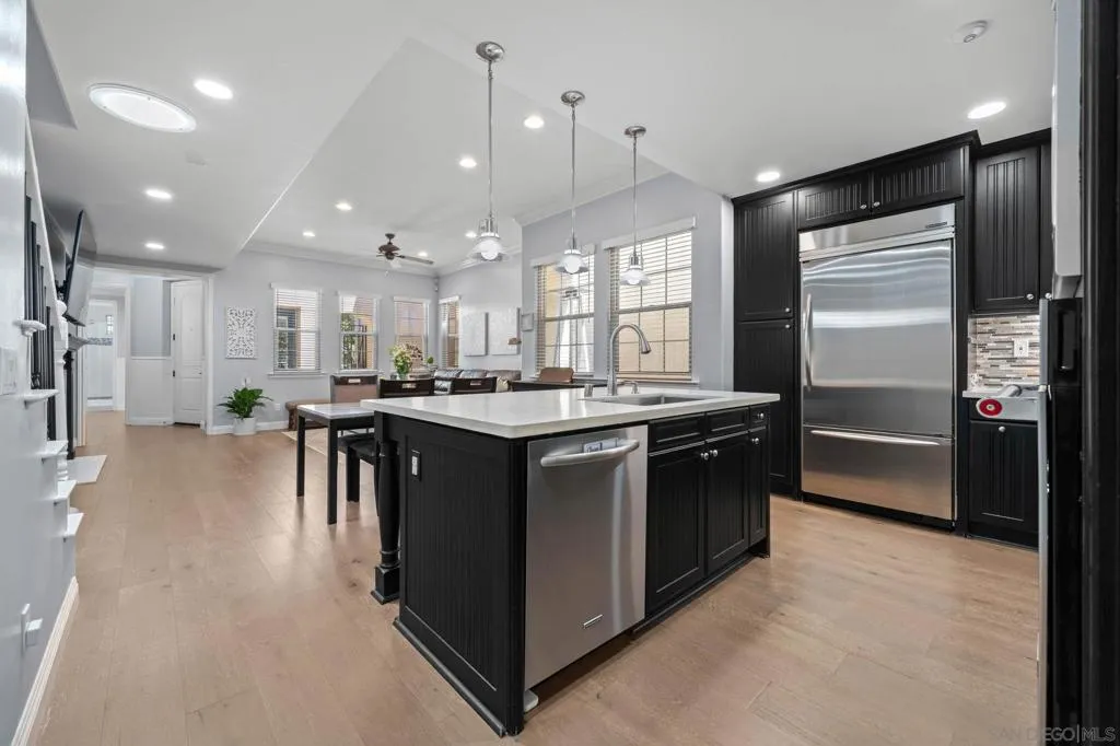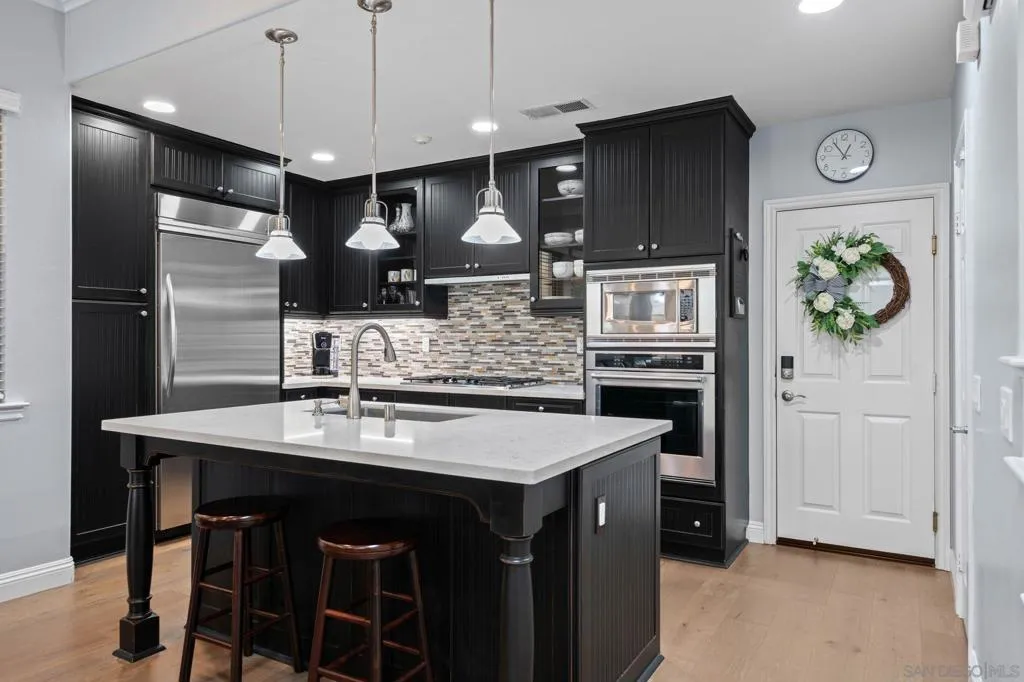 Beacon Point Plan 1 – and as one of the original former models, it includes many features that are truly unique to this home. The popular main-floor bedroom has French doors that open right out to the patio, and there’s also a charming balcony in front. Strategic Improvements for Cost-Effectiveness and Improved Health – Owned solar (NEM 2.0) – Replaced HVAC systems coil and condenser with APCO Fresh-Aire UV whole house purification for cleaner, healthier indoor air. Recent system upgrades provide added peace of mind, including a replaced furnace, dual-pane windows. Termite remediation was completed in 2023. Additional esthetic enhancements include engineered wood flooring, quartz kitchen countertops, a quartz fireplace surround, an upgraded oven, and a recently replaced microwave. Refined details such as wood French door shutters, updated window treatments, and a fully enclosed primary bathroom entry further elevate the home’s livability and design.The thoughtfully designed upper level includes a serene primary retreat and an en suite secondary bedroom, offering both comfort and privacy.