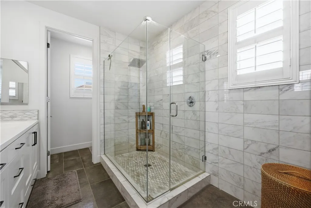 Upstairs is all about relaxation: a large primary suite with a shiplap accent wall, a fully organized walk-in closet, and a spa-like en-suite clad in marble. A second bedroom also enjoys its own en-suite bath – luxurious and convenient for guests or family.