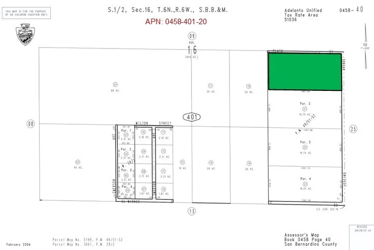 18.59 Acres (APN: 0458-401-20) GPS: 34.606915081, -117.507645540 This 18 acre property is located in the El Mirage area of Adelanto, CA. Zoned Rural Living (RL), this property offers excellent flexibility. Permitted uses include single-family or manufactured homes, crop production, agritourism enterprises, animal keeping, livestock operations, bed & breakfast establishments, small residential care facilities, schools, places of worship, and recreational uses such as parks or playgrounds. RL zoned parcels may be subdivided into 2.5 acre parcels.