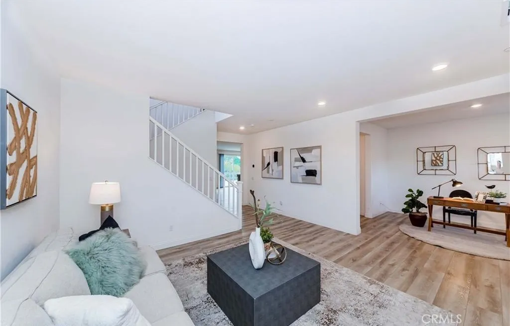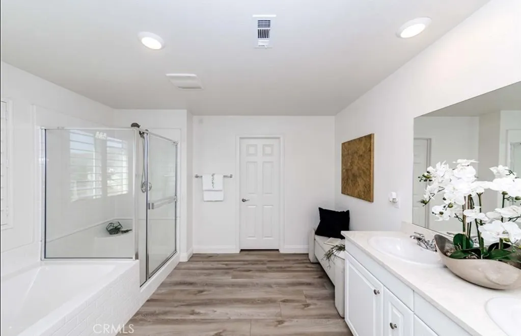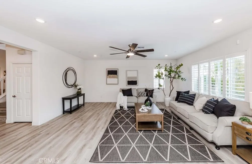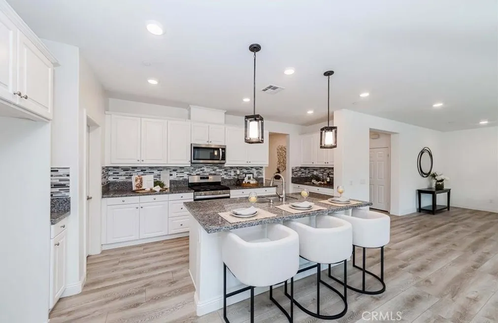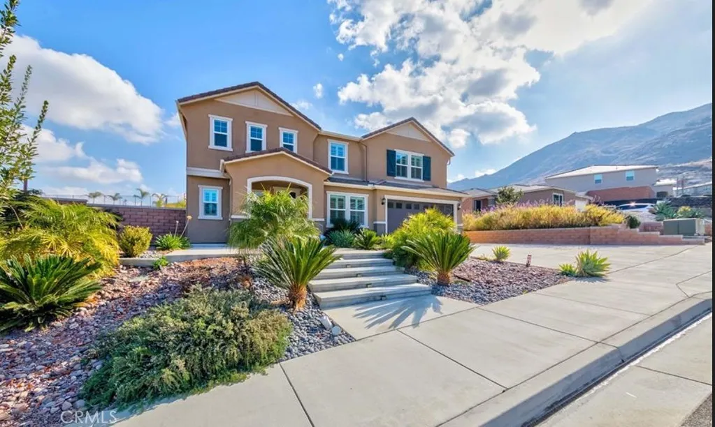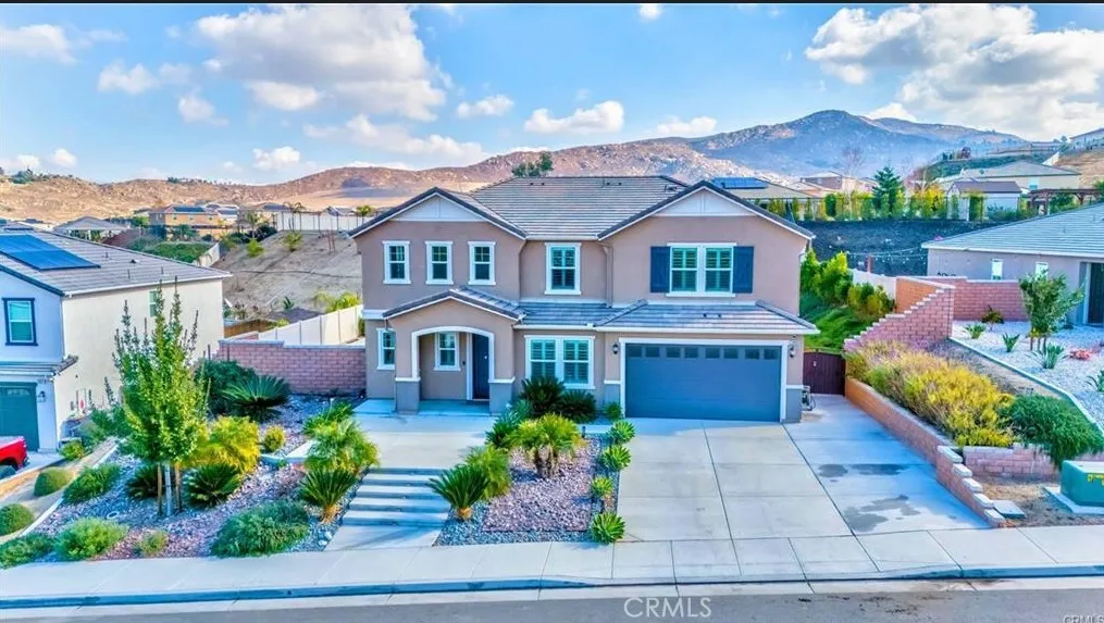 Experience luxury living with mountain views in this stunning home on a spacious 13,000 sq ft lot in the Spring Mountain Ranch Community, Riverside. This elegant residence boasts 5 bedrooms, 3 full bathrooms, a flex room, a large loft, a den, 2 car garages, and RV parking. The entire house features premium vinyl plank flooring, energy-saving solar panels, plantation shutters, ceiling fans, recessed ceiling lights, and a Wi-Fi smart thermostat. The kitchen is a chef’s dream with white thermofoil cabinetry, satin nickel knobs, granite countertops, a premium tiled backsplash, a large island with bar seating, and Whirlpool® stainless steel appliances. A spacious walk-in pantry offers ample storage. The bright living room provides views, while the versatile flex room can serve as a formal dining area or office. The airy and bright expansive great room is perfect for family gatherings. A bedroom and full bathroom on the main floor offer convenience for guests. The primary suite features a bright and spacious bedroom, a huge walk-in closet, a bathroom with a separate tub and walk-in shower, and double vanity sinks with cultured marble countertop. The large loft with picturesque views offers additional space for your family’s needs. Three additional well-sized bedrooms and a full bathroom are located on the second level, along with a large laundry room with plenty of storage cabinets and shelves. The beautifully hardscaped and landscaped backyard is perfect for outdoor enjoyment and has the potential for an ADU. With no HOA fees and proximity to UCR, CBU, Historical Downtown Riverside, and Loma Linda University and Hospital, this home is a must-see!