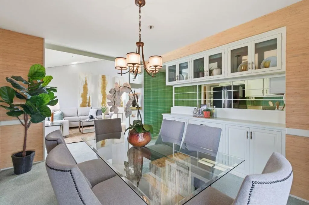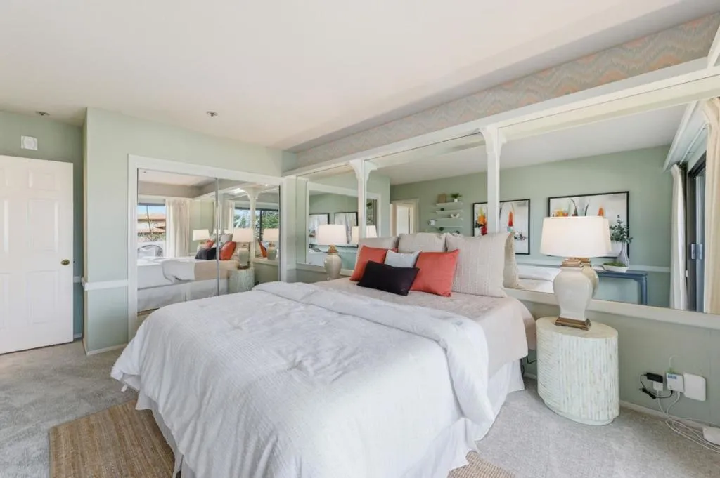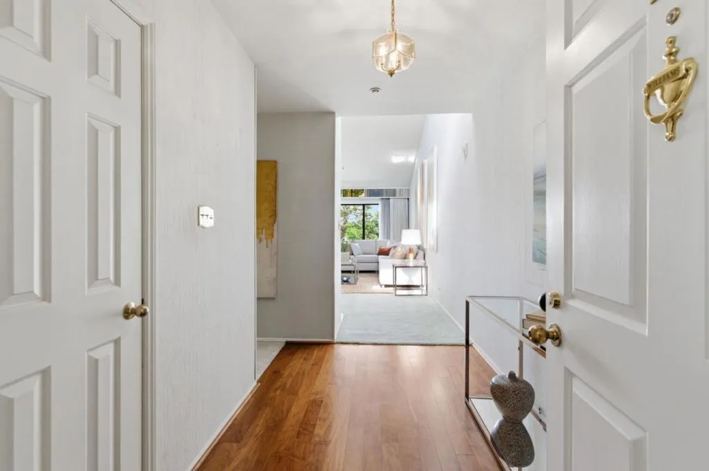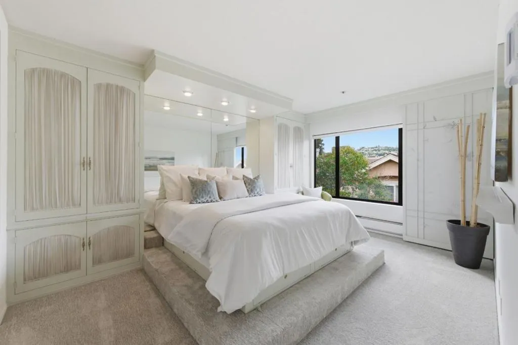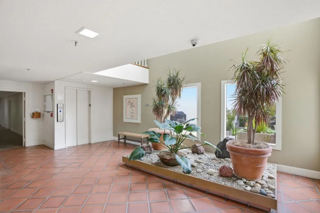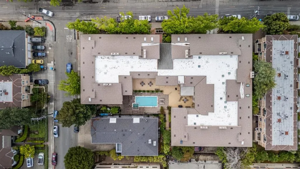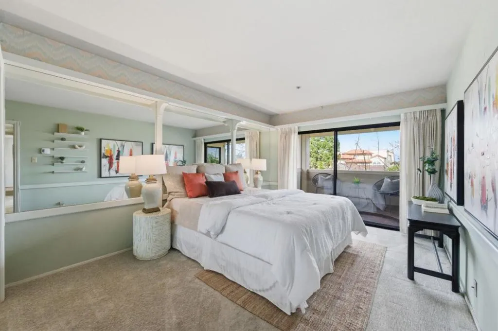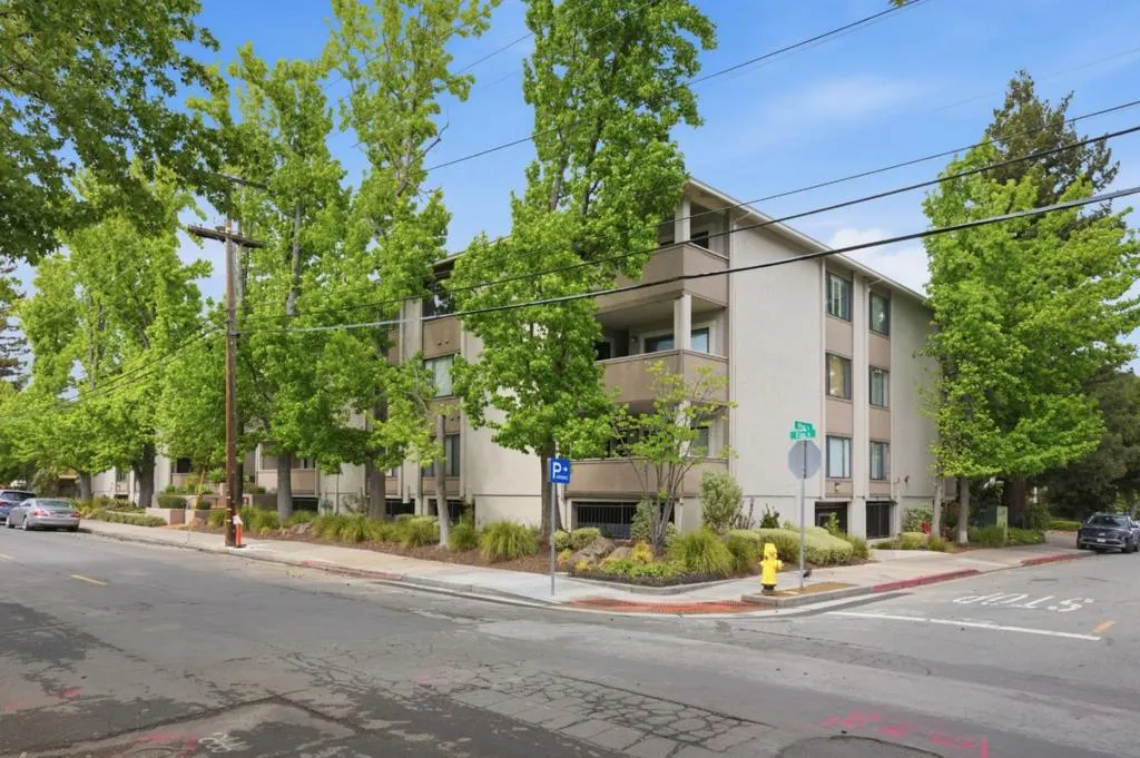 End-unit penthouse condo just blocks from vibrant downtown San Carlos. This 2-bedroom, 2-bathroom residence is ideally positioned in one of the most desirable locations in the building. A formal entry welcomes you into a light-filled living room with soaring vaulted ceilings, seamlessly connecting to a formal dining area that opens onto a private deck nestled in the trees. The thoughtfully designed kitchen offers both functionality and flow. Just down the hall you have a spacious primary suite with dual closets, while the second bedroom includes its own private balcony, offering added comfort and privacy. A separate laundry room with washer and dryer enhances everyday convenience. Prime location, walking distance to restaurants, shops, the library, adult community center, top-rated schools, and just a short stroll to the Caltrain station. This well-maintained, contemporary complex consists of only 24 units and offers recreation rooms on each floor, a pool and spa, inviting lobby, elevator access, and wide, well-lit hallways. Additional highlights include extra storage and two secure underground parking spaces.