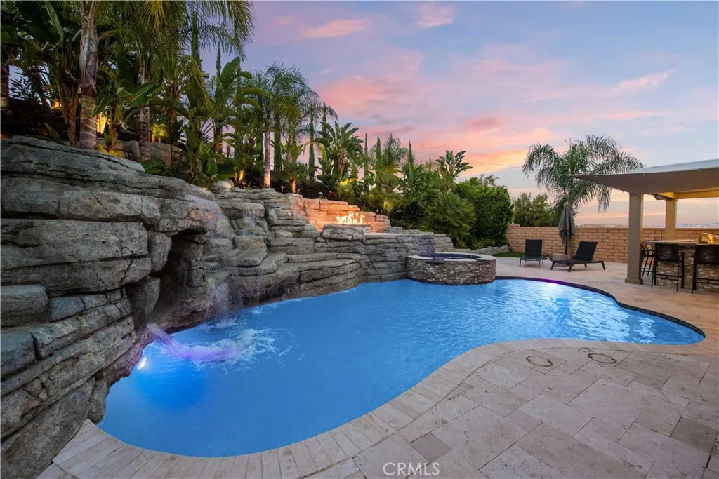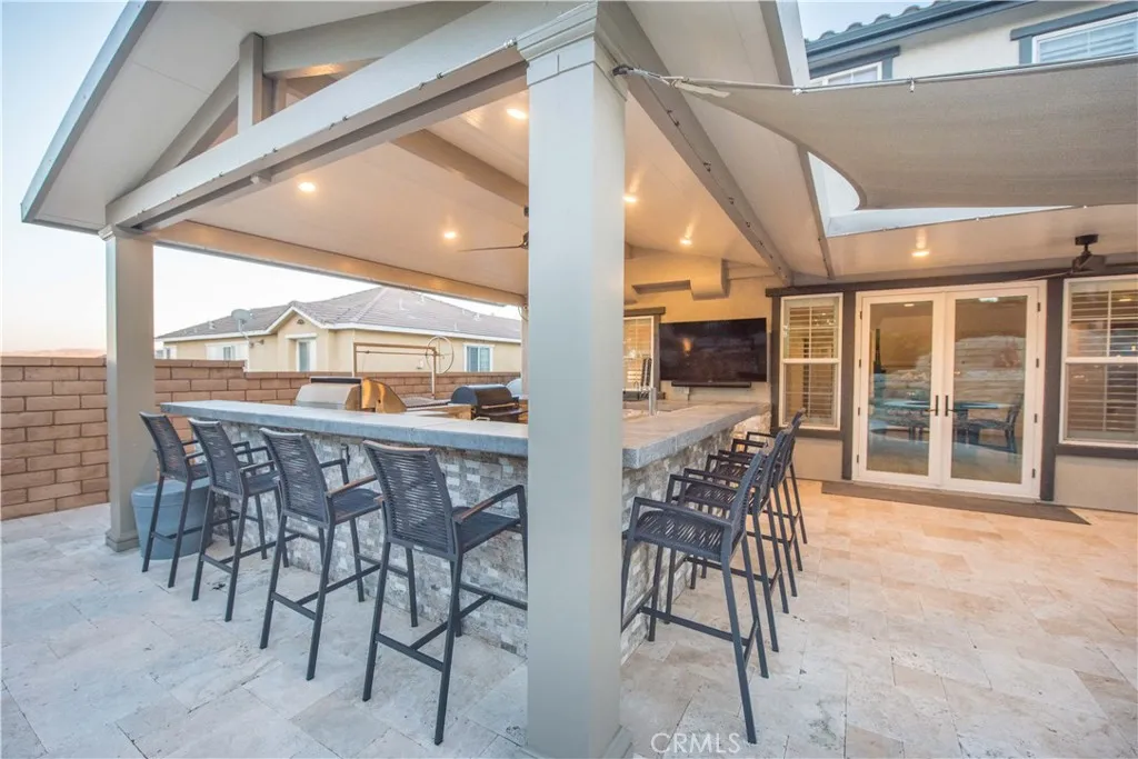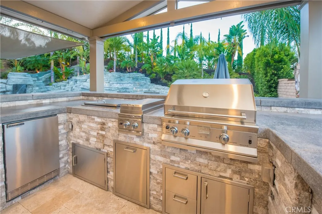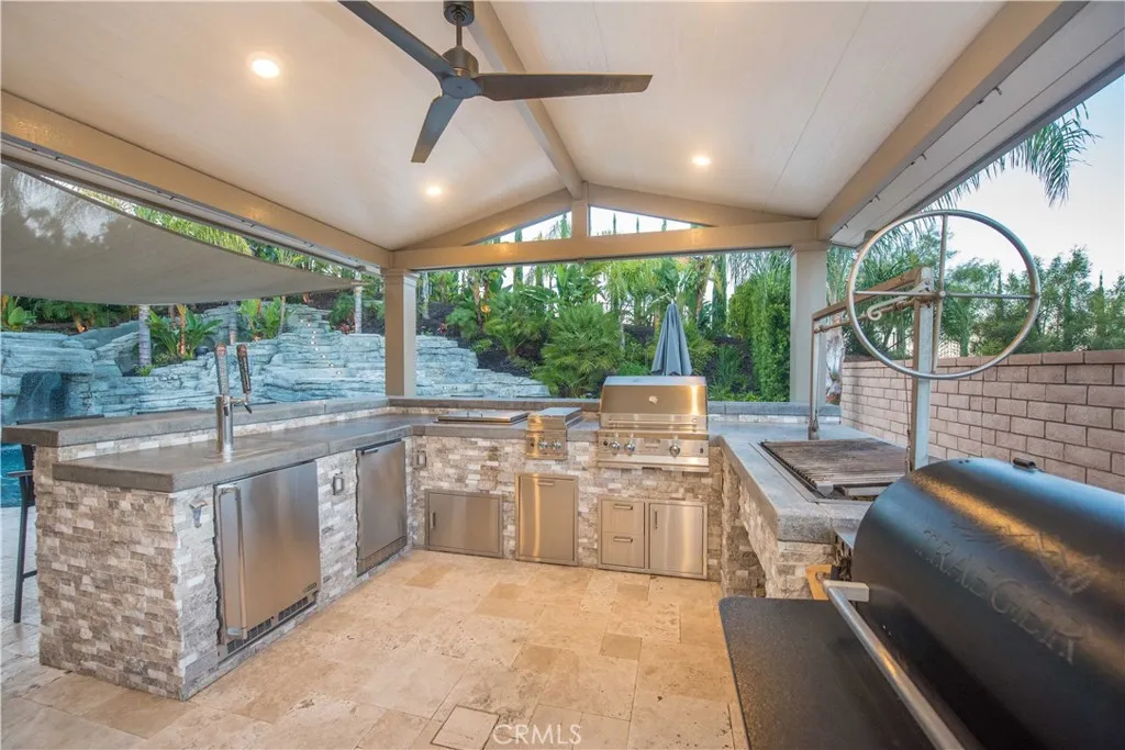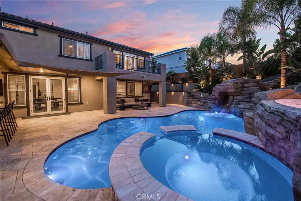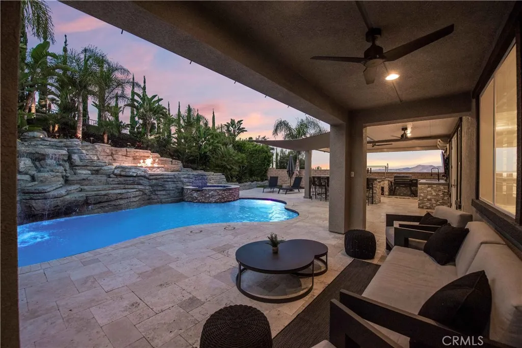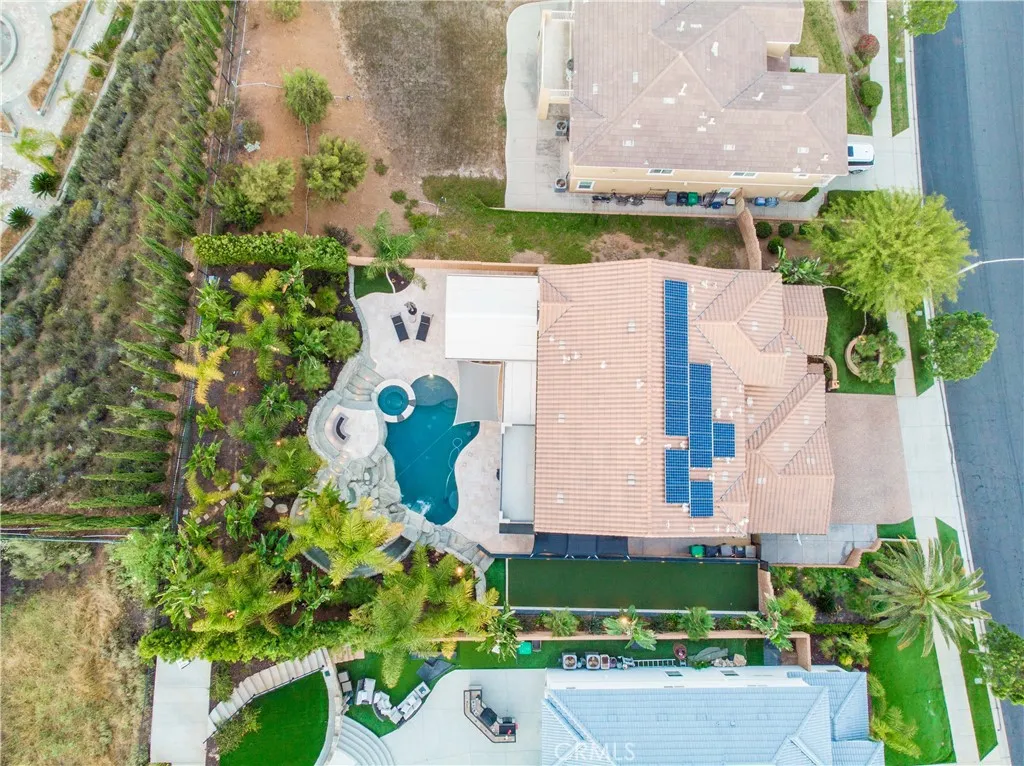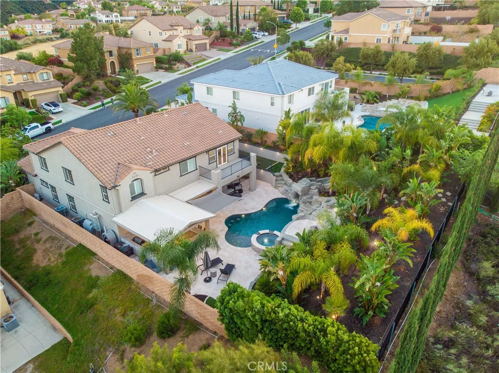 Welcome to a truly exceptional entertainer’s dream nestled in one of Corona’s most desirable gated neighborhoods, The Retreat. This expansive 6-bedroom, 6-bathroom residence offers approximately 4,248 square feet of thoughtfully designed living space, set on an impressive 12,197 square foot lot. Step inside to discover wide open living areas filled with natural light, perfect for both everyday living and hosting unforgettable gatherings. The home features two bedrooms on the main floor, including a private guest suite complete with its own bathroom and convenient kitchenette—ideal for multi-generational living or extended stays. The heart of the home is the beautifully upgraded kitchen, showcasing new cabinetry and premium stainless steel Viking appliances, seamlessly flowing into the spacious great room. Here, you’ll find a custom-built entertainment center and integrated surround sound system, creating the ultimate space for relaxing or entertaining. Upstairs, the primary suite offers a luxurious retreat with its own dedicated HVAC zone for personalized comfort. Additional highlights include a mini-split AC unit for enhanced efficiency and a versatile downstairs front room with a custom barn door—perfect as a private office or optional guest space. Step outside and experience resort-style living at its finest. The backyard is a true showstopper, featuring a sparkling pool and spa with a slide, tunnel, waterfalls, commercial quality misting system and a bubbling volcano feature—all WiFi-controlled through the iAqualink app. Enjoy evenings around the elevated fire pit with built-in seating, or entertain effortlessly with the full outdoor kitchen, complete with a sink, Viking pellet ice maker, and authentic Argentinian grill. Multi-zone Sonos outdoor audio and custom lighting elevate every occasion. The expansive side yard includes a professionally graded 60′ x 10′ turf area, perfect for a putting green, bocce ball, cornhole, or simply enjoying outdoor activities. This home is as practical as it is luxurious, featuring a Generac whole-home natural gas generator for uninterrupted power, a Tesla charging station in the garage, and a paid-off solar lease for energy efficiency. Ideally located near top-rated schools, parks, and shopping, this one-of-a-kind property offers the perfect blend of comfort, convenience, and high-end living. Don’t miss the opportunity to make this extraordinary home yours.