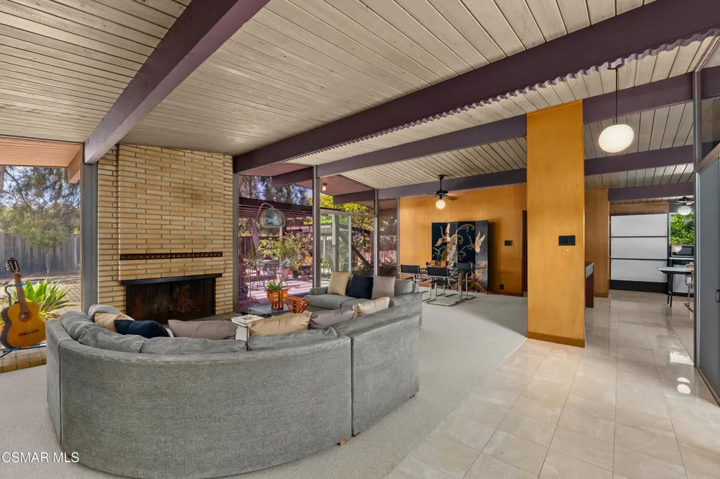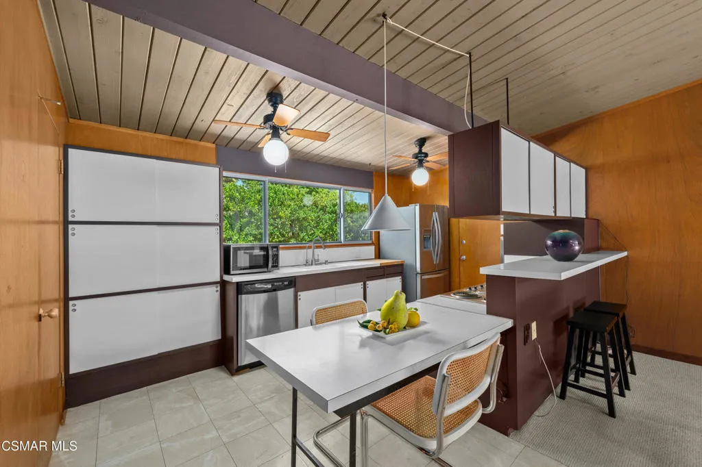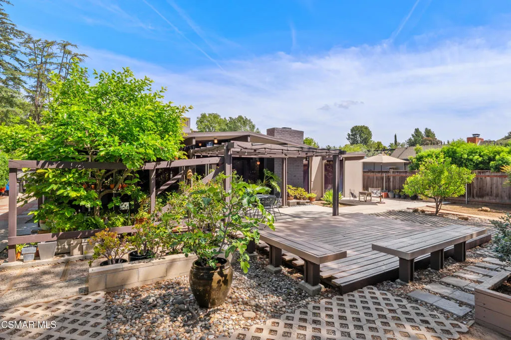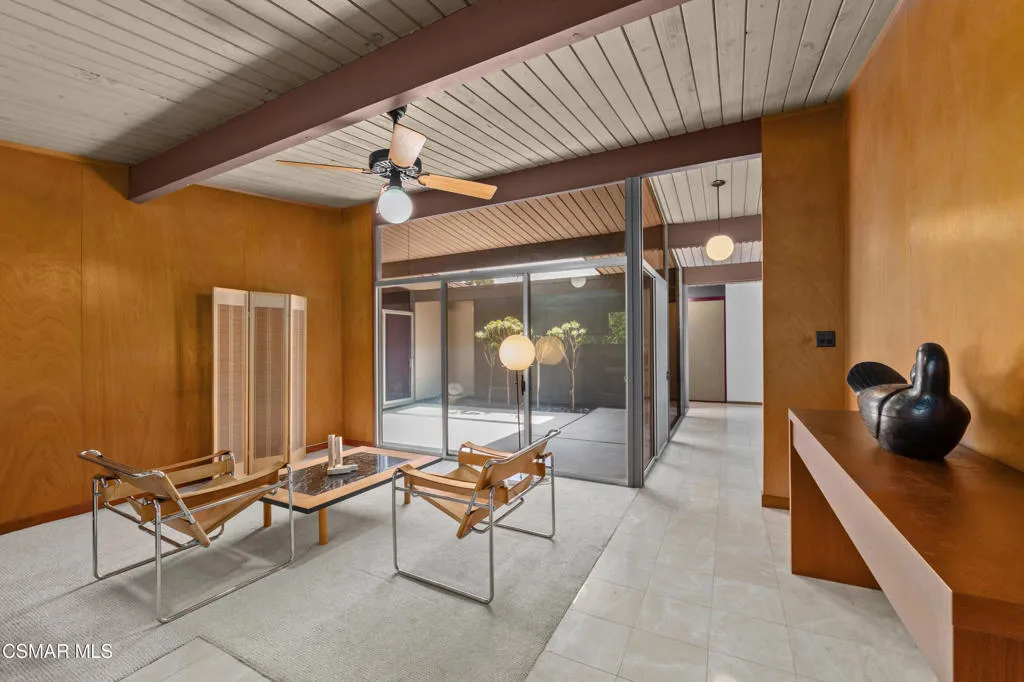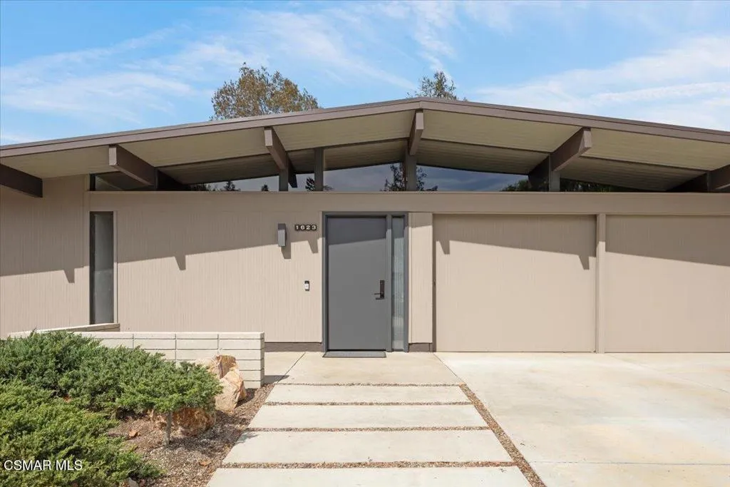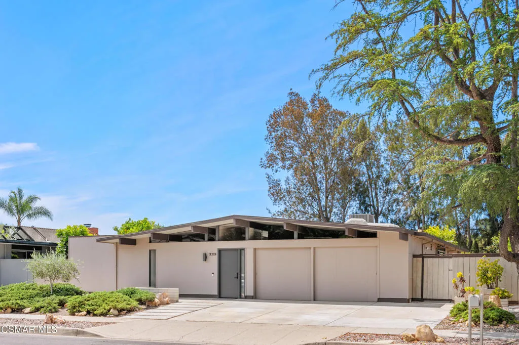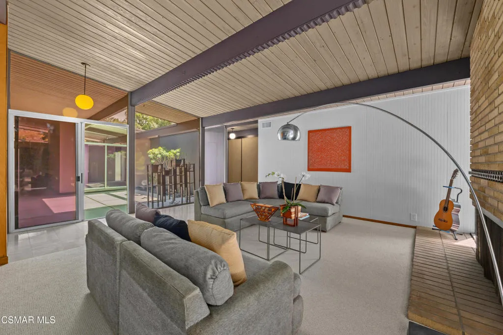 Located on the highest point in the tract, this Claude Oakland-designed Eichler embodies the essence of Mid Century Modern living. Thoughtfully maintained and true to its architectural roots, the home features a rare original, impeccably preserved Eichler kitchen — complete with the iconic pull out table.Step through the brand new steel entry door into the signature atrium, your private open air living space, seamlessly connecting to the bright, expansive living areas beyond. Walls of glass, post and beam construction, and classic indoor outdoor flow create the timeless aesthetic Eichler homes are celebrated for.This home has been exceptionally well cared for and updated where it counts: a new roof (July 2023), new HVAC system (July 2023), new interior and exterior paint, new carpet, renovated bathrooms (one with deep soaking tub), and newly replaced atrium concrete (2024). Energy efficient aluminum double pane windows ensure comfort throughout the seasons.The two front bedrooms have been combined into one expansive room, creating a generous space that could even function as a second bedroom suite, yet also could easily be converted back to the original two rooms.The large private backyard offers multiple seating and entertaining areas beneath a charming pergola. A collection of fruit trees — including a rare exotic pomelo, guava, loquat, lemon, orange, persimmon, plus potted fig and pomegranate — brings a lush, organic feel to the space. The wide side yard has boat or RV storage possibilities.With its architectural pedigree and location, just 30 minutes from Malibu and under an hour from both the Burbank studios and downtown Santa Barbara – this home blends design significance with exceptional convenience.