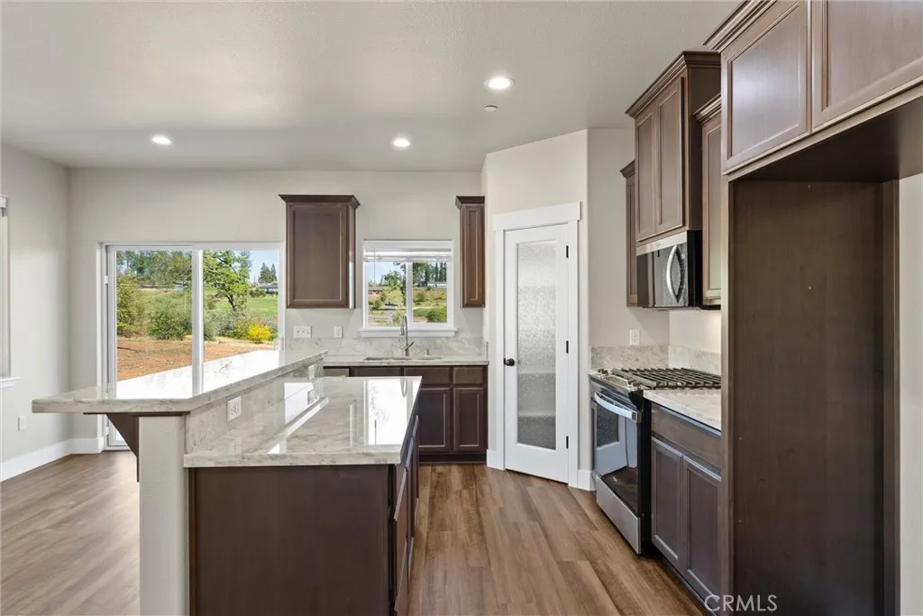 ALMOST COMPLETE, and located on a private dead-end road, you will fall in love with the newly built Anderson Builders Corp. 3-bedroom, 2-bathroom home. From the moment you step onto the welcoming covered front porch, you will feel like you are home. Inside, natural light fills the spacious open floor plan, creating an inviting atmosphere perfect for everyday living or entertaining. The beautifully designed kitchen is the heart of the home, featuring elegant marble countertops, a breakfast bar, stainless steel appliances, a gas range, microwave/range hood, and a classic stainless farmhouse sink. The pantry and soft-closing cabinetry add both convenience and style. The kitchen flows seamlessly into the dining and living areas, where large windows and a sliding glass door enhance the home’s open, airy feel. Luxury vinyl plank flooring runs throughout, offering both style and durability. Additional upgrades include mini-blind window coverings, upgraded closet systems, and insulated interior walls between the bedrooms and bathrooms for added privacy and comfort. Energy-efficient mini-split heating and air conditioning systems ensure year-round comfort. The laundry hookups are located in the large finished garage, which also has RV hookups along the side. For added peace of mind and efficiency, the home includes fire sprinklers, 4KW of owned solar panels, and a one-year fit and finish warranty. This property is being offered to owner-occupied buyers only – a wonderful opportunity to plant roots and truly make it your own.