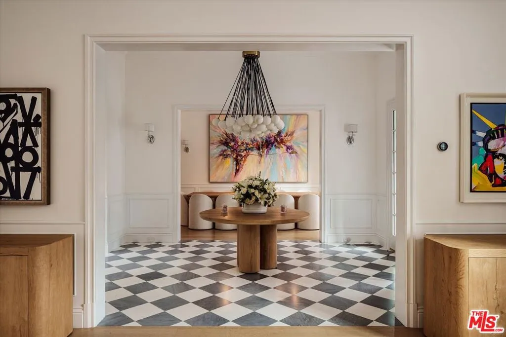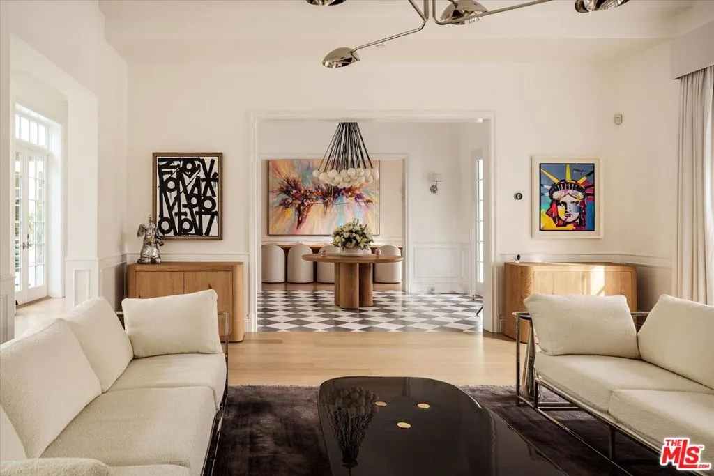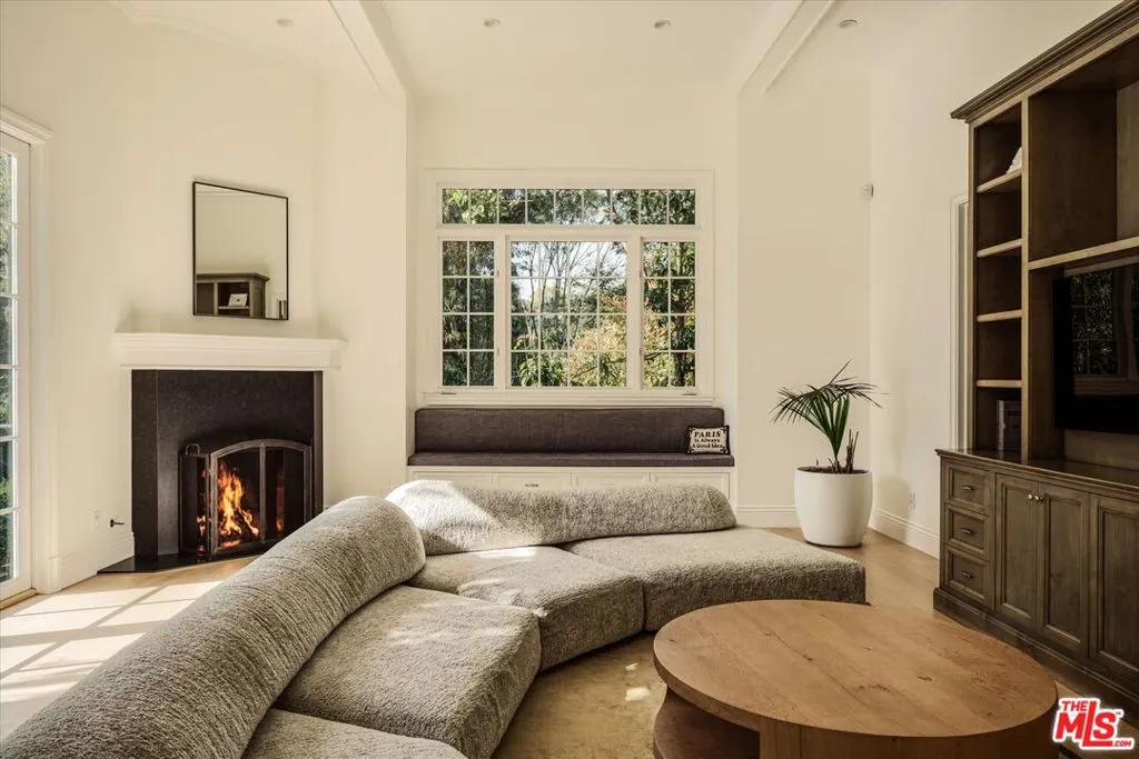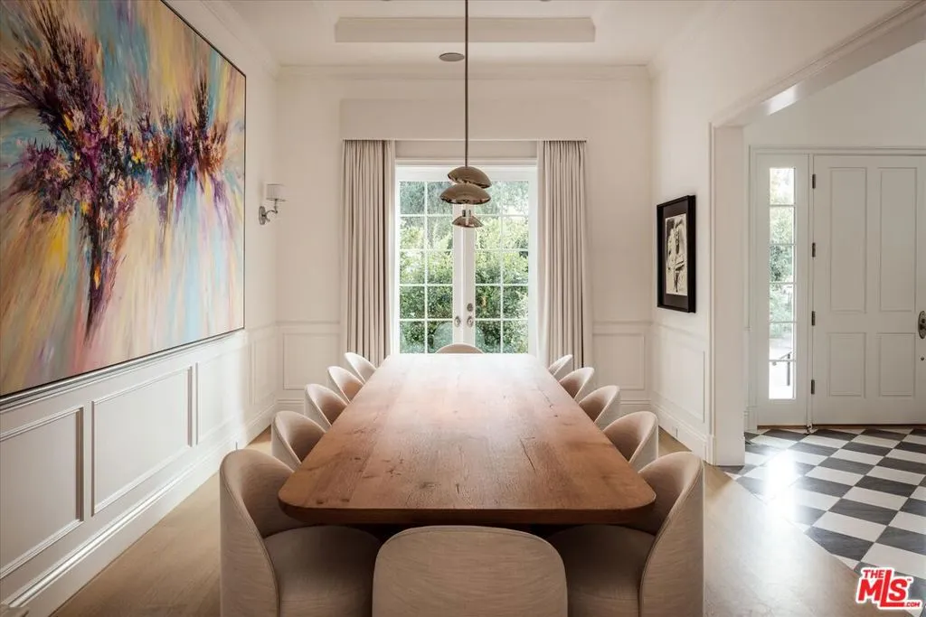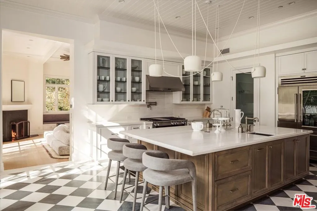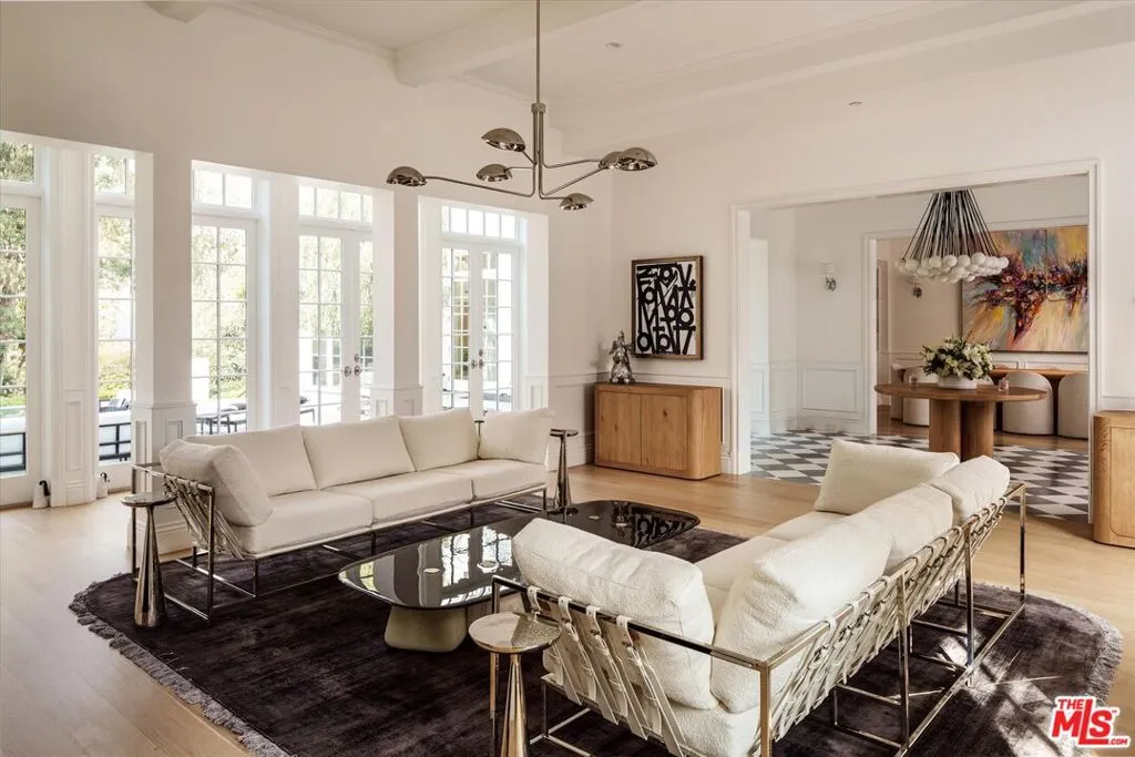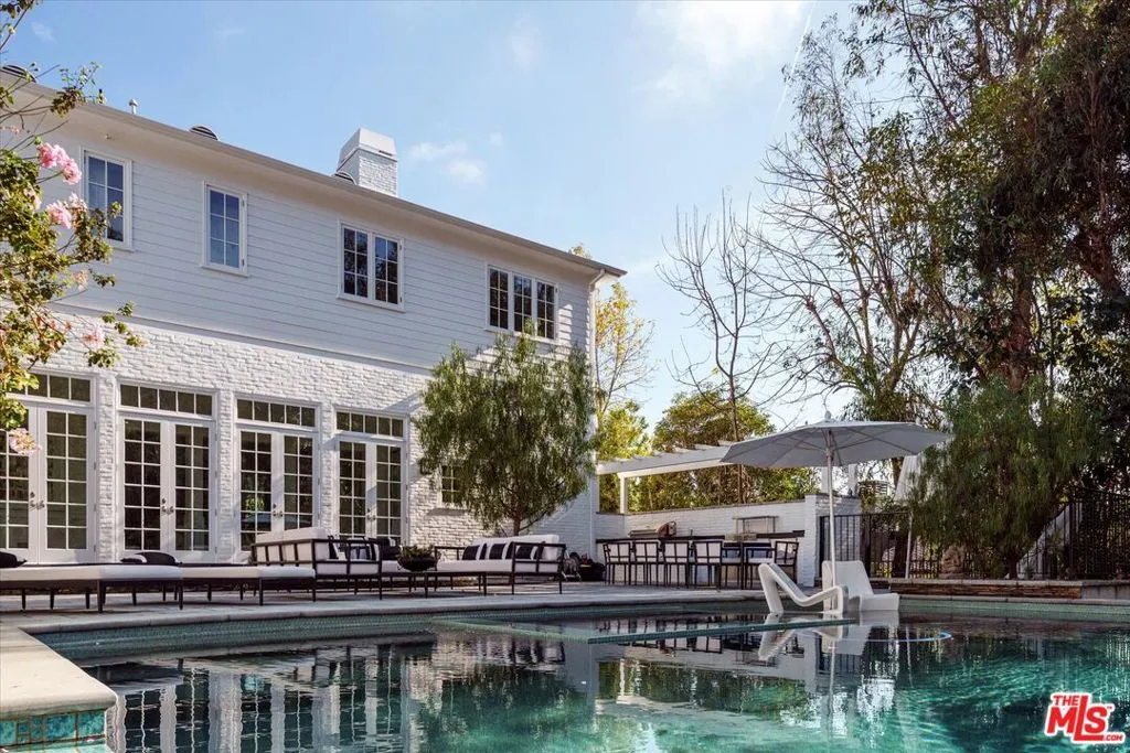 Nestled behind private gates, this traditional estate showcases timeless elegance and modern comfort. A spacious motor court with room for 12+ cars sets the tone for luxury upon arrival along with a 3-car garage and direct access to the property. Inside, the foyer features stunning Honed gray and white marble floors and leads to the formal dining room and a grand living room adorned with a fireplace, and built-ins. Expansive floor-to-ceiling French doors flood the home with natural light, creating a bright and inviting atmosphere throughout and allowing for a view of greenery out to the back garden. The chef’s kitchen is a culinary dream, equipped with top-of-the-line Miele appliances, dual SubZero drawer fridge and pro-glass front fridge, dual sinks, a 6-burner stove with griddle, two dishwashers, a microwave steam oven, wine refrigerator, a walk-in pantry, and a center island with a breakfast bar. The kitchen also features beautiful French doors that lead out to the patio which create the perfect space for outdoor dining. Adjacent, the family room offers a cozy fireplace, ample lounging space, and a bar for entertaining, all highlighted by an oversized bay window that seamlessly blends classic charm with contemporary design. The main level also includes a refined office/library with a wet bar and a comfortable guest suite. Upstairs, the primary suite impresses with a high ceiling and Juliet balcony overlooking the garden. The primary bath features dual sinks, a large walk-in shower with dual shower heads, two walk-in closets, a vanity area, and a separate soaking tub with peek-a-boo views of the Getty Museum. Upstairs you’ll also find four additional en-suite guest bedrooms each with their own special view of the property. Outside, the estate boasts an infinity pool, with an outdoor kitchen and grill perfect for entertaining. Additionally, there’s a lush grassy area, room for a vegetable garden, chicken coop, and an additional outdoor dining area that creates an idyllic space for summer dinners and outdoor family play.