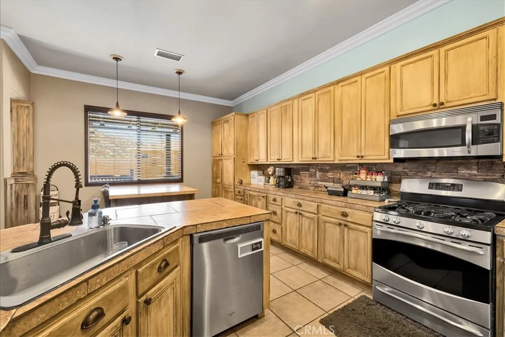 The open floor plan is perfect for both everyday living and entertaining. A formal dining area complements the spacious living room, while the well-appointed kitchen flows seamlessly into the main gathering spaces. Unique finishes on the cabinetry and doors enhance the home’s distinctive style.