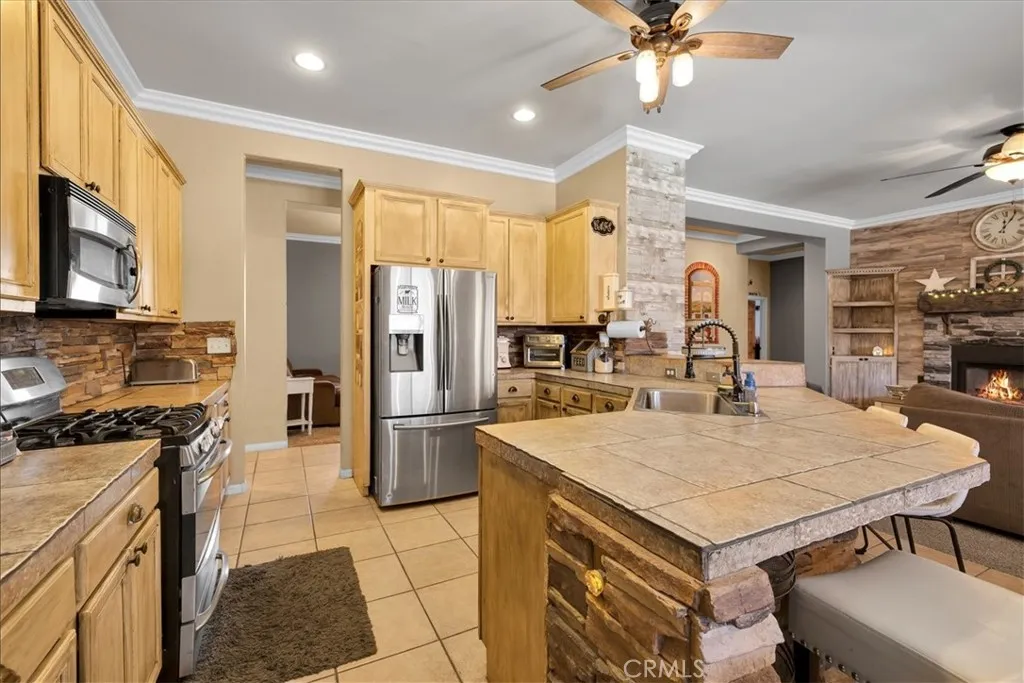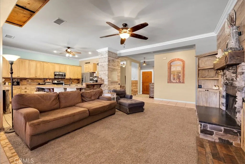 Warmth, character, and comfort define this beautifully appointed home in the desirable Country Club area of Yucca Valley. Offering 2,225 square feet of thoughtfully designed living space, this residence blends rich wood accents, stone elements, and custom finishes to create an inviting western-inspired aesthetic ideal for desert living.