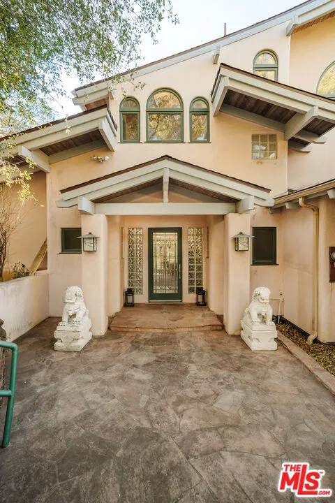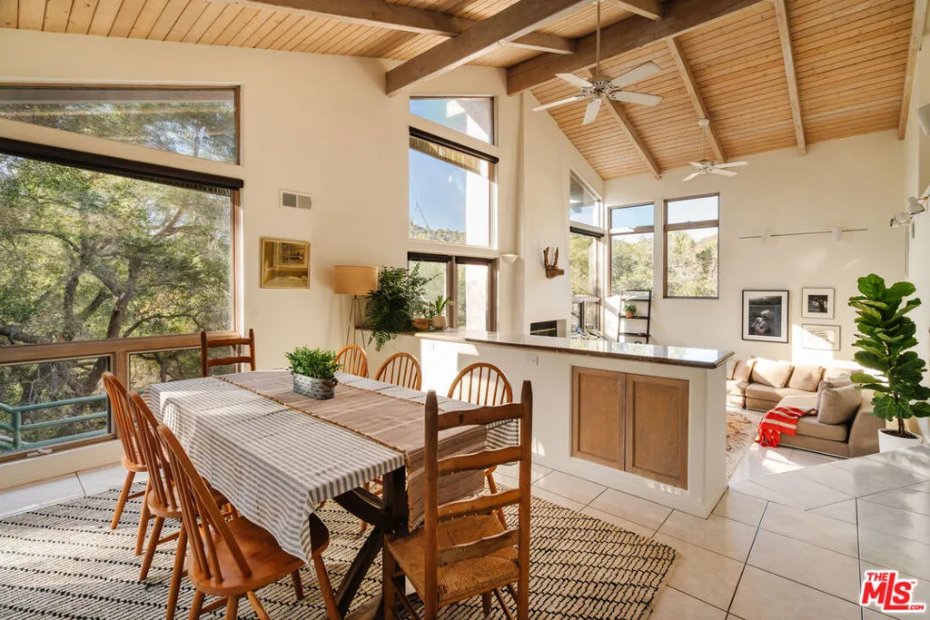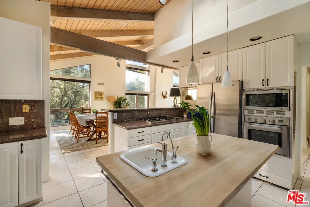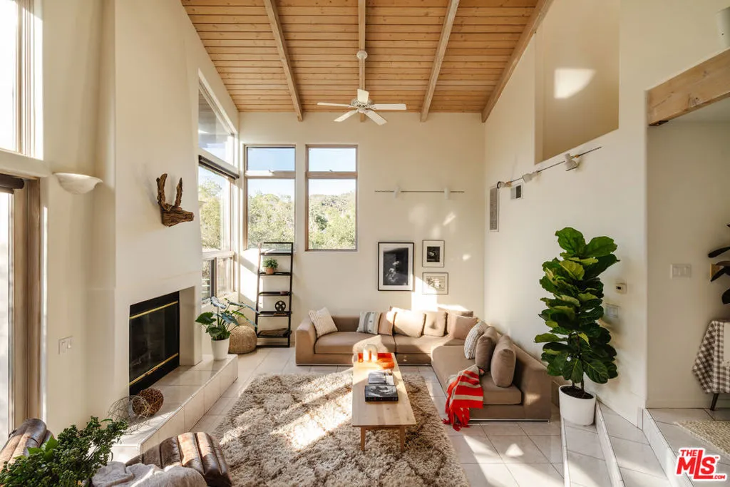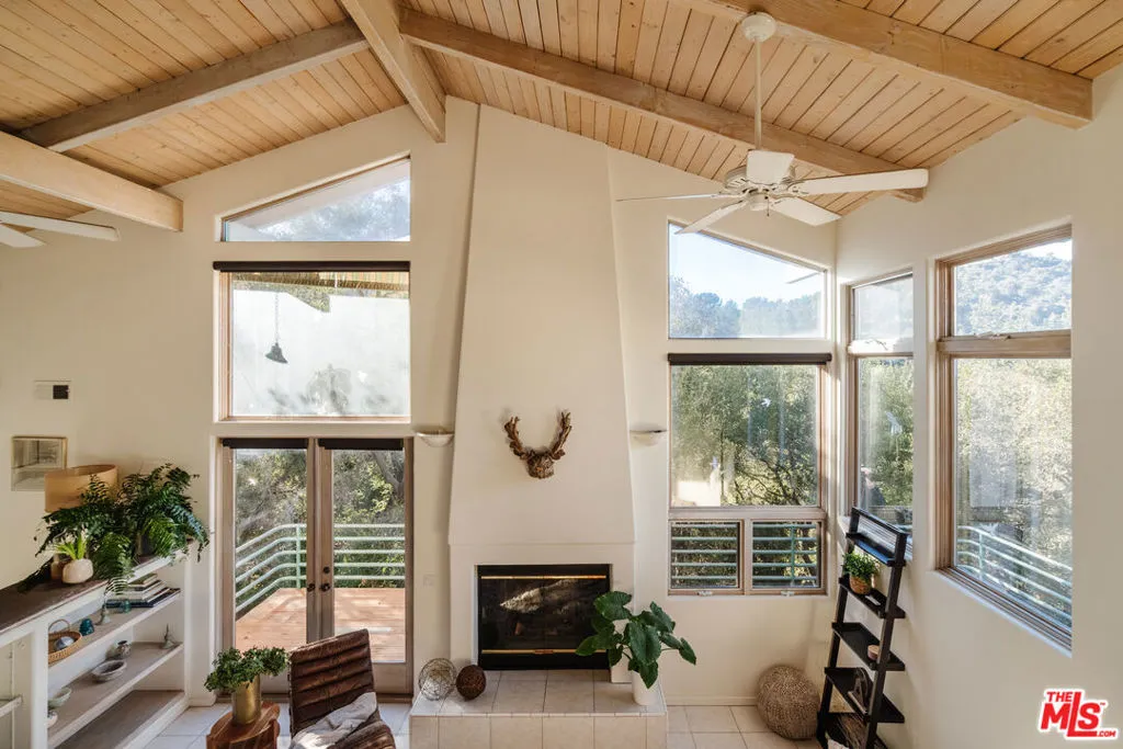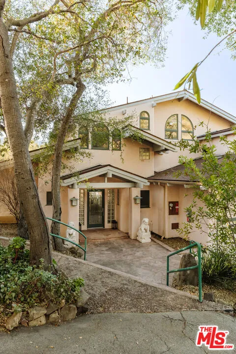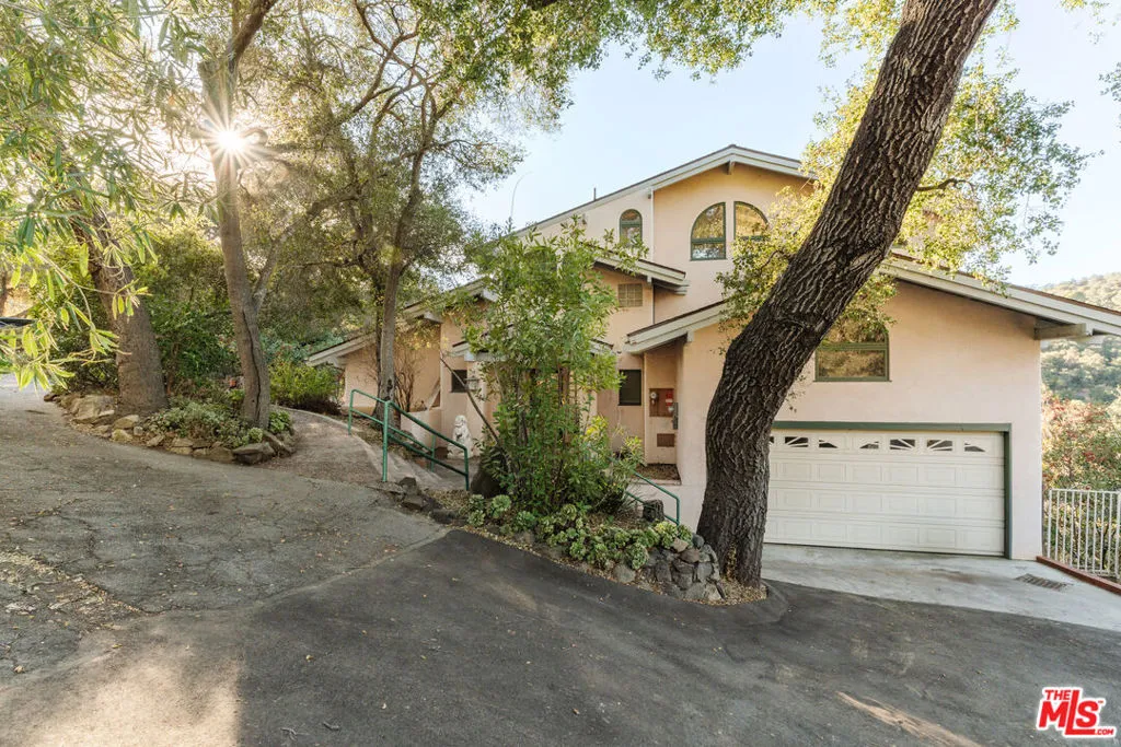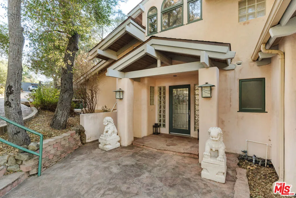 Welcome to 229 Muerdago Road, a stunning Spanish-style retreat nestled in the peaceful and historic Post Office Tract of Topanga Canyon. This spacious 2,580 sq. ft. home spans three stories and offers 3 bedrooms, 3.5 baths, and a versatile bonus space, blending elegant design with serene canyon living. Step inside through the inviting entryway and discover the heart of the home: an open, sunken living room with soaring ceilings, a central fireplace, and an abundance of natural light streaming through large windows. The seamless flow between the living, kitchen, and dining areas creates the perfect layout for both everyday living and entertaining. French doors lead out to expansive wraparound decks, featuring a built-in BBQ and plenty of space to host gatherings or simply relax while surrounded by the majestic beauty of the coastal live oak trees. The top level is dedicated to the luxurious primary suite, featuring a large walk-in closet, an ensuite bathroom with an oversized soaking tub, and a private deck with sweeping canyon views, the perfect place for evening sunsets.