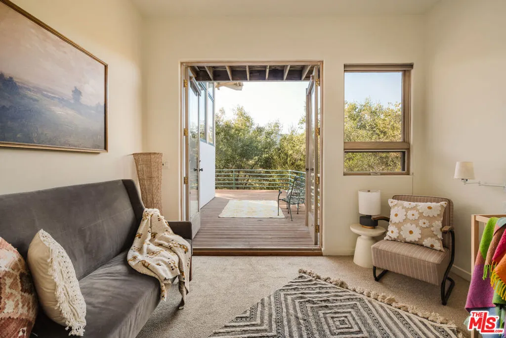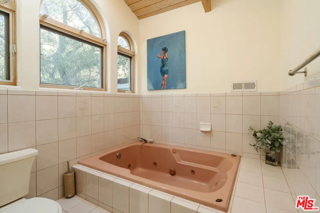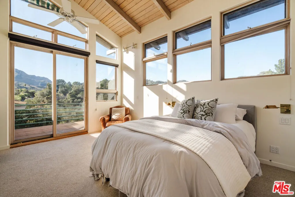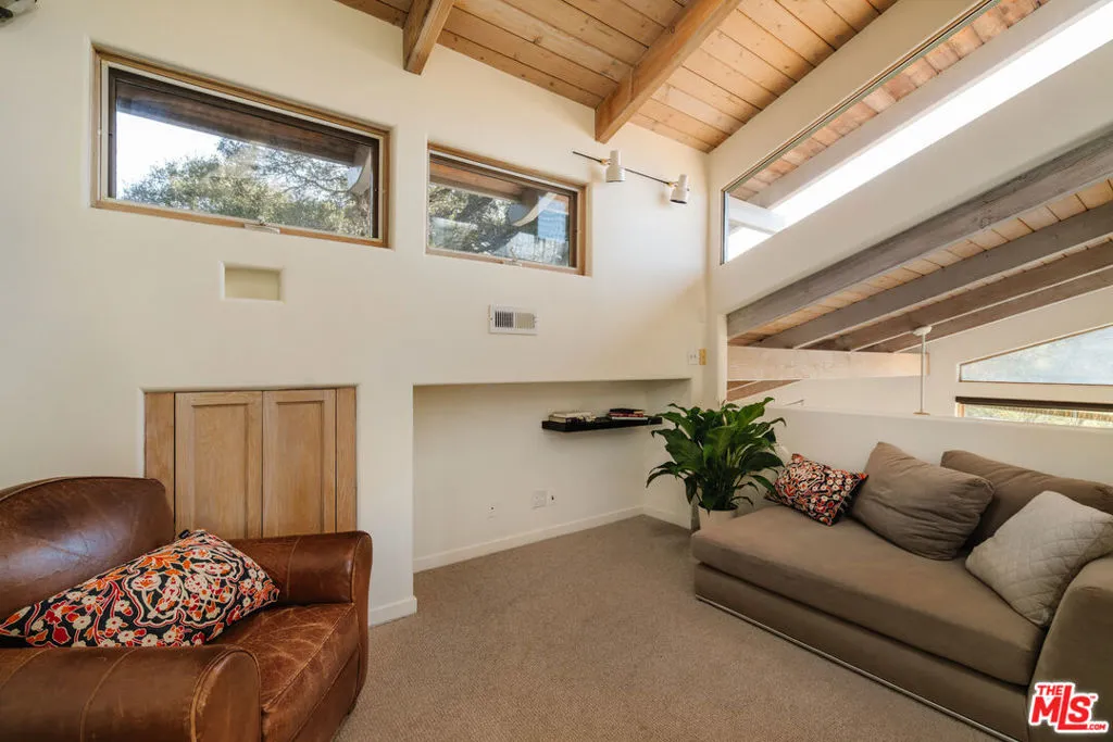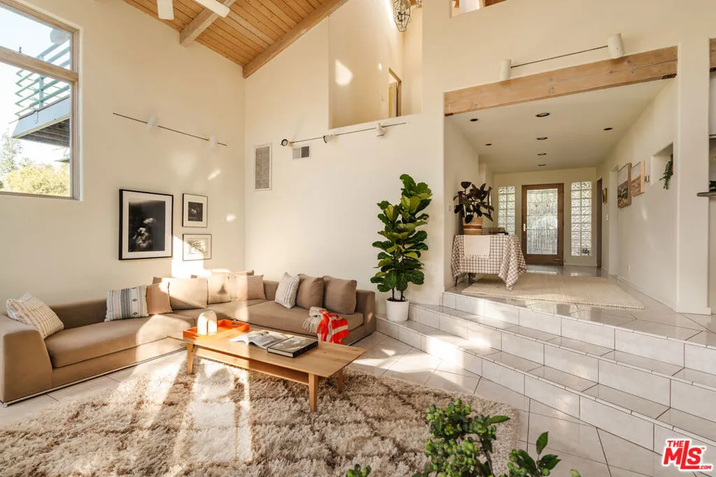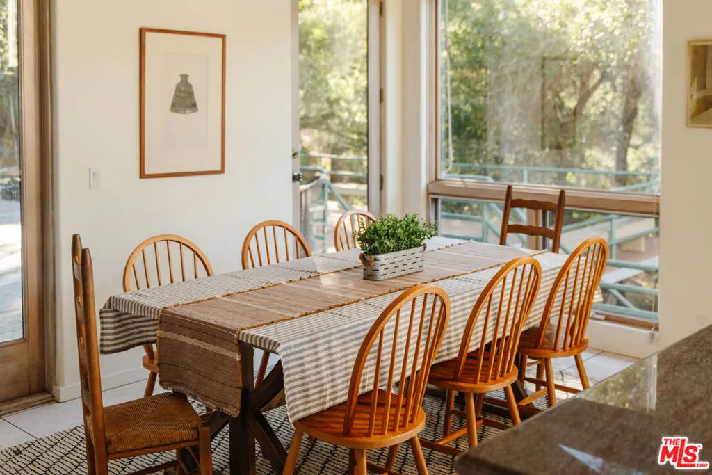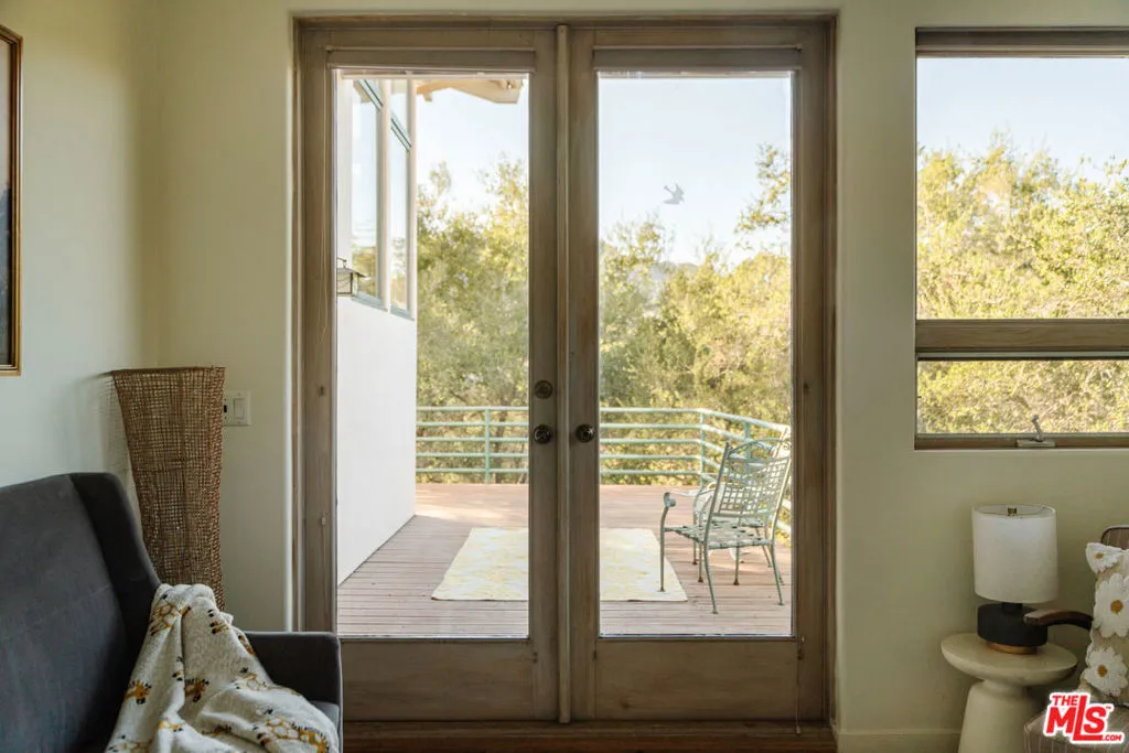 Welcome to 229 Muerdago Road, a stunning Spanish-style retreat nestled in the peaceful and historic Post Office Tract of Topanga Canyon. This spacious 2,580 sq. ft. home spans three stories and offers 3 bedrooms, 3.5 baths, and a versatile bonus space, blending elegant design with serene canyon living. Step inside through the inviting entryway and discover the heart of the home: an open, sunken living room with soaring ceilings, a central fireplace, and an abundance of natural light streaming through large windows. The seamless flow between the living, kitchen, and dining areas creates the perfect layout for both everyday living and entertaining. French doors lead out to expansive wraparound decks, featuring a built-in BBQ and plenty of space to host gatherings or simply relax while surrounded by the majestic beauty of the coastal live oak trees. The top level is dedicated to the luxurious primary suite, featuring a large walk-in closet, an ensuite bathroom with an oversized soaking tub, and a private deck with sweeping canyon views, the perfect place for evening sunsets.