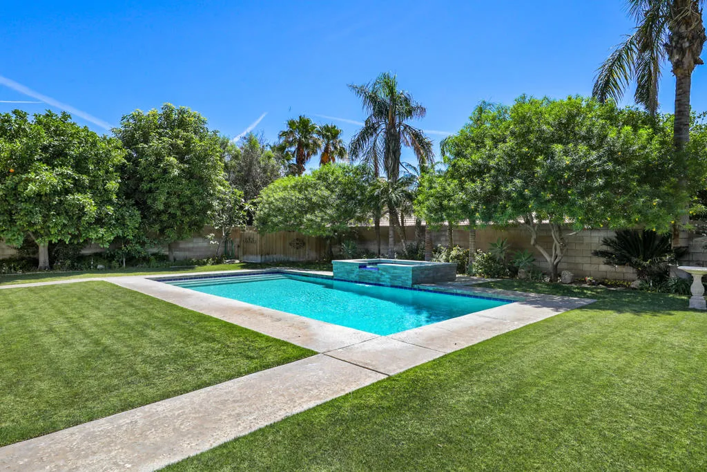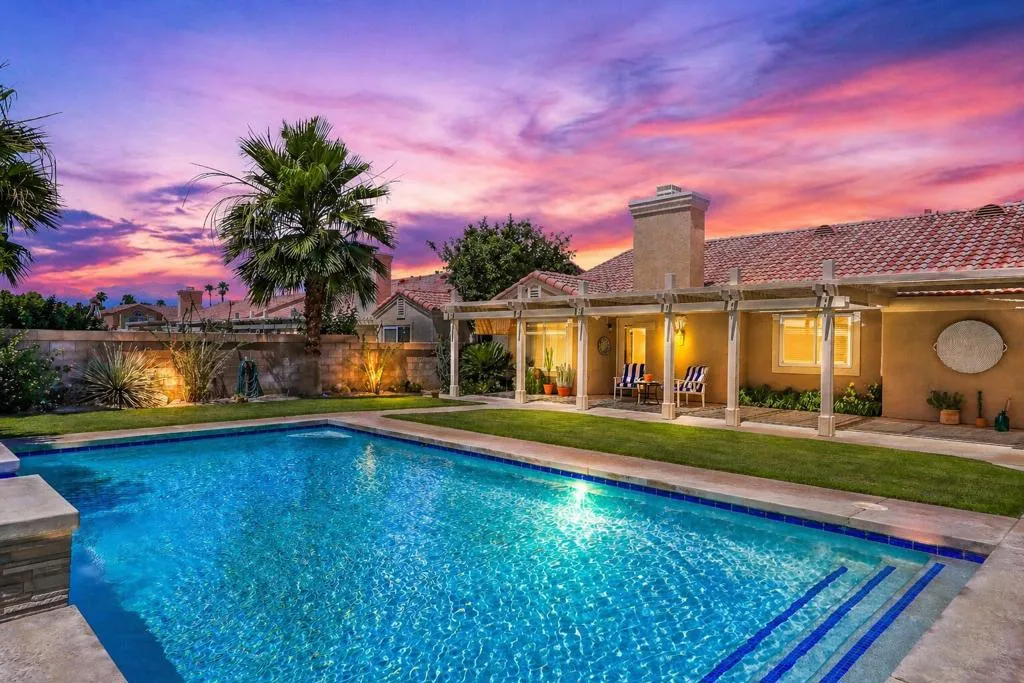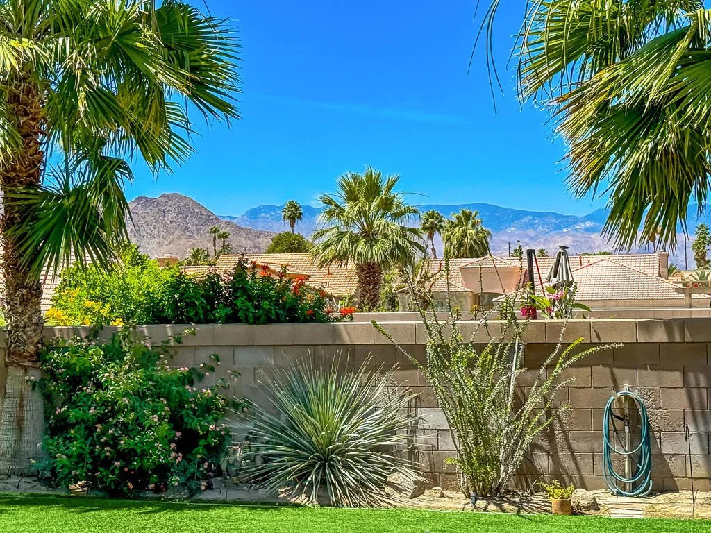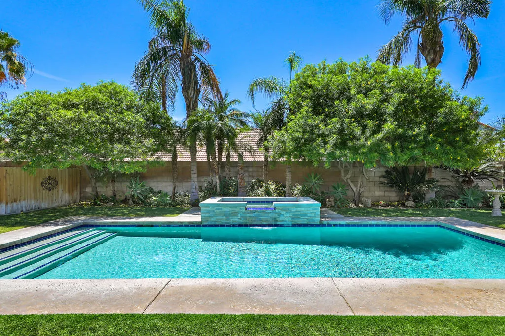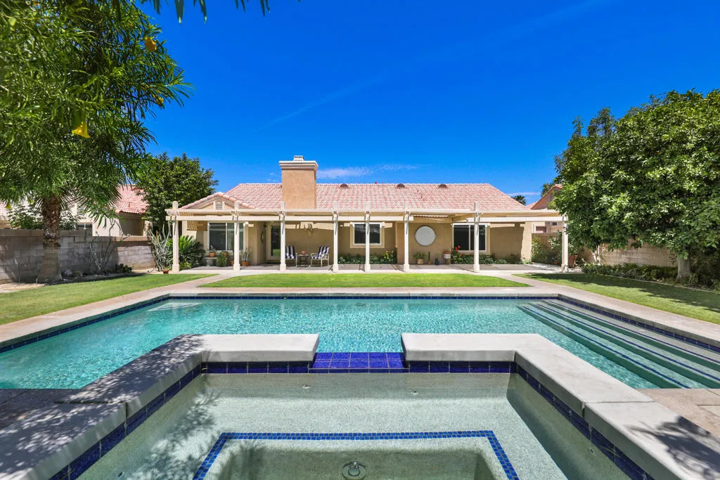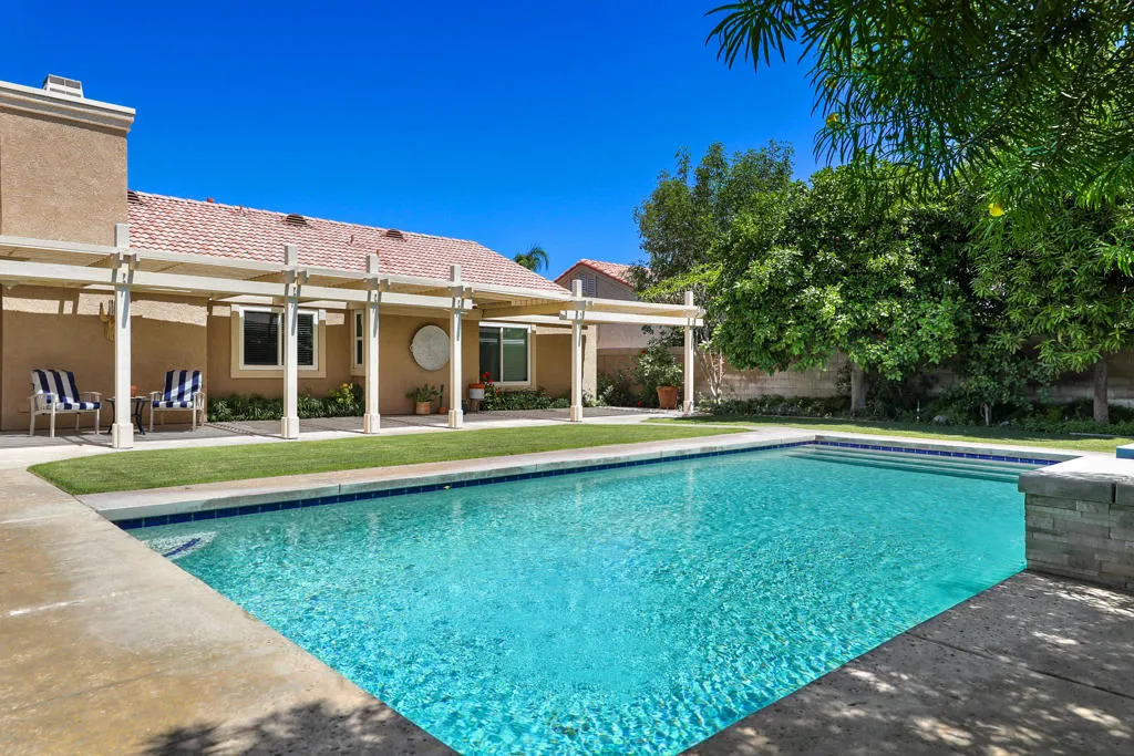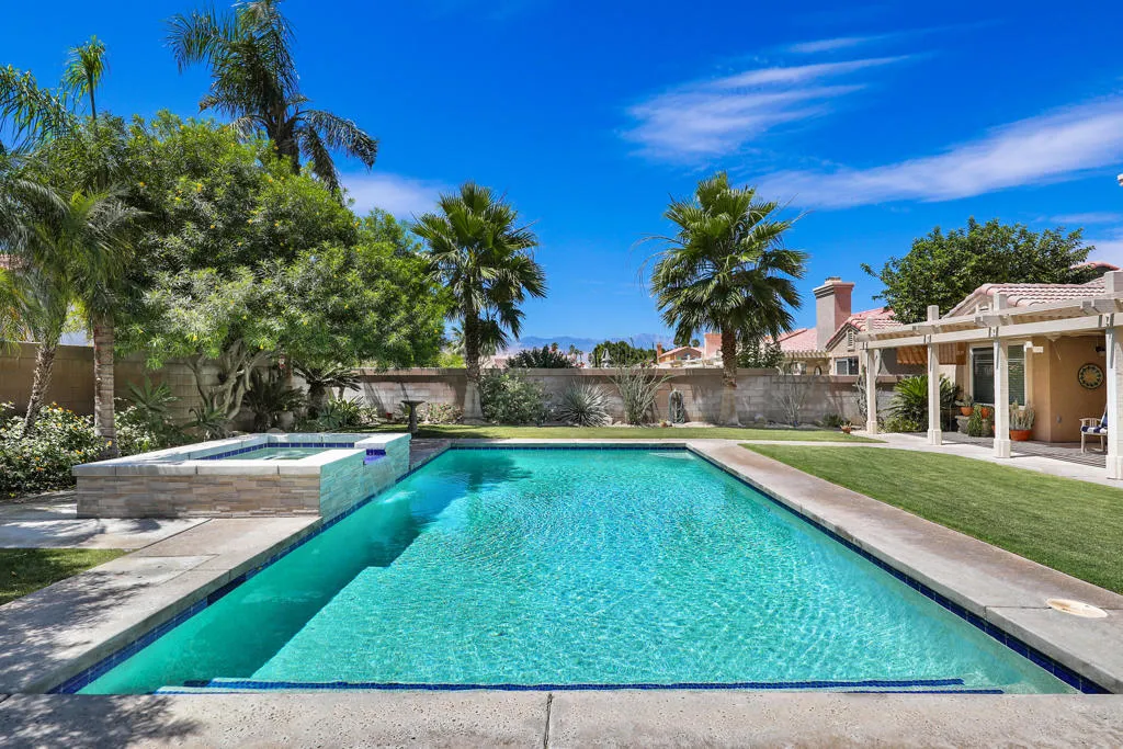 Highly sought-after gorgeous home in the Topaz neighborhood conveniently located within walking distance to prestigious International Baccalaureate (IB) schools: Amelia Earhart Elementary, John Glenn Middle School and La Quinta High School. Designed for entertaining and everyday enjoyment, the recently upgraded PebbleTech saltwater pool and spa is the centerpiece of a beautiful back yard oasis. Updated pool pump, filter, heater, LED lighting, and pool chiller. Enjoy the dramatic mountain views and the lush landscaping and mature fruit trees in the expansive yard. This house was remodeled with Saltillo tile flooring throughout. Both bathrooms were totally renovated with walk-in shower, deep soaking tub, and spectacular tile and counter work. All windows were replaced, new shutters / blinds, upgraded 200A electrical panel, new attic fan, EV Charger. The living and dining room leads into an expansive family room with cathedral ceilings and lots of natural light. The upgraded kitchen area is complete with new appliances, center island and convenient breakfast nook, as well as granite counter tops. Wonderful neighborhood with no HOA dues. Perfect for a family, as a vacation home, or an investment / rental opportunity. This home sells itself.