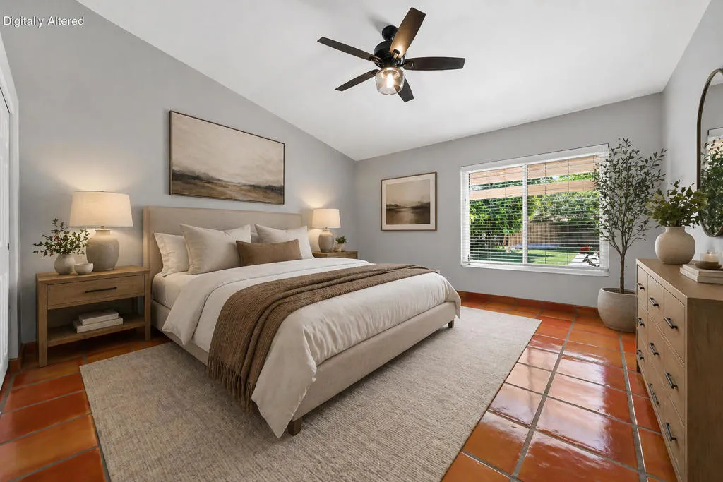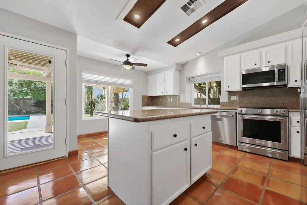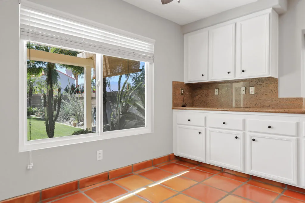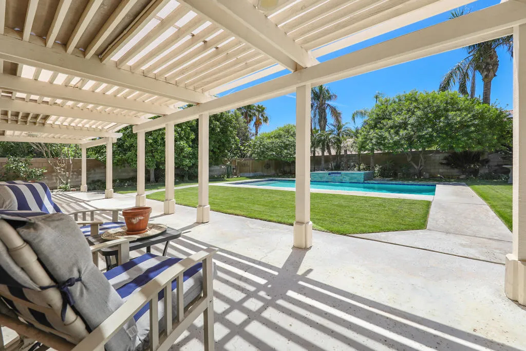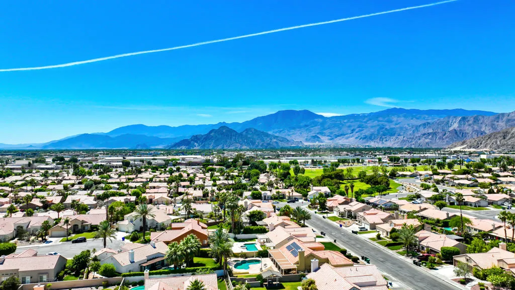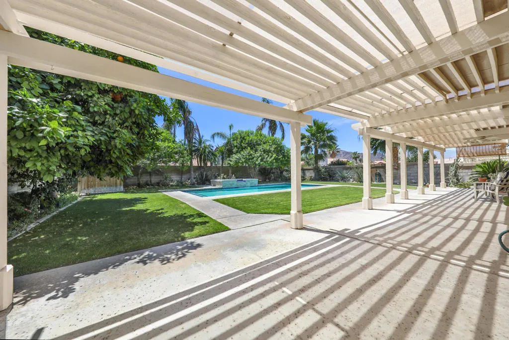 Highly sought-after gorgeous home in the Topaz neighborhood conveniently located within walking distance to prestigious International Baccalaureate (IB) schools: Amelia Earhart Elementary, John Glenn Middle School and La Quinta High School. Designed for entertaining and everyday enjoyment, the recently upgraded PebbleTech saltwater pool and spa is the centerpiece of a beautiful back yard oasis. Updated pool pump, filter, heater, LED lighting, and pool chiller. Enjoy the dramatic mountain views and the lush landscaping and mature fruit trees in the expansive yard. This house was remodeled with Saltillo tile flooring throughout. Both bathrooms were totally renovated with walk-in shower, deep soaking tub, and spectacular tile and counter work. All windows were replaced, new shutters / blinds, upgraded 200A electrical panel, new attic fan, EV Charger. The living and dining room leads into an expansive family room with cathedral ceilings and lots of natural light. The upgraded kitchen area is complete with new appliances, center island and convenient breakfast nook, as well as granite counter tops. Wonderful neighborhood with no HOA dues. Perfect for a family, as a vacation home, or an investment / rental opportunity. This home sells itself.