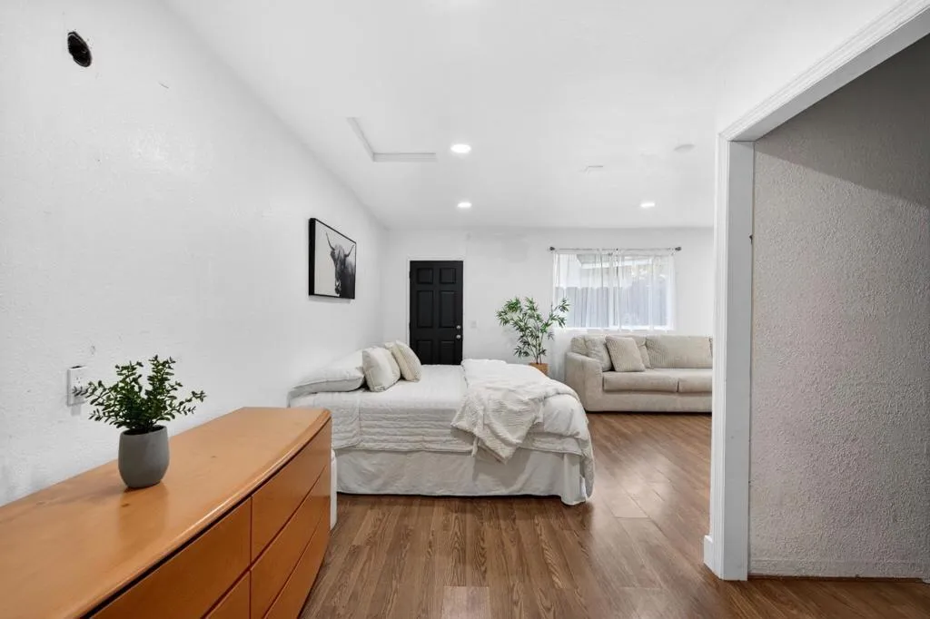 You don’t want to miss this beautiful home! Featuring 3 bedrooms, 2 full bathrooms, and over 1,155 sq ft of living space on a huge 6,416 sq ft lot! Highlights include: Bonus storage room (unpermitted) Garage converted into a studio (unpermitted) perfect for multi-family living or extra income potential Freshly painted interior & exterior Remodeled kitchen with granite countertops & tile backsplash New laminate hardwood flooring New central heating with brand new furnace & water heater Crown molding throughout Double-pane windows Newly landscaped front yard with stamped concrete in both front & backyard The spacious backyard is a perfect blank canvas to create your very own private oasis! Prime location! Walking distance to McCarthy Park, nearby shopping centers, and easy access to Highways 25 & 156 perfect for commuters! Dont wait this one wont last!