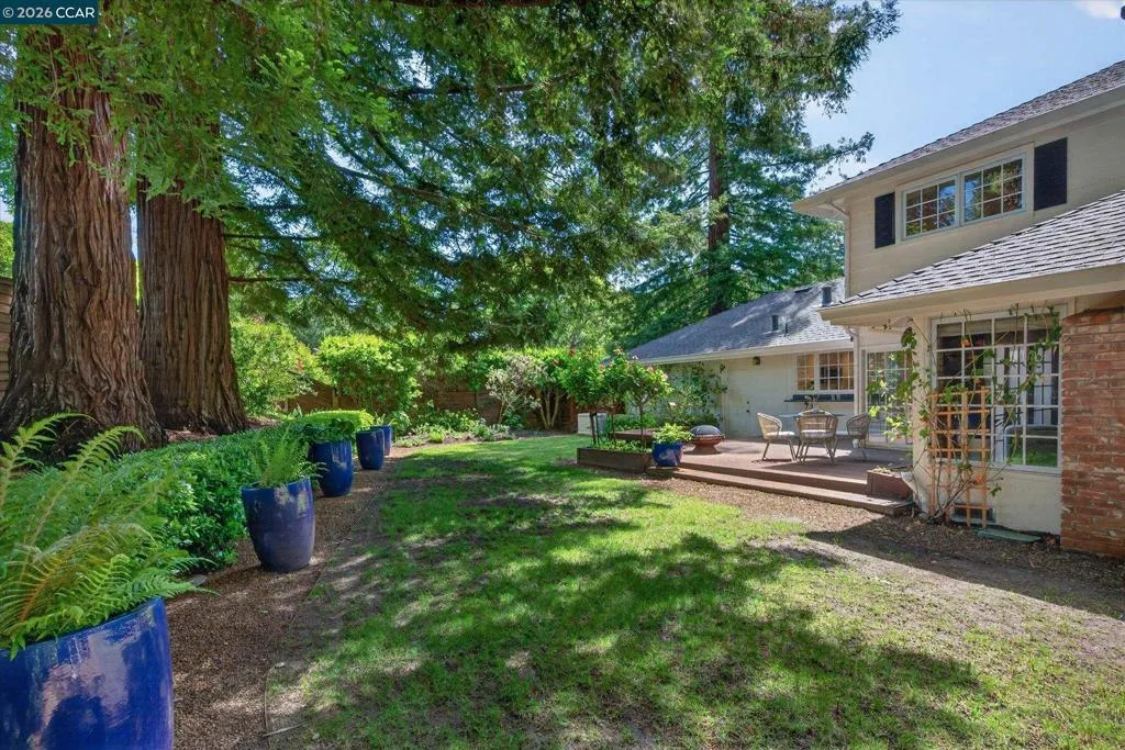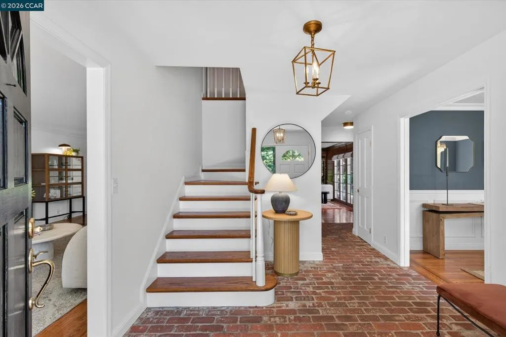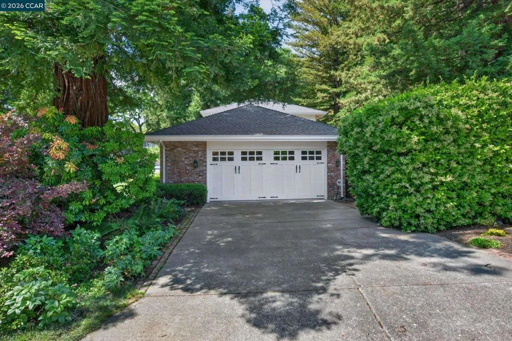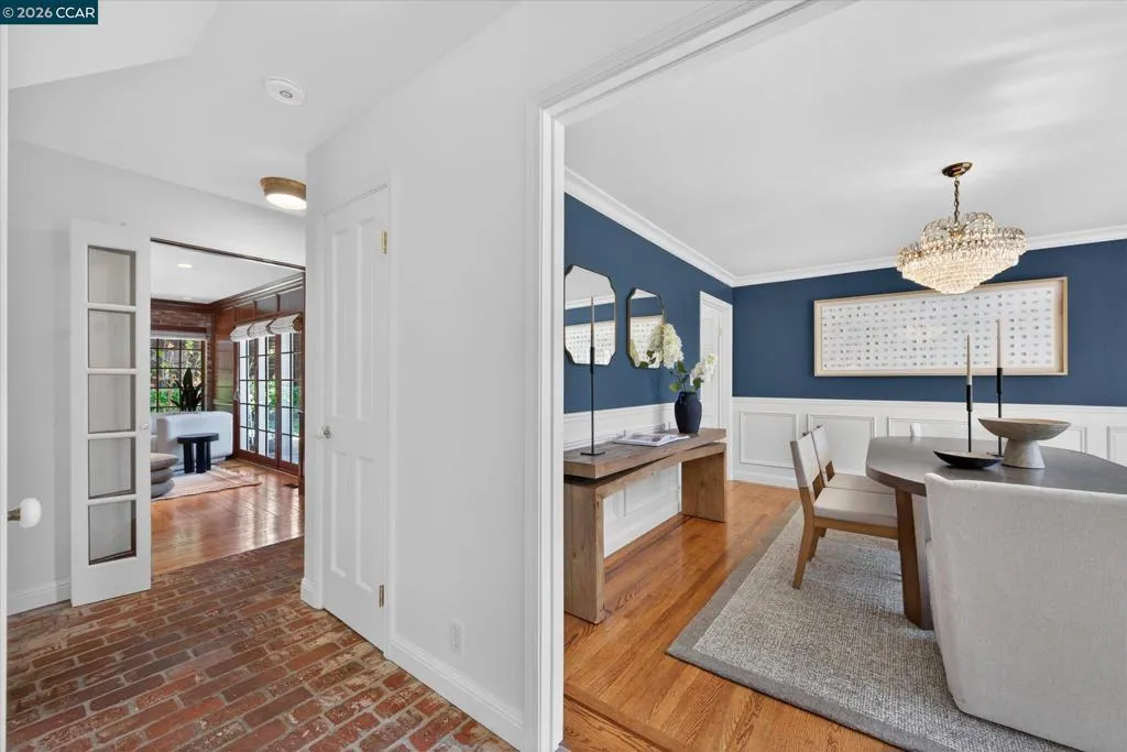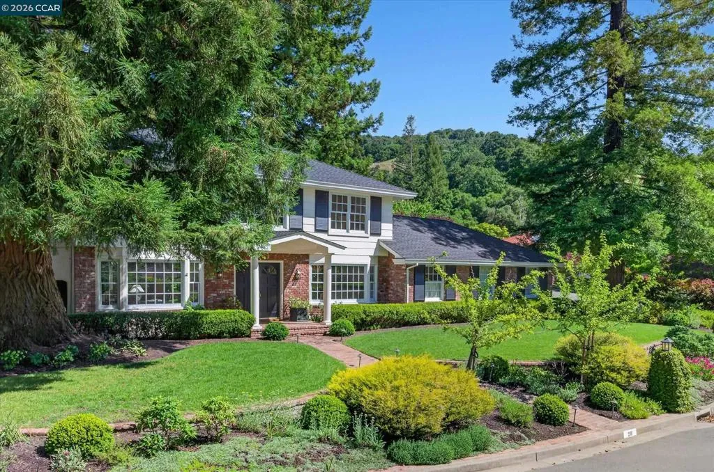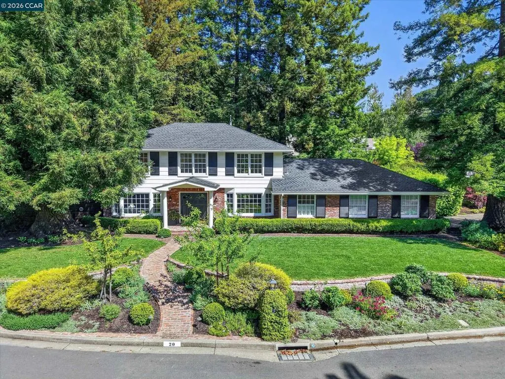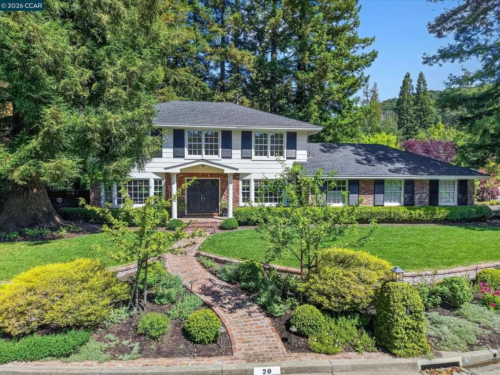 From the moment you arrive, 20 Coachwood Terrace makes an impression — a winding brick path through manicured gardens leads to a stately white and brick Traditional framed by towering redwoods. Inside, original brick entry floors and a gold lantern pendant open to a gracious floor plan filled with light and detail. The formal living room features a white-mantled fireplace and garden-view windows, while the wood-paneled family room with brick fireplace and French doors is perfect for easy entertaining. A crystal-chandelier dining room with paneled wainscoting and bay window dazzles, and the bright white kitchen offers stainless appliances and garden views. A sunny breakfast nook opens to the deck and rear yard for seamless indoor-outdoor living. The expansive primary suite offers treetop views and a spa-like bath with double granite vanity and glass-enclosed shower. Three additional bedrooms — including one with sweeping hillside views — are served by a second full double-vanity bath. Award-winning Orinda schools, BART access, and Theatre Square minutes away. For more information visit 20caochwoodter
