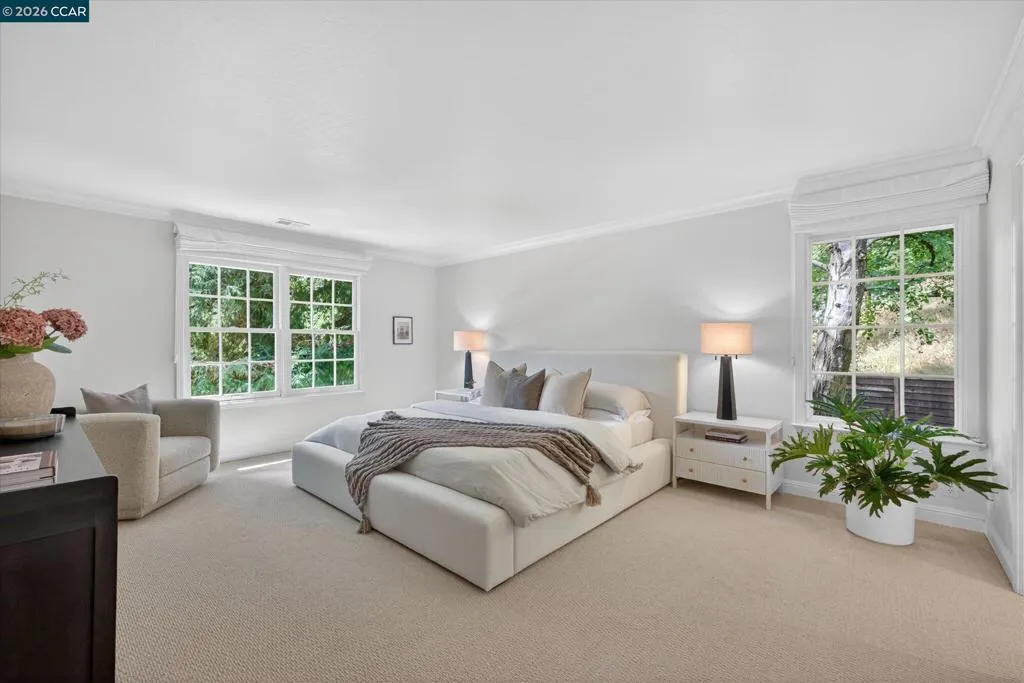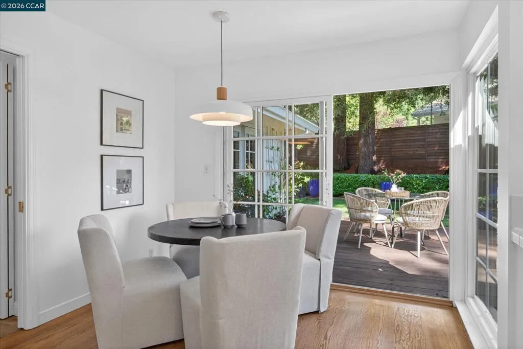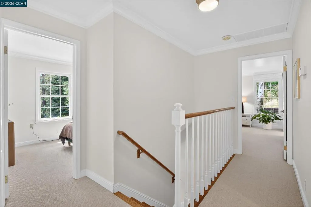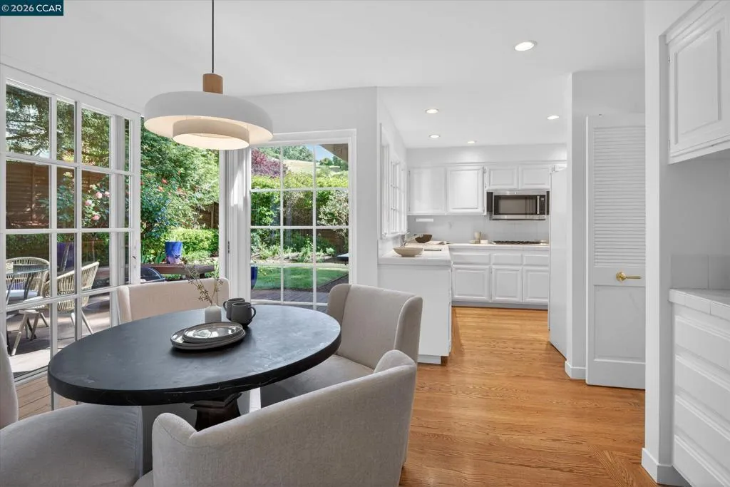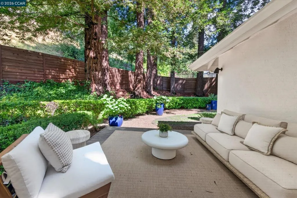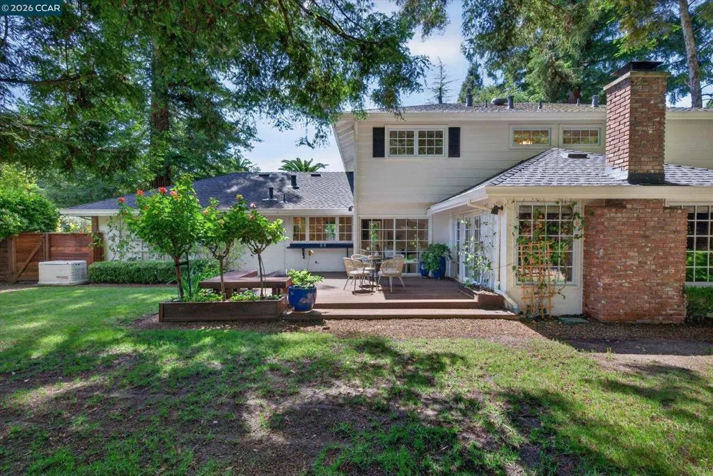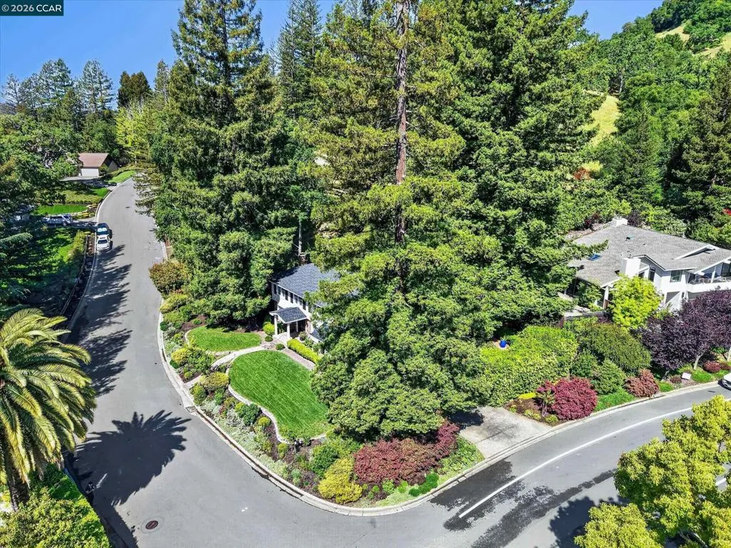 From the moment you arrive, 20 Coachwood Terrace makes an impression — a winding brick path through manicured gardens leads to a stately white and brick Traditional framed by towering redwoods. Inside, original brick entry floors and a gold lantern pendant open to a gracious floor plan filled with light and detail. The formal living room features a white-mantled fireplace and garden-view windows, while the wood-paneled family room with brick fireplace and French doors is perfect for easy entertaining. A crystal-chandelier dining room with paneled wainscoting and bay window dazzles, and the bright white kitchen offers stainless appliances and garden views. A sunny breakfast nook opens to the deck and rear yard for seamless indoor-outdoor living. The expansive primary suite offers treetop views and a spa-like bath with double granite vanity and glass-enclosed shower. Three additional bedrooms — including one with sweeping hillside views — are served by a second full double-vanity bath. Award-winning Orinda schools, BART access, and Theatre Square minutes away. For more information visit 20caochwoodter