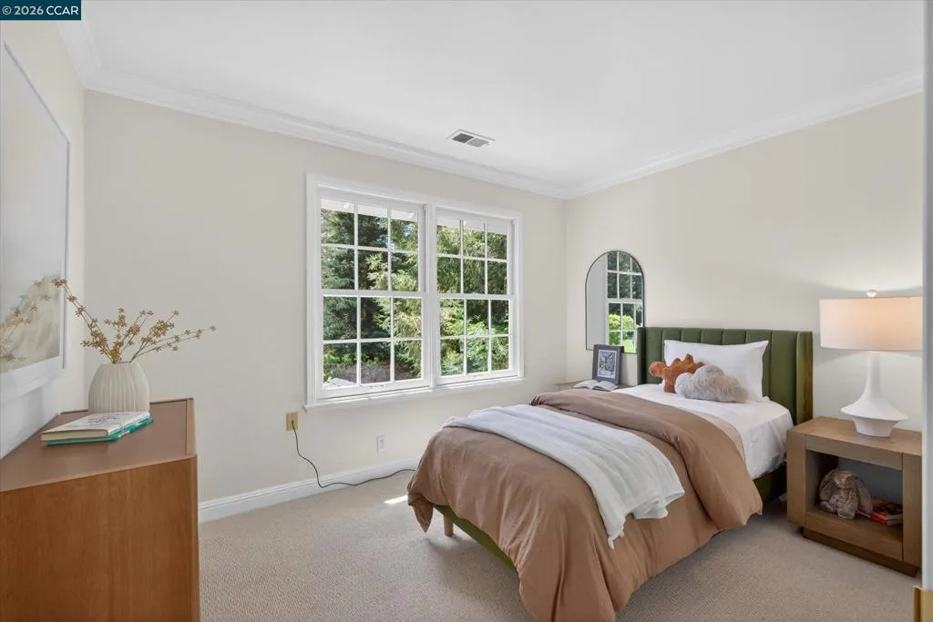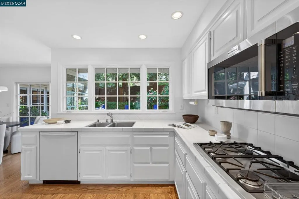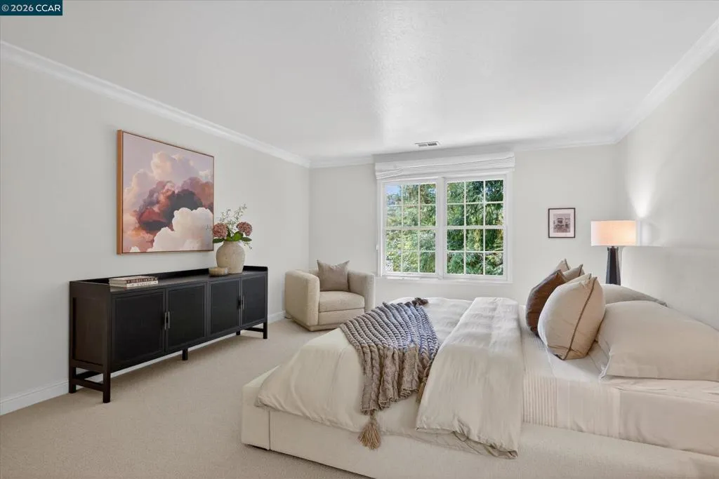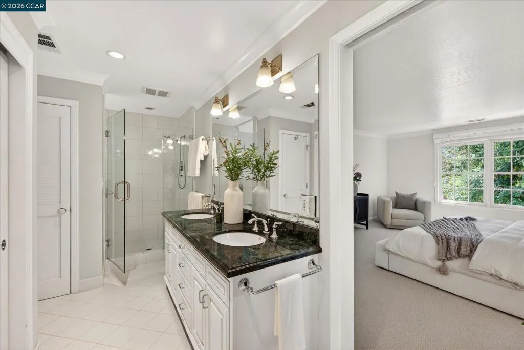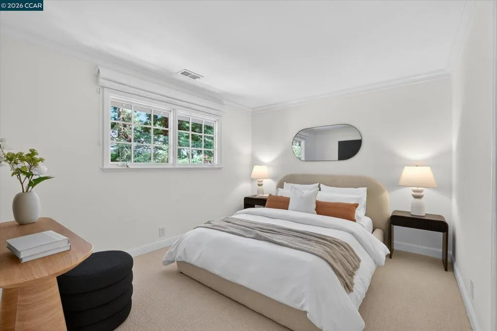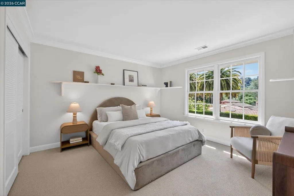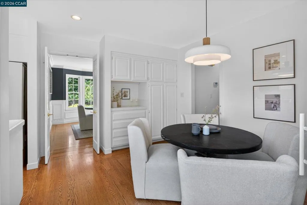 From the moment you arrive, 20 Coachwood Terrace makes an impression — a winding brick path through manicured gardens leads to a stately white and brick Traditional framed by towering redwoods. Inside, original brick entry floors and a gold lantern pendant open to a gracious floor plan filled with light and detail. The formal living room features a white-mantled fireplace and garden-view windows, while the wood-paneled family room with brick fireplace and French doors is perfect for easy entertaining. A crystal-chandelier dining room with paneled wainscoting and bay window dazzles, and the bright white kitchen offers stainless appliances and garden views. A sunny breakfast nook opens to the deck and rear yard for seamless indoor-outdoor living. The expansive primary suite offers treetop views and a spa-like bath with double granite vanity and glass-enclosed shower. Three additional bedrooms — including one with sweeping hillside views — are served by a second full double-vanity bath. Award-winning Orinda schools, BART access, and Theatre Square minutes away. For more information visit 20caochwoodter