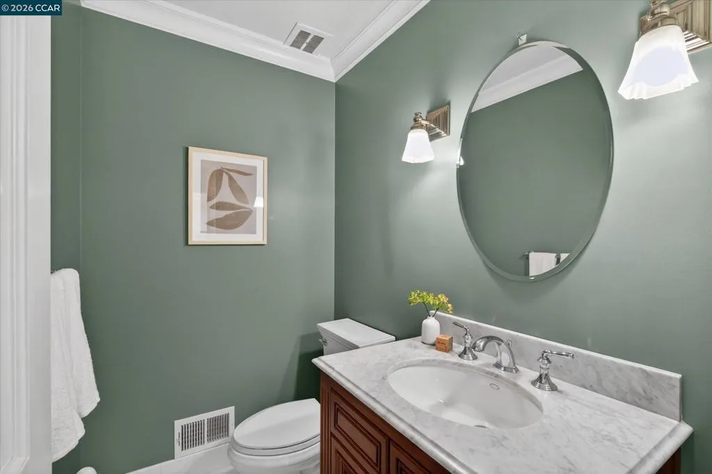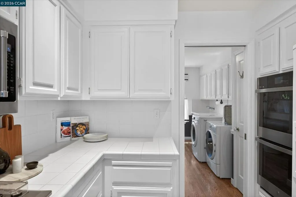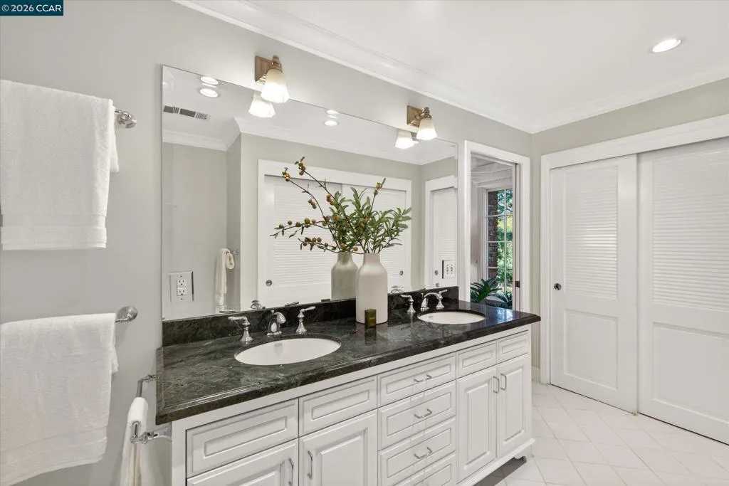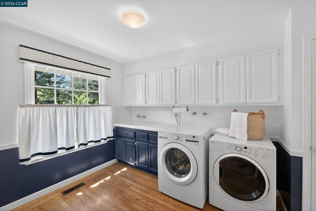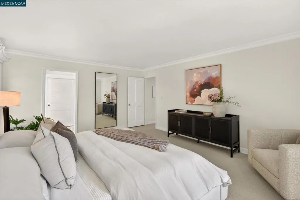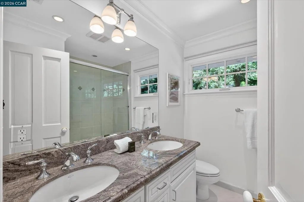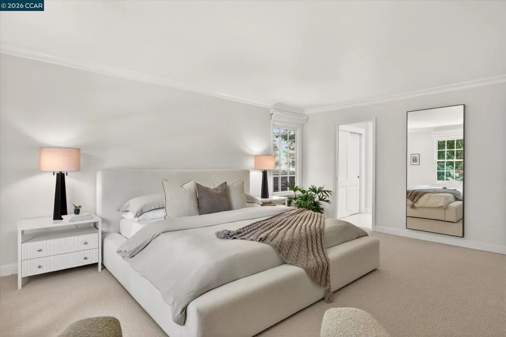 From the moment you arrive, 20 Coachwood Terrace makes an impression — a winding brick path through manicured gardens leads to a stately white and brick Traditional framed by towering redwoods. Inside, original brick entry floors and a gold lantern pendant open to a gracious floor plan filled with light and detail. The formal living room features a white-mantled fireplace and garden-view windows, while the wood-paneled family room with brick fireplace and French doors is perfect for easy entertaining. A crystal-chandelier dining room with paneled wainscoting and bay window dazzles, and the bright white kitchen offers stainless appliances and garden views. A sunny breakfast nook opens to the deck and rear yard for seamless indoor-outdoor living. The expansive primary suite offers treetop views and a spa-like bath with double granite vanity and glass-enclosed shower. Three additional bedrooms — including one with sweeping hillside views — are served by a second full double-vanity bath. Award-winning Orinda schools, BART access, and Theatre Square minutes away. For more information visit 20caochwoodter