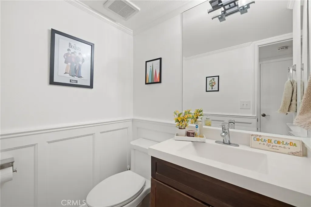 A tastefully updated powder room with designer wainscoting and a convenient coat closet complete the main level.