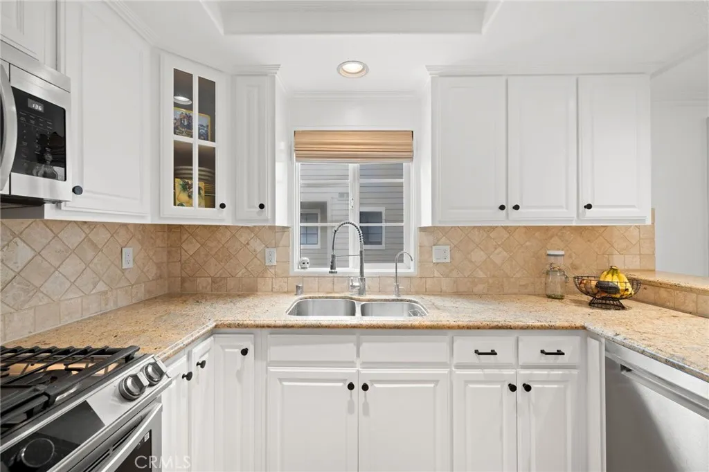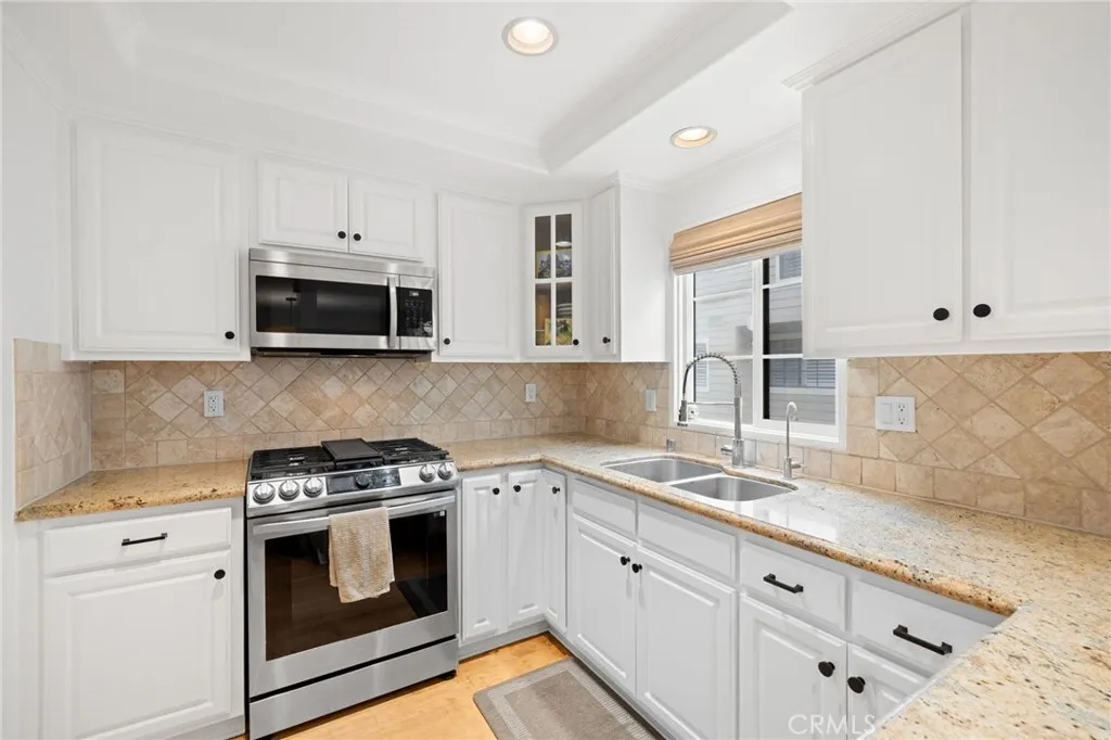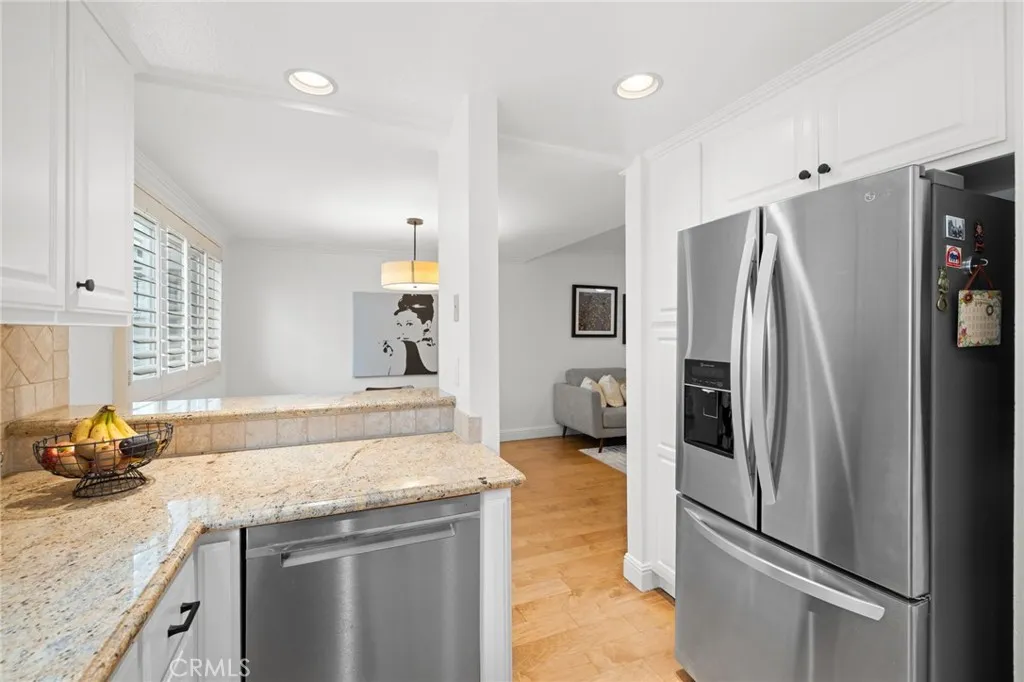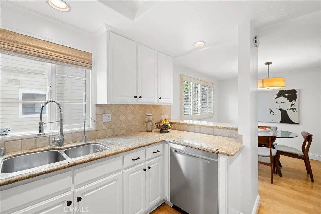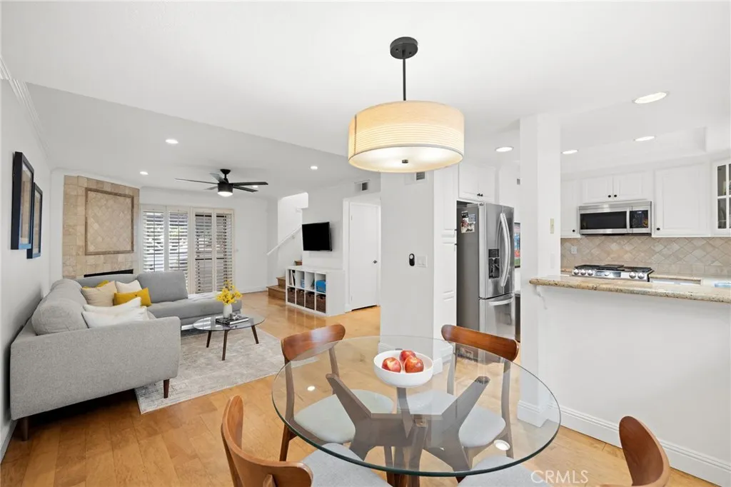 Inside, the open-concept layout is bright and inviting, ideal for hosting gatherings or everyday living. The sunlit living room features rich wood flooring, a beautifully tiled fireplace, and seamless access to the patio. The adjoining dining area flows effortlessly into the kitchen, which is appointed with classic white cabinetry, granite countertops, a stylish tile backsplash, and stainless-steel appliances.