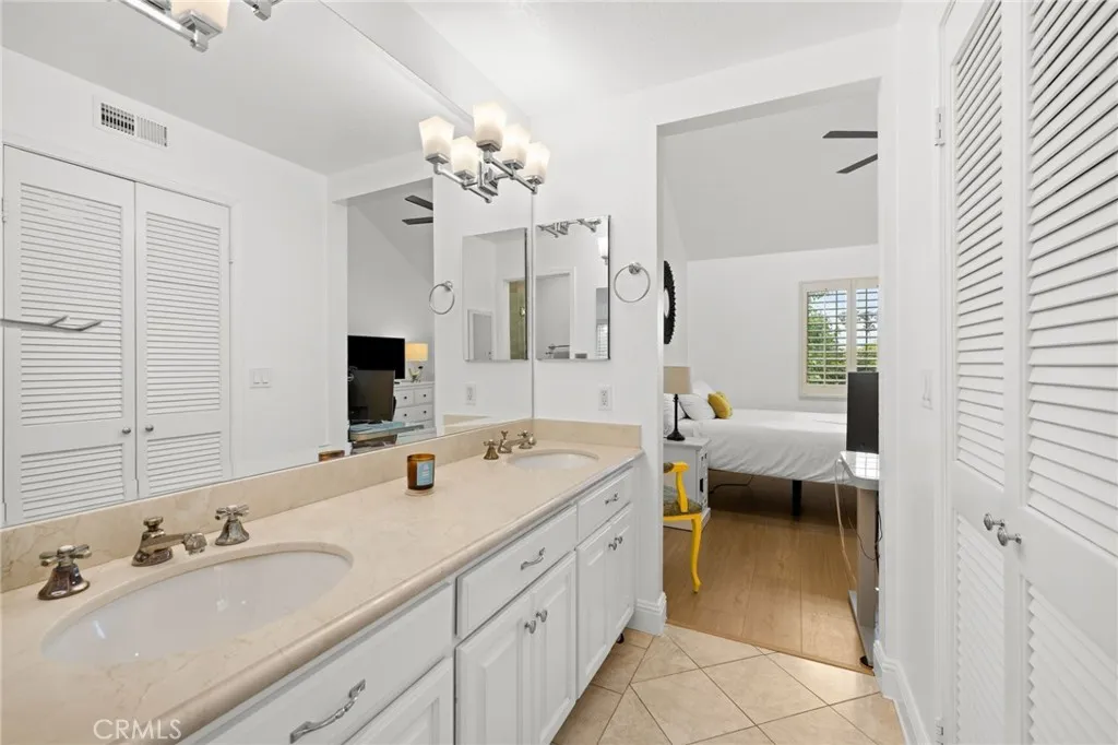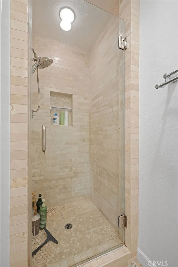 Upstairs, you’ll find two well-appointed bedroom suites. The primary suite offers tranquil treetop views, dual closets, and an en-suite bath with double sinks and a beautifully tiled shower. The second suite features a vaulted ceiling and its own full bath with a shower-tub combination.