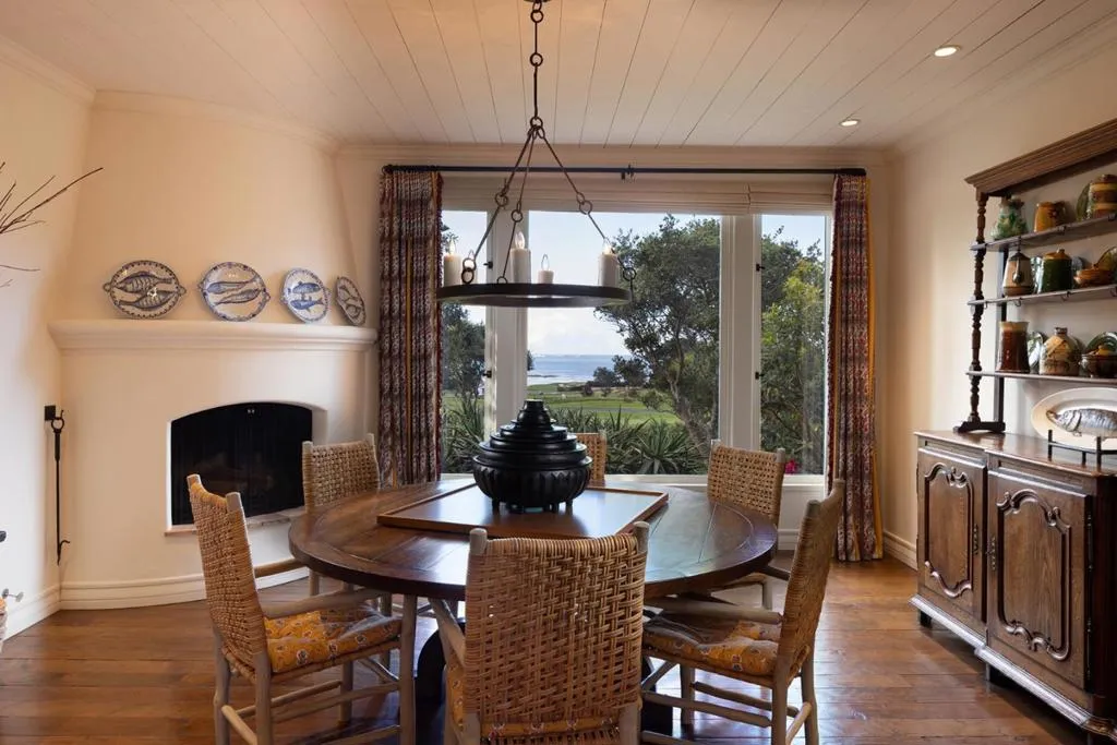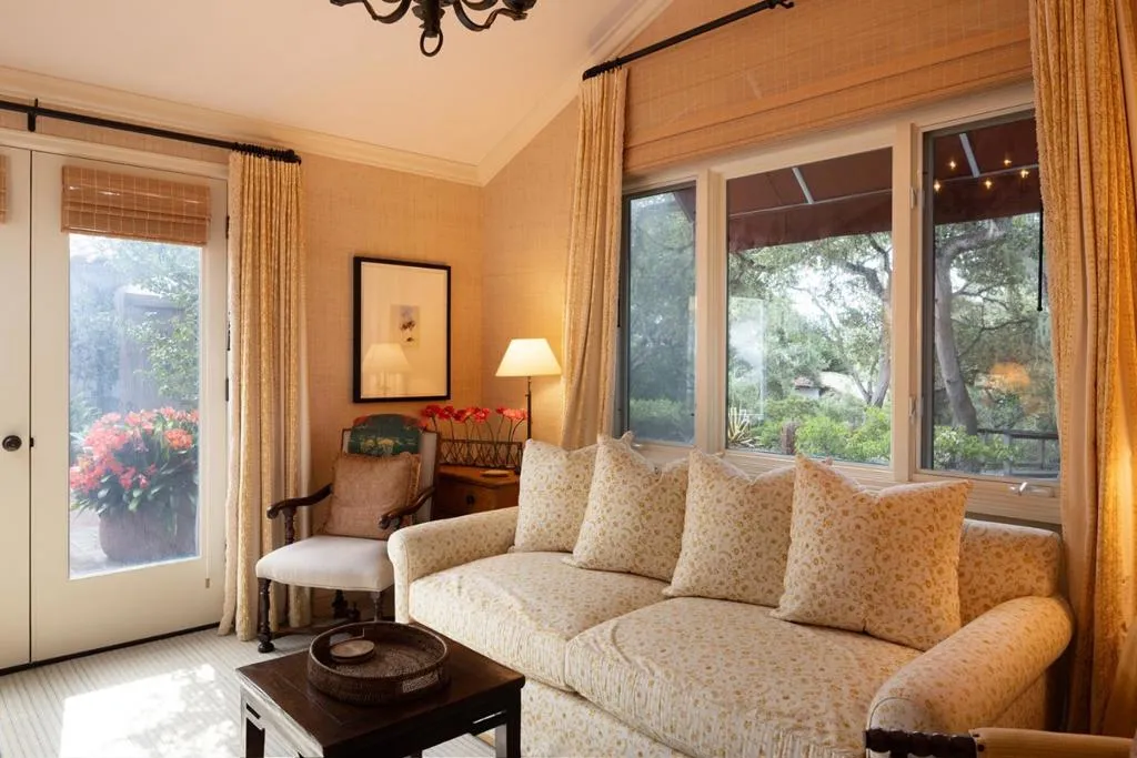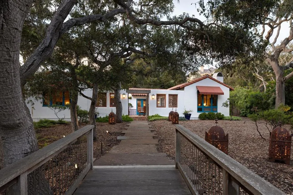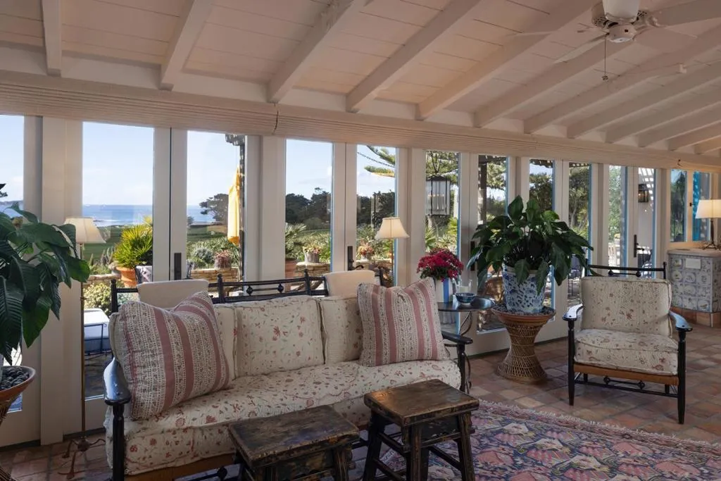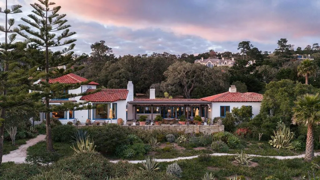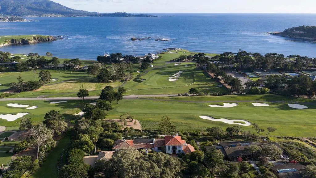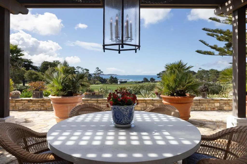 Set on the iconic 2nd fairway of Pebble Beach Golf Links, this timeless, private, 2.35-acre gated estate enjoys sweeping golf course and ocean views and all the amenities of The Lodge and resort just steps away. The 4 bedroom, 4.5-bath main residence spans 4,932 SqFt, featuring views from most rooms, elegant interiors, wood floors, a grand stone fireplace, coffered ceilings, a sunlit garden room, and a chef’s kitchen with Wolf appliances, butcher block island, and a breakfast nook beside a cozy fireplace. The luxurious primary suite features dual baths, walk-in closets, and a soaking tub. A stunning Carmel stone patio with breathtaking views is complete with a pergola and electric shades, while a serene interior courtyard offers Spanish tile, brickwork, and an outdoor fireplace. The beautifully manicured grounds include expansive parking, charming shell paths, and mature landscaping with distinctive monkey puzzle trees. A picturesque bridge over a seasonal stream leads to a private detached ADU with a kitchen, living room, vaulted wood ceilings, and a fireplace, along with two guest bedrooms and a shared bath across a courtyard. This is a truly special property, offering both seclusion and proximity to Pebble Beach’s finest golf, dining, and lifestyle amenities.