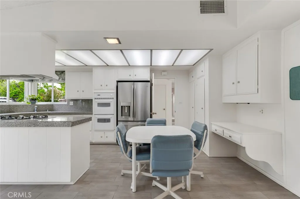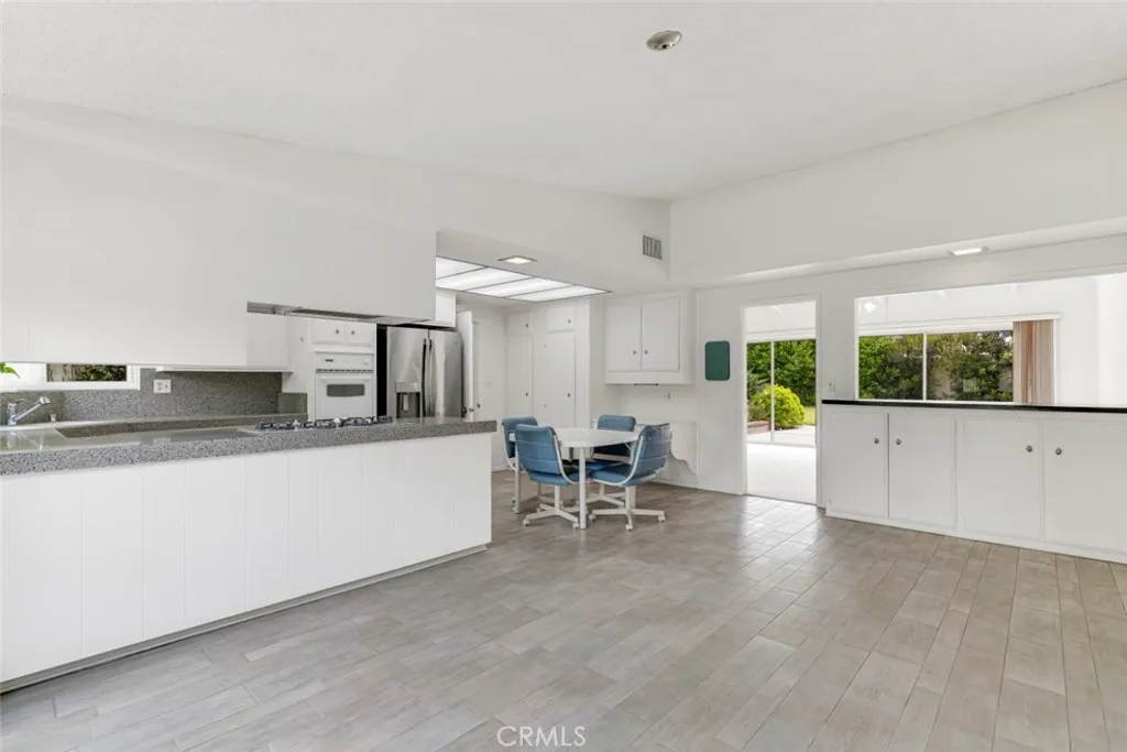 The formal entry opens to an expansive space characterized by vaulted beamed ceilings, and a striking floor-to-ceiling stone fireplace, adding dramatic volume to the formal living and dining areas. Extra-wide sliding glass doors provide an indoor-outdoor flow flood the home with natural light, and lead to the backyard– with multiple options for an outdoor lifestyle. The kitchen and family hub is an open-concept heart of the home featuring white cabinetry, double ovens, granite counters, and a built-in bar which functions as a pass-through or buffet, perfect for modern entertaining.