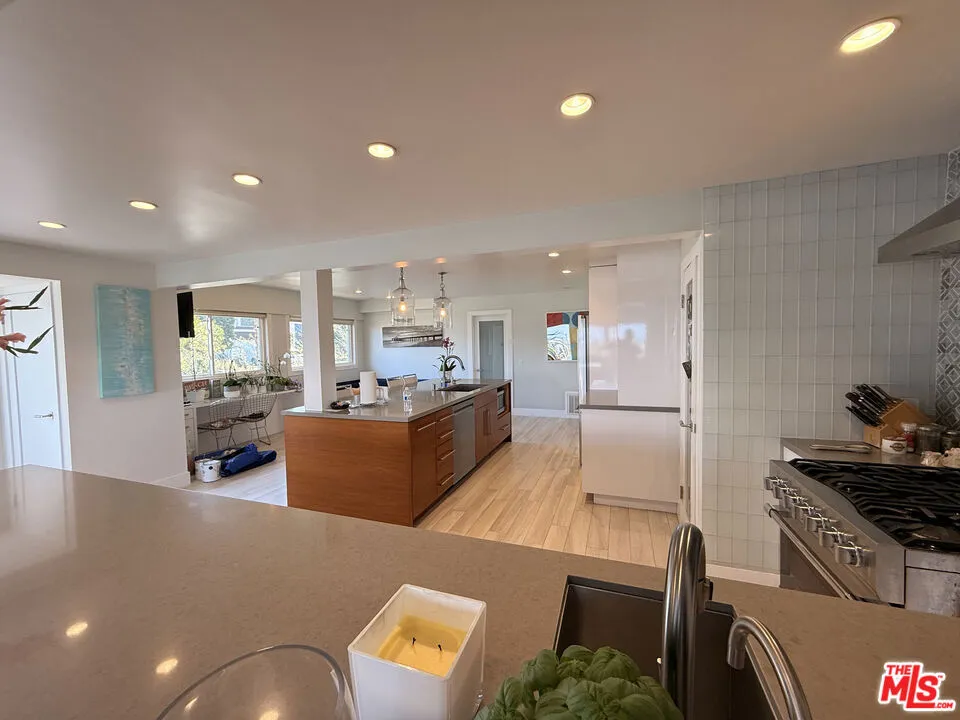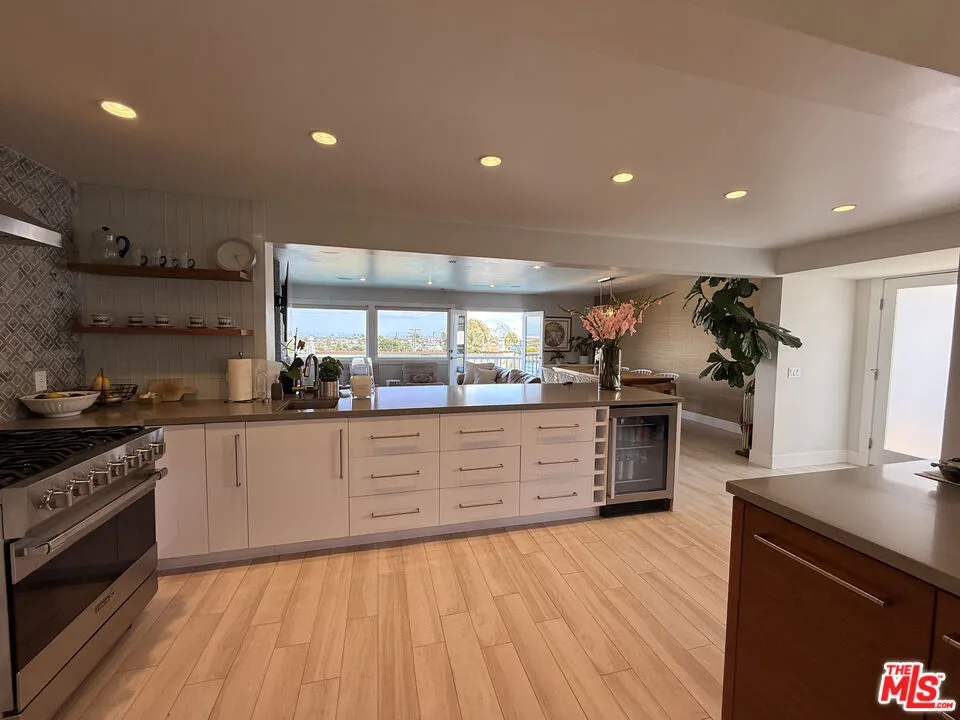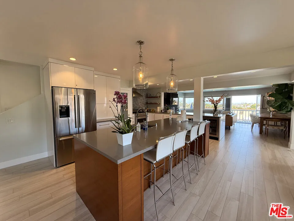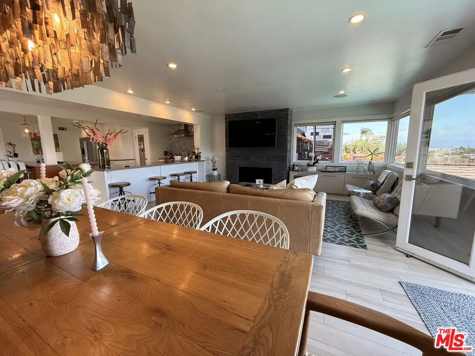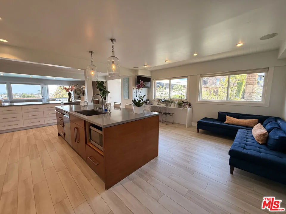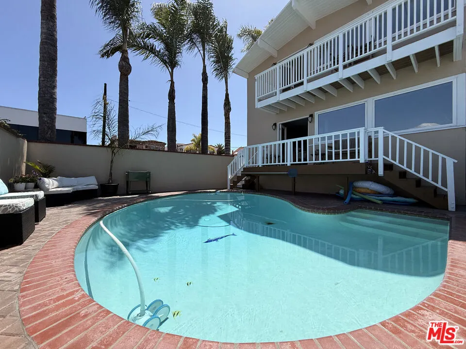Furnished rental in prestigious MB Hill section. Great opportunity near Larsson Park, with access to downtown MB, Gelsons, and south into Hermosa Beach. This four bedroom remodeled home has a spacious open floor plan, with a large great room and full size dining room. The gourmet kitchen has a two large islands, wine fridge, Viking stove and a breakfast area, as this wide open space is the hub of the house. There are two bedrooms and one bath upstairs and two bedrooms down, one with a private bath and a separate powder room. Perched up to command views over the pool and to downtown LA, the home gets great light with 180 degrees of sun, as it faces both East and West. Looking to start June 7th approximately.
