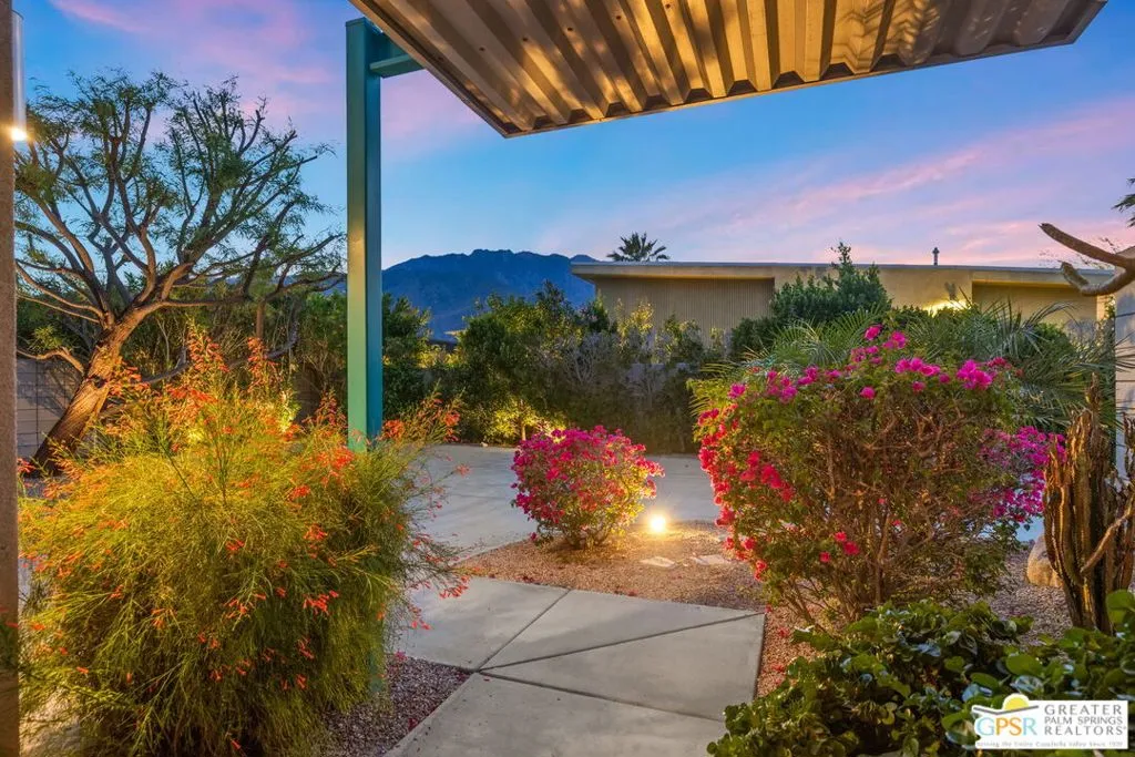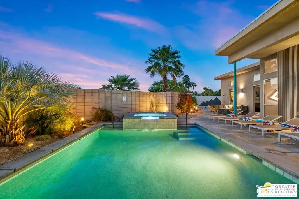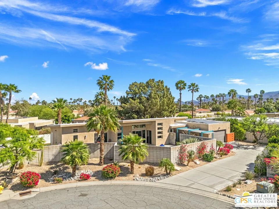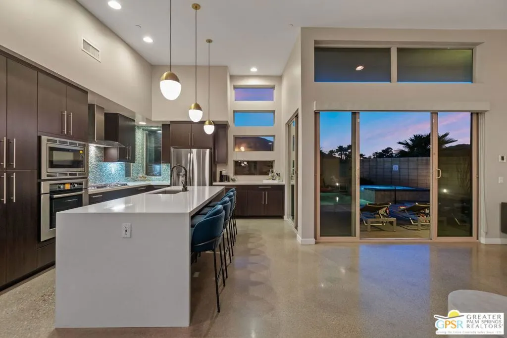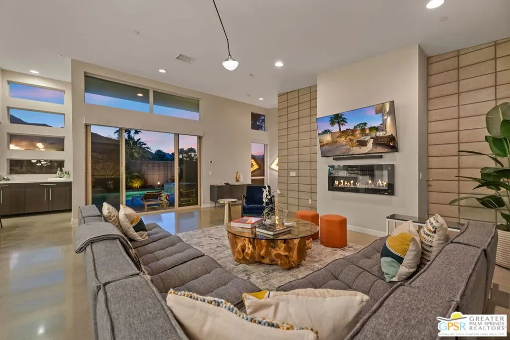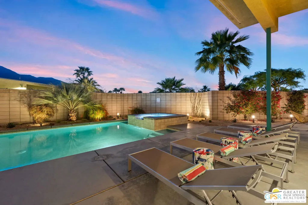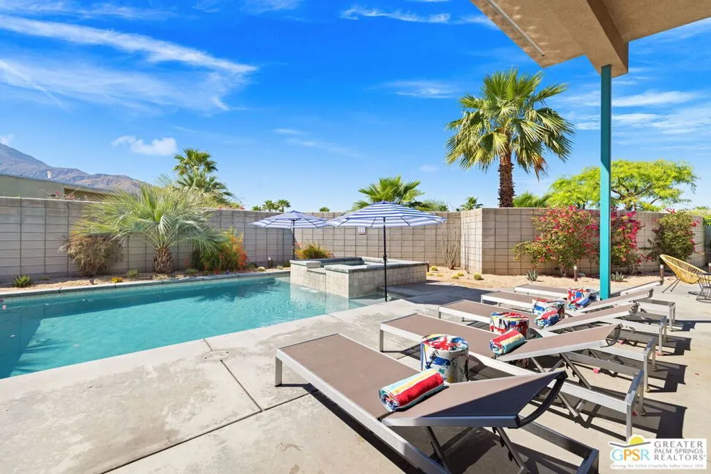 Big views. Bold style. A standout Murano residence positioned at the end of a cul de sac delivers the kind of Palm Springs living people come here for, with excellent short term rental flexibility for investors and part time use. Set on an oversized lot with mountain views, this west facing property pairs clean modern lines with a resort style setting. Vaulted ceilings and polished concrete floors frame a huge open living space anchored by a floating linear fireplace. Expansive glass doors open to the outdoors, creating an easy indoor outdoor connection. The kitchen is a showstopper with an XL quartz waterfall island, bar seating, specialty lighting, and a premium appliance suite including Bosch. The layout offers great separation with two primary suites, including a main retreat that opens to the backyard with a spa style bath featuring soaking tub, walk in shower, dual vanities, and a custom walk in closet, while a third bedroom adds flexibility. Outdoors, the ultra private backyard shines with a heated PebbleTec saltwater pool and spa, piped natural gas fire pit, and outdoor dining under string lights, plus a regulation size bocce court and private pickleball court alongside citrus trees including Pomelo and Meyer lemon. Owned solar with 16 panels, tankless water heater, solar shades, 2 zone HVAC, and a 220 volt EV charging station enhance efficiency. Attached two car garage. NO HOA FEES and Fee Land you own.