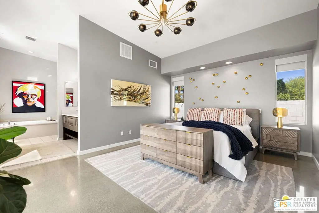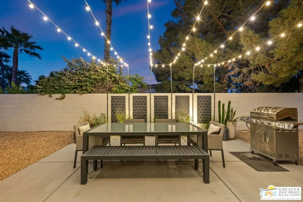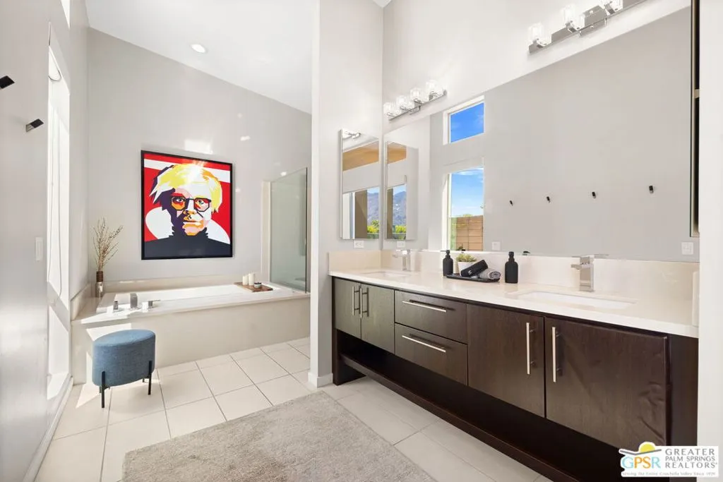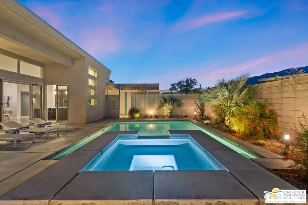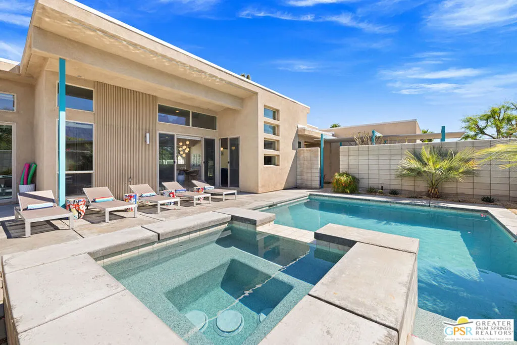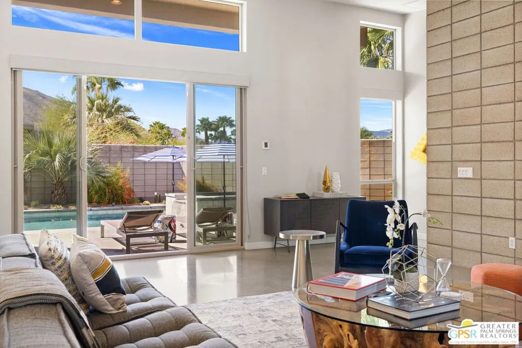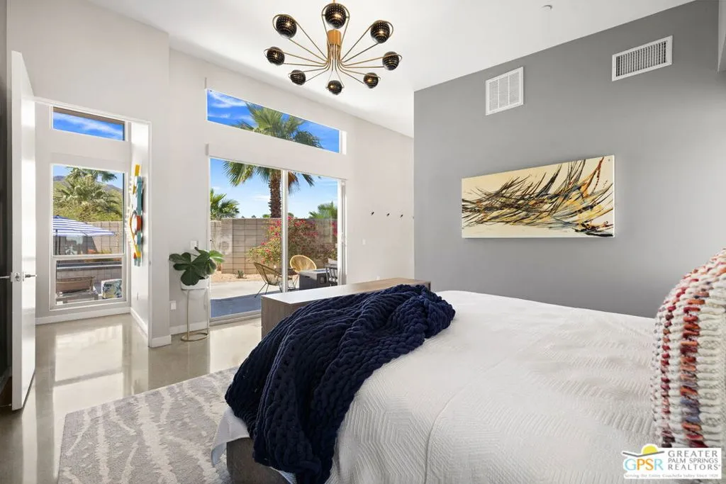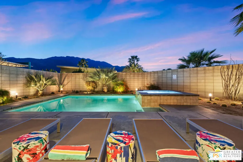 Big views. Bold style. A standout Murano residence positioned at the end of a cul de sac delivers the kind of Palm Springs living people come here for, with excellent short term rental flexibility for investors and part time use. Set on an oversized lot with mountain views, this west facing property pairs clean modern lines with a resort style setting. Vaulted ceilings and polished concrete floors frame a huge open living space anchored by a floating linear fireplace. Expansive glass doors open to the outdoors, creating an easy indoor outdoor connection. The kitchen is a showstopper with an XL quartz waterfall island, bar seating, specialty lighting, and a premium appliance suite including Bosch. The layout offers great separation with two primary suites, including a main retreat that opens to the backyard with a spa style bath featuring soaking tub, walk in shower, dual vanities, and a custom walk in closet, while a third bedroom adds flexibility. Outdoors, the ultra private backyard shines with a heated PebbleTec saltwater pool and spa, piped natural gas fire pit, and outdoor dining under string lights, plus a regulation size bocce court and private pickleball court alongside citrus trees including Pomelo and Meyer lemon. Owned solar with 16 panels, tankless water heater, solar shades, 2 zone HVAC, and a 220 volt EV charging station enhance efficiency. Attached two car garage. NO HOA FEES and Fee Land you own.