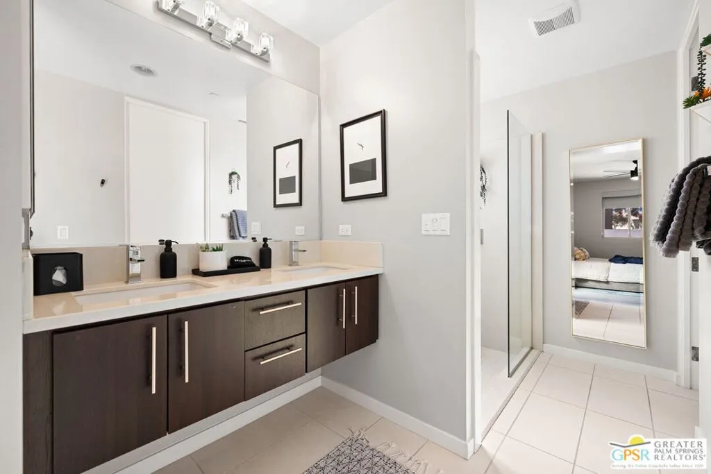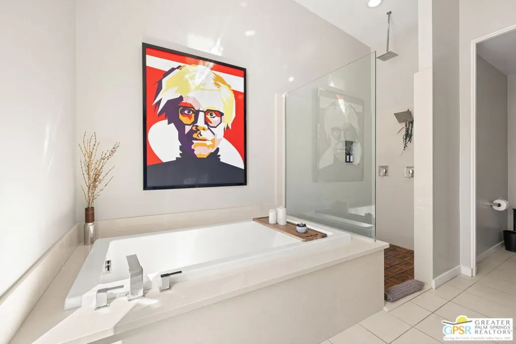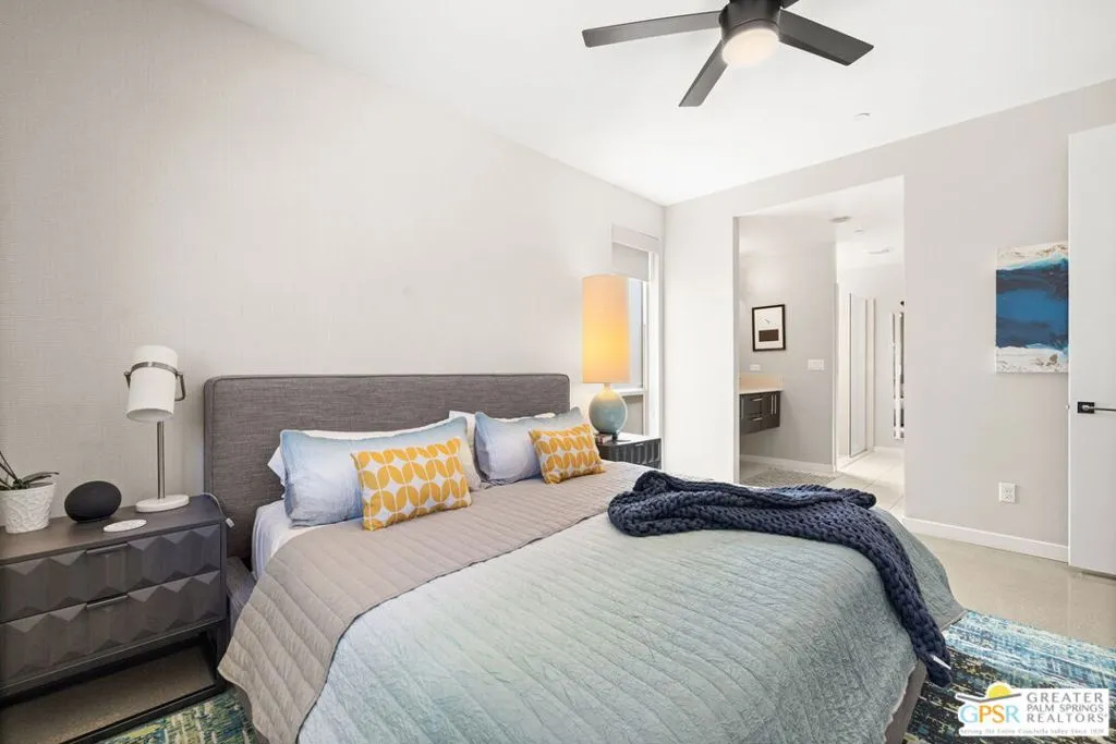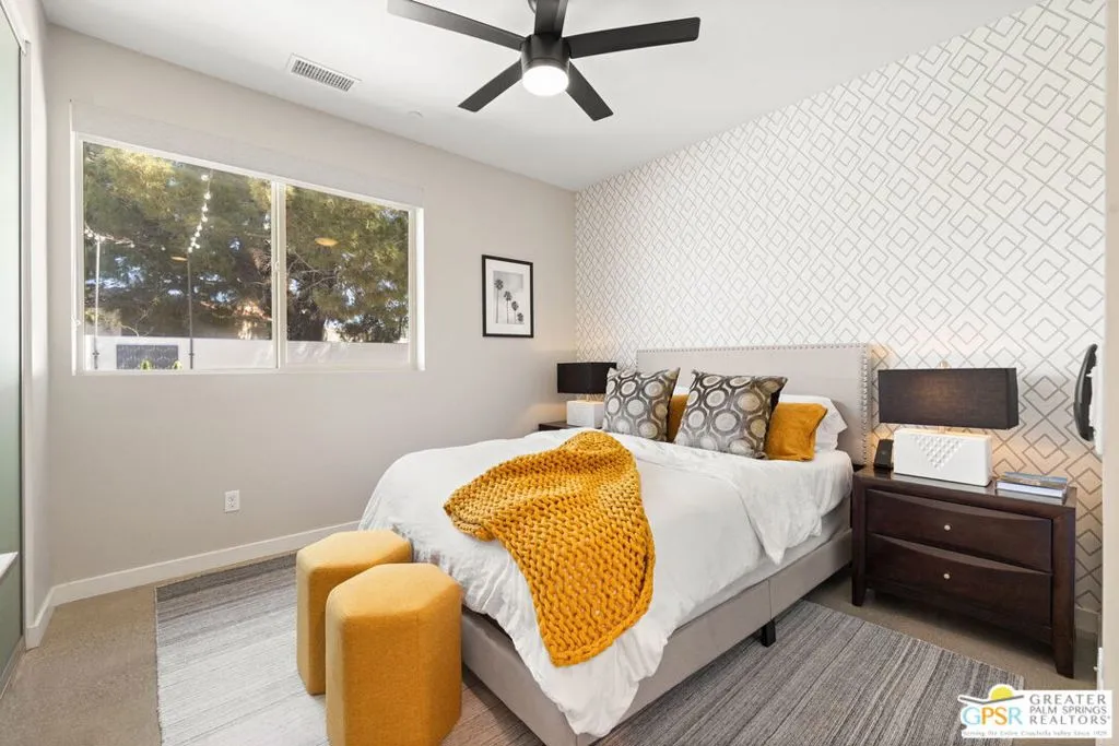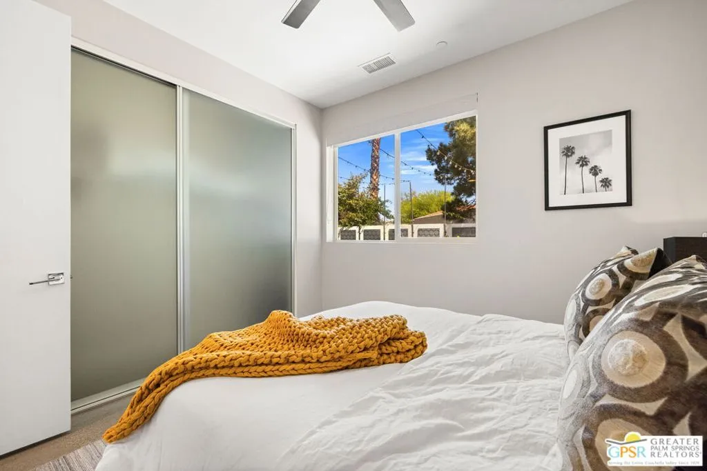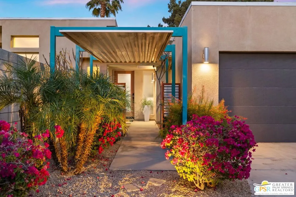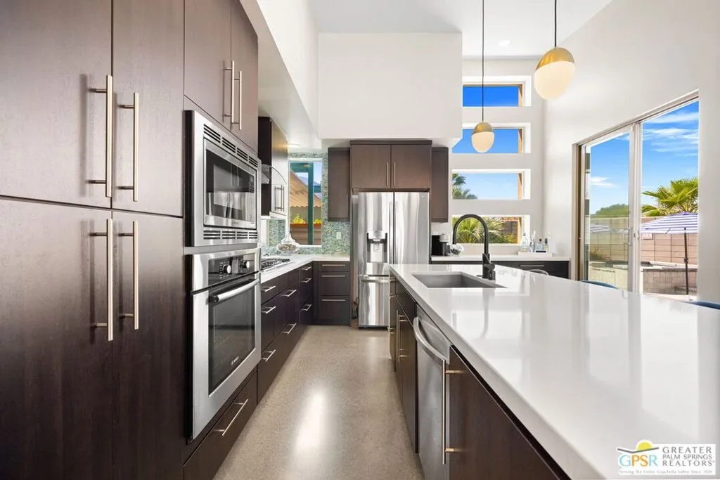 Big views. Bold style. A standout Murano residence positioned at the end of a cul de sac delivers the kind of Palm Springs living people come here for, with excellent short term rental flexibility for investors and part time use. Set on an oversized lot with mountain views, this west facing property pairs clean modern lines with a resort style setting. Vaulted ceilings and polished concrete floors frame a huge open living space anchored by a floating linear fireplace. Expansive glass doors open to the outdoors, creating an easy indoor outdoor connection. The kitchen is a showstopper with an XL quartz waterfall island, bar seating, specialty lighting, and a premium appliance suite including Bosch. The layout offers great separation with two primary suites, including a main retreat that opens to the backyard with a spa style bath featuring soaking tub, walk in shower, dual vanities, and a custom walk in closet, while a third bedroom adds flexibility. Outdoors, the ultra private backyard shines with a heated PebbleTec saltwater pool and spa, piped natural gas fire pit, and outdoor dining under string lights, plus a regulation size bocce court and private pickleball court alongside citrus trees including Pomelo and Meyer lemon. Owned solar with 16 panels, tankless water heater, solar shades, 2 zone HVAC, and a 220 volt EV charging station enhance efficiency. Attached two car garage. NO HOA FEES and Fee Land you own.