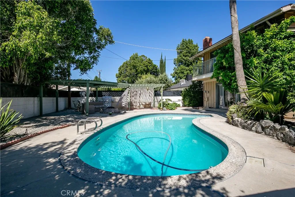 The backyard is an entertainer’s dream, featuring a private pool, a cozy fire pit, and dual pergolas. This low-maintenance paved space is surrounded by a mini-orchard of grapefruit, orange, tangerine, pomegranate, and sugar lemon trees. Additional amenities include a two-car garage with laundry facilities and a dedicated storage building for pool equipment.